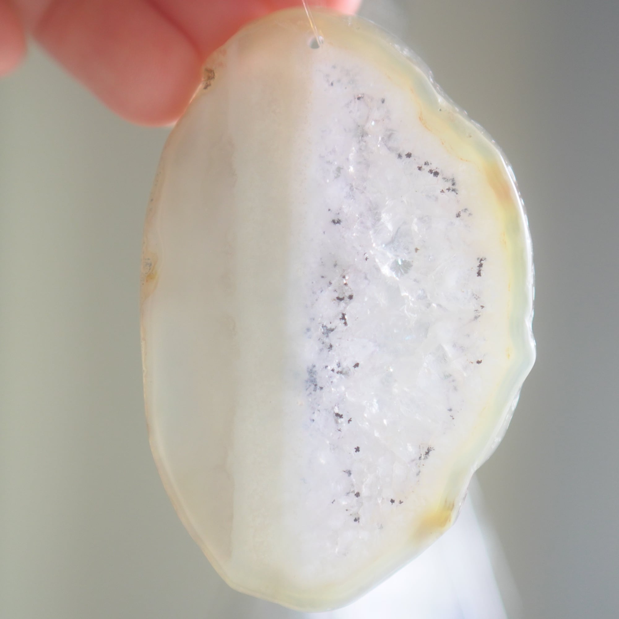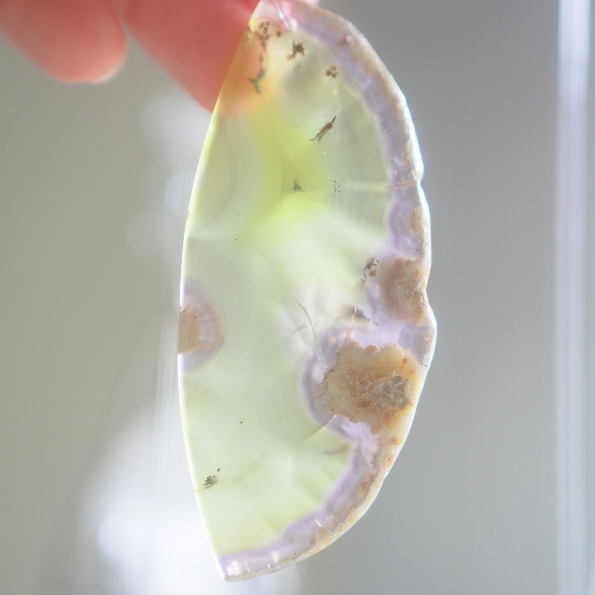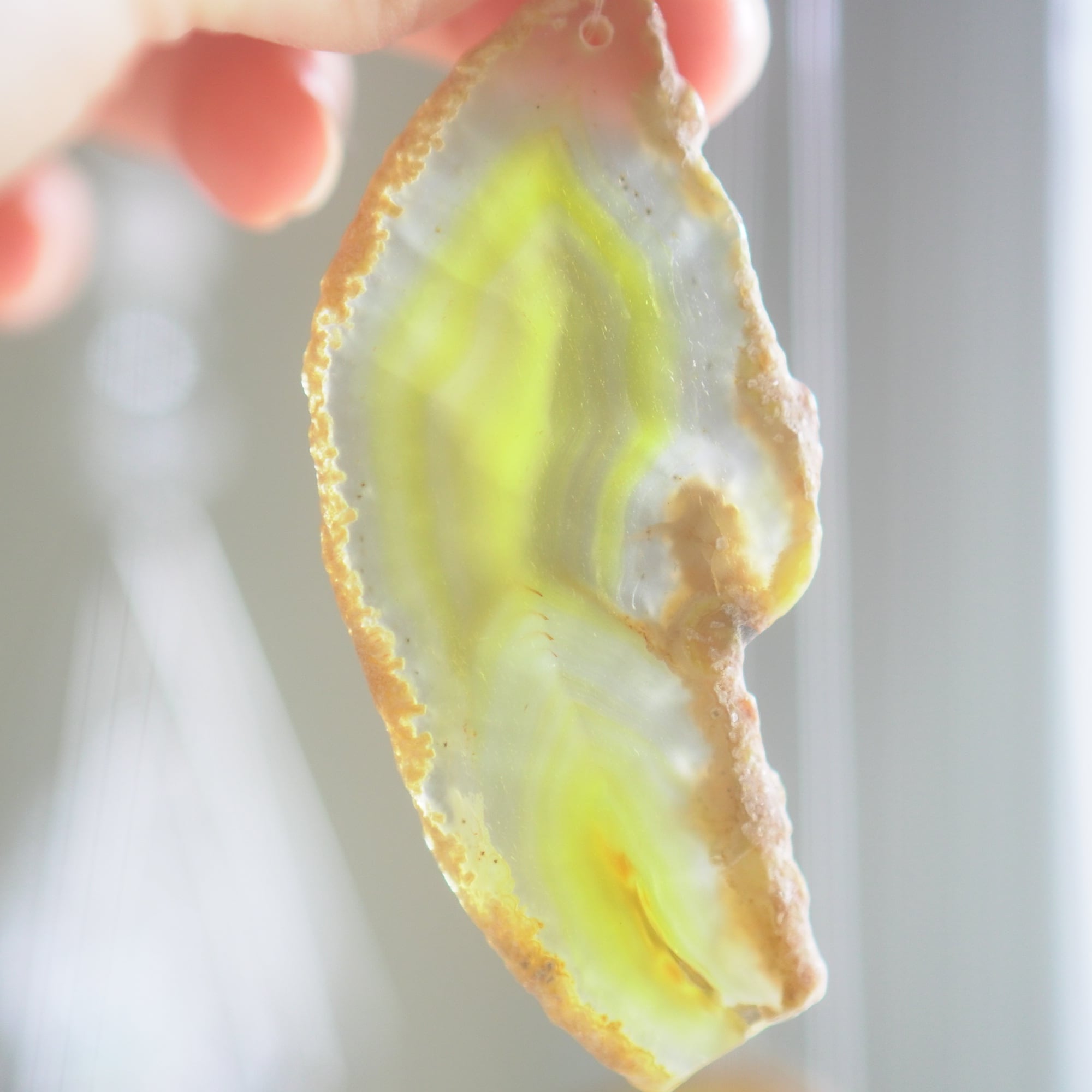 重ねる石同士の側面の加工状態によっても良い音が鳴ったり鳴らなかったり、石の見た目だけで組み合わせを決められないことが難しいポイントでもあるのですが、そんな中、たくさんの石の中から選ばれた5枚のスライスアゲートから出来上がったチャイムたちは、どこか悠々自適に空を泳ぐ妖精のようでもあり、それぞれの音を楽しそうに奏でてくれます。