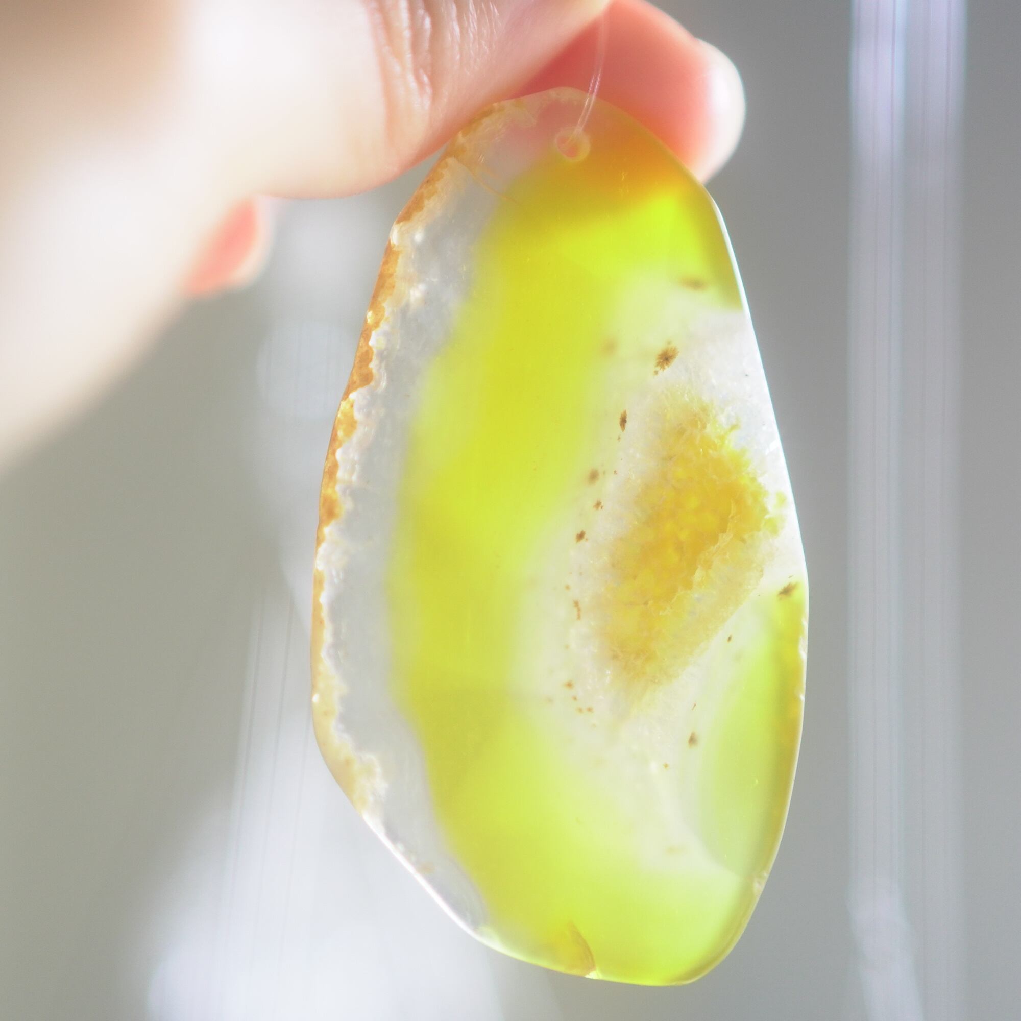 ✧染色の石なので耐光性(光による経年でのカラー変化の耐性)に優れているわけではなくベランダなど一日の中で長時間強い日光に当たるような場所に飾られるのはおすすめしないのですが、陽光に透かした時にだけ真価を発揮する美しさがありますので、是非、時折翳したりして光と一緒にお楽しみいただけたらと思います。特に濃い鮮やかな色など、色変化が気になられる場合は、日光のあまり当たらない場所に飾ってくださいね✧