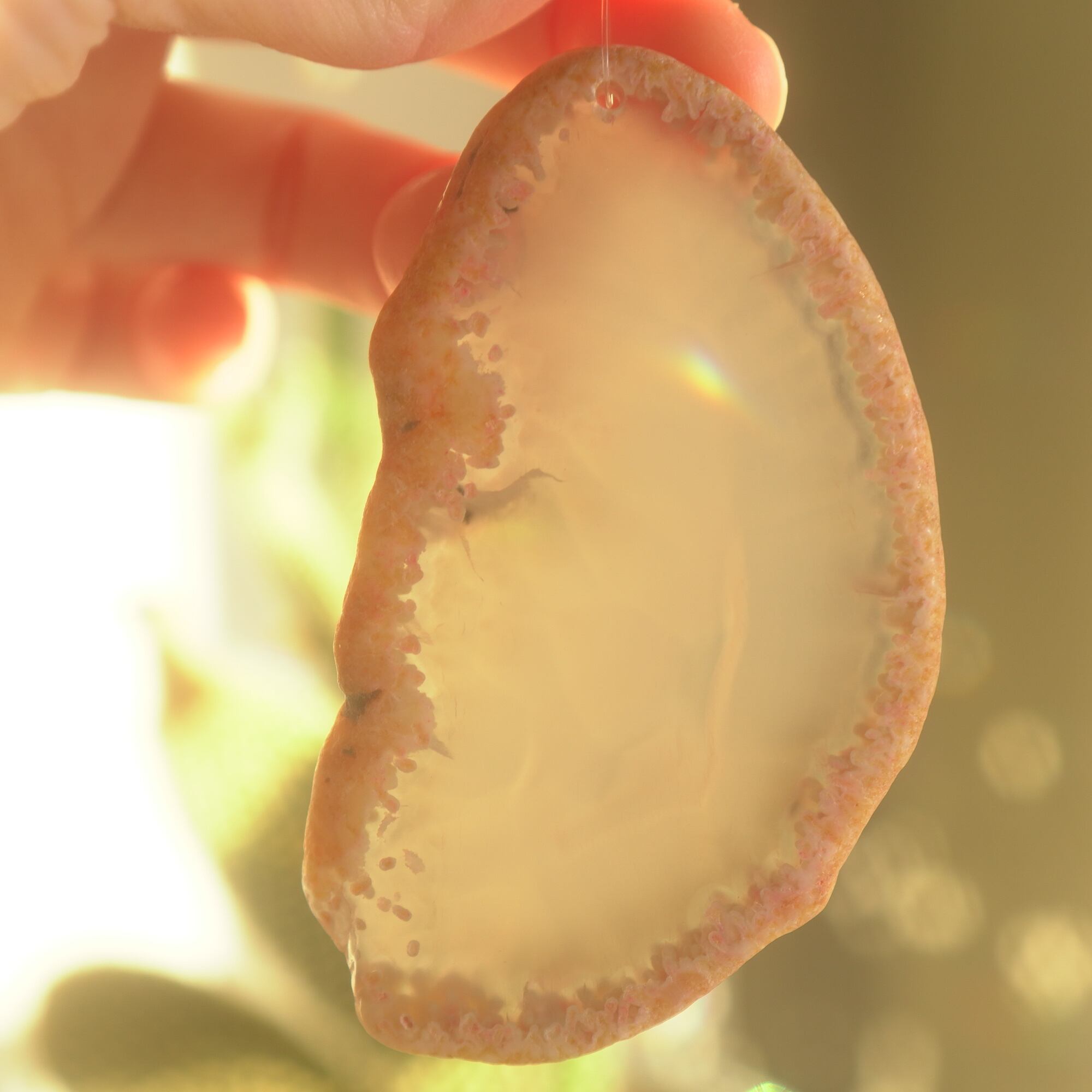 重ねる石同士の側面の加工状態によっても良い音が鳴ったり鳴らなかったり、石の見た目だけで組み合わせを決められないことが難しいポイントでもあるのですが、そんな中、たくさんの石の中から選ばれた5枚のスライスアゲートから出来上がったチャイムたちは、どこか悠々自適に空を泳ぐ妖精のようでもあり、それぞれの音を楽しそうに奏でてくれます。