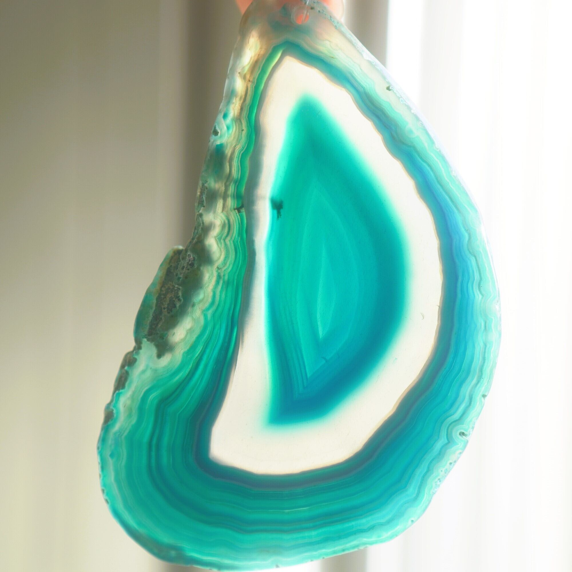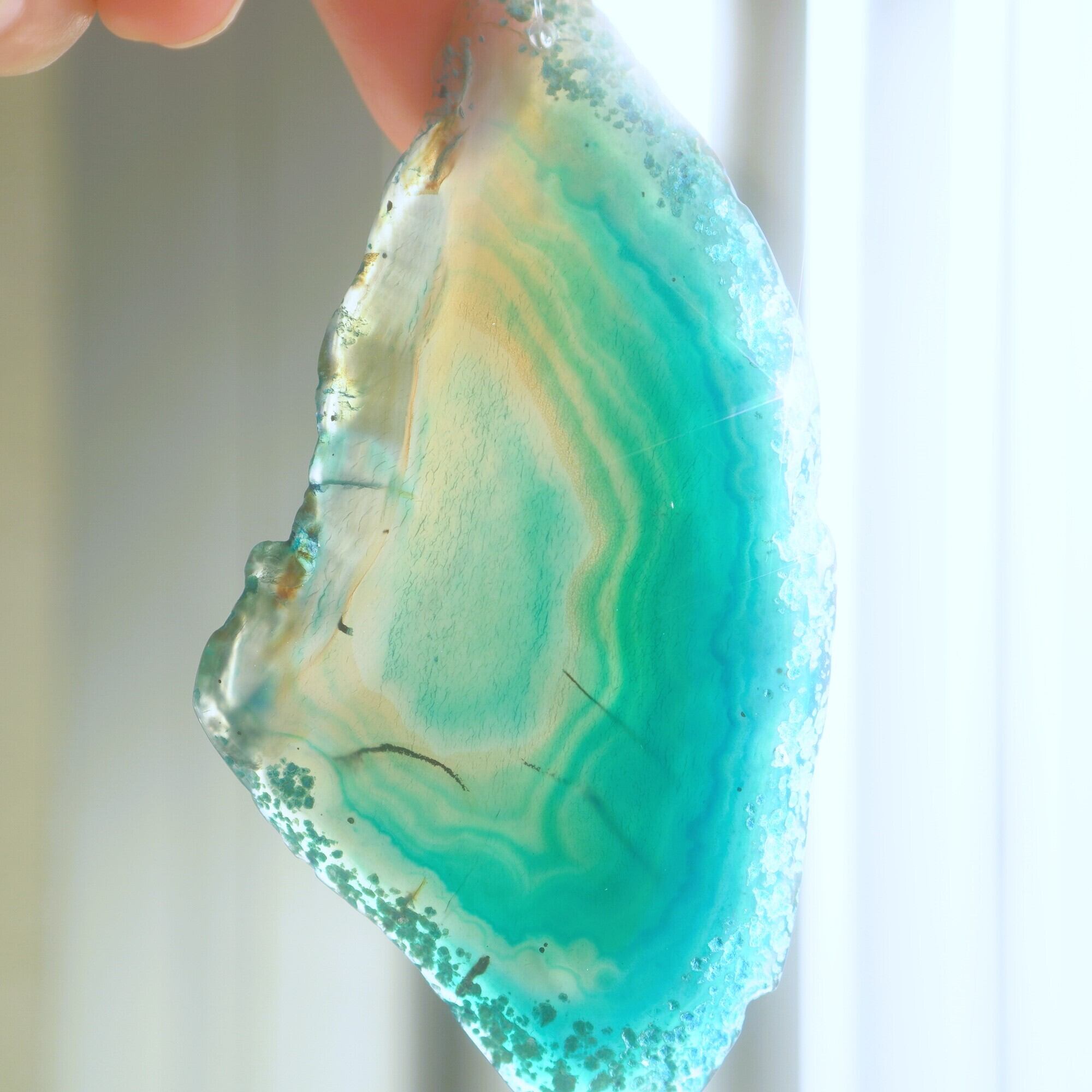 ✧染色の石なので耐光性(光による経年でのカラー変化の耐性)に優れているわけではなくベランダなど一日の中で長時間強い日光に当たるような場所に飾られるのはおすすめしないのですが、陽光に透かした時にだけ真価を発揮する美しさがありますので、是非、時折翳したりして光と一緒にお楽しみいただけたらと思います。特に濃い鮮やかな色など、色変化が気になられる場合は、日光のあまり当たらない場所に飾ってくださいね✧