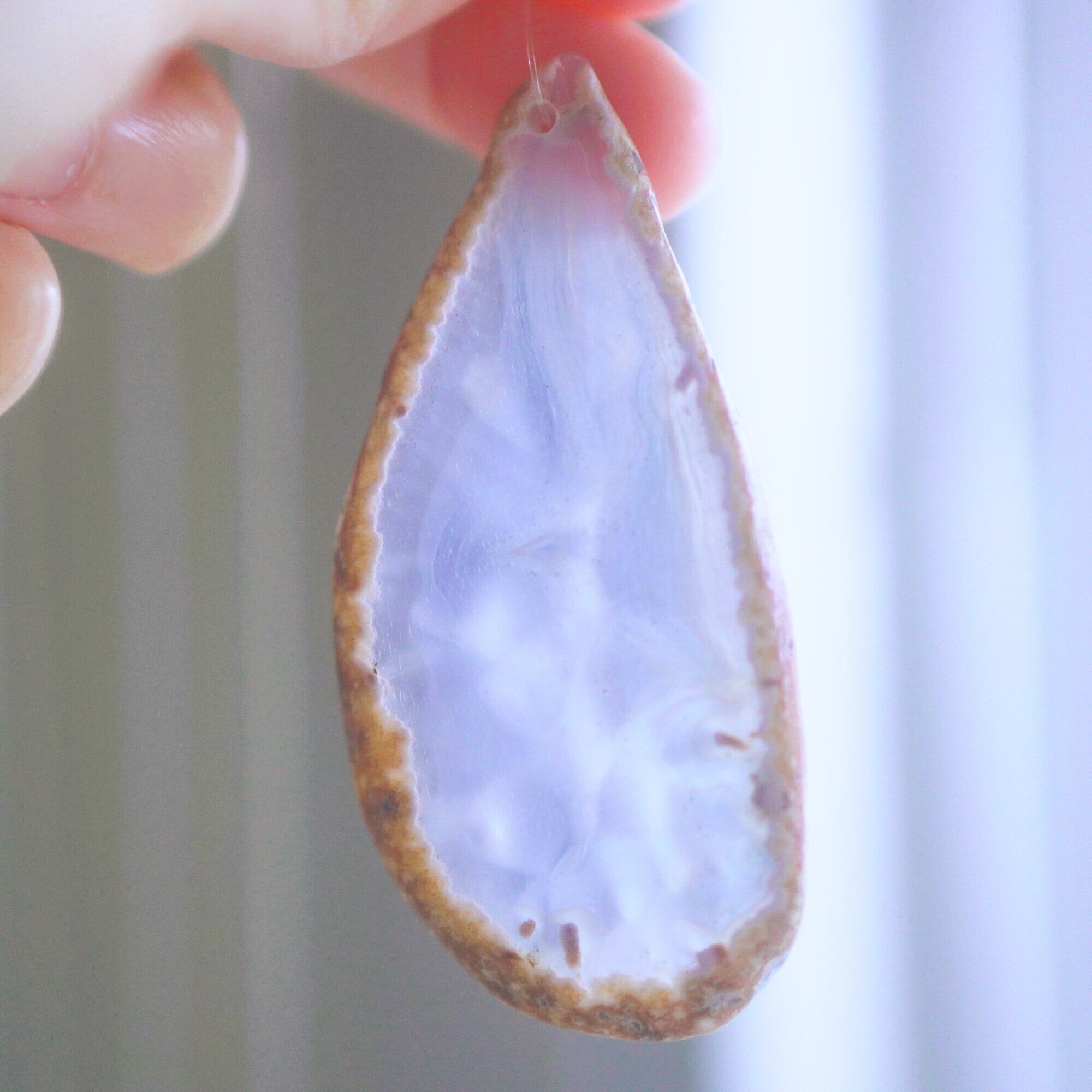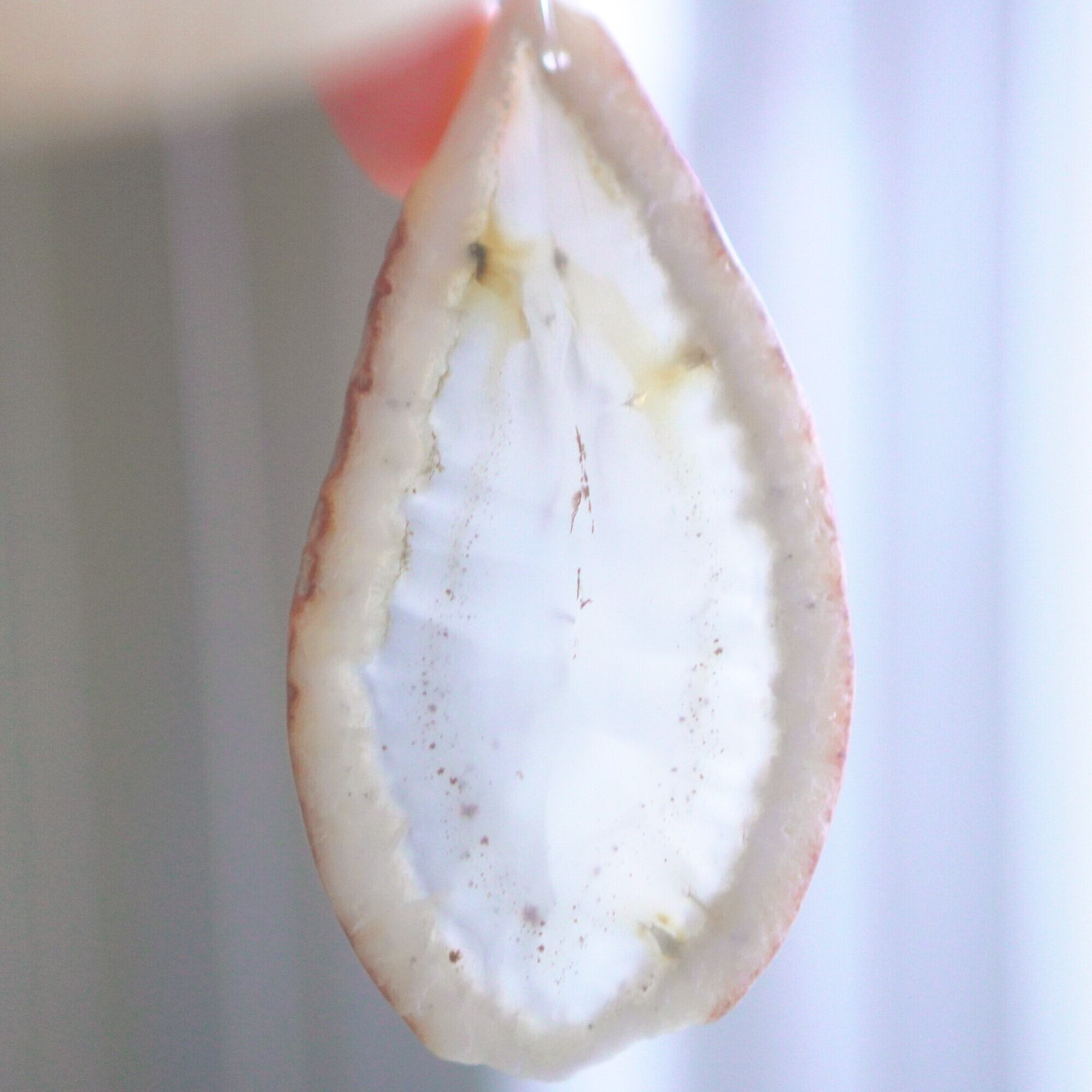 重ねる石同士の側面の加工状態によっても良い音が鳴ったり鳴らなかったり、石の見た目だけで組み合わせを決められないことが難しいポイントでもあるのですが、そんな中、たくさんの石の中から選ばれた5枚のスライスアゲートから出来上がったチャイムたちは、どこか悠々自適に空を泳ぐ妖精のようでもあり、それぞれの音を楽しそうに奏でてくれます。