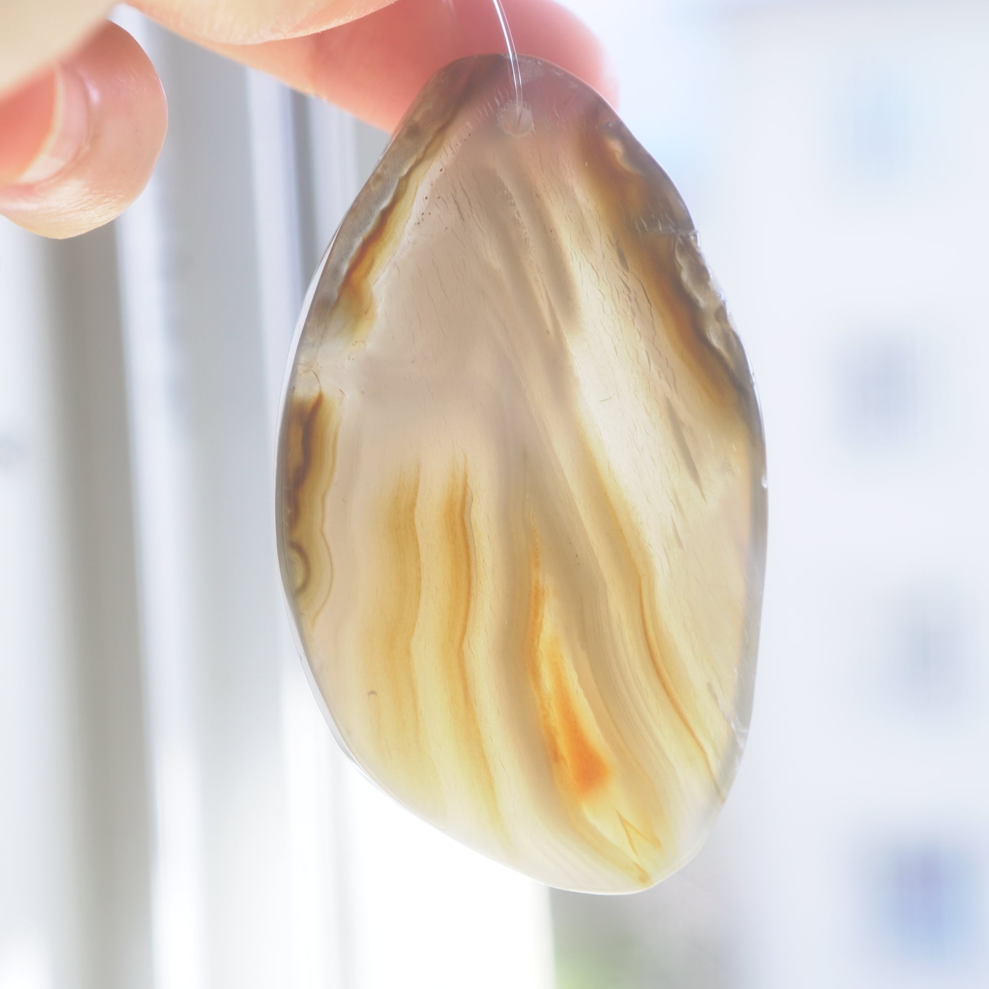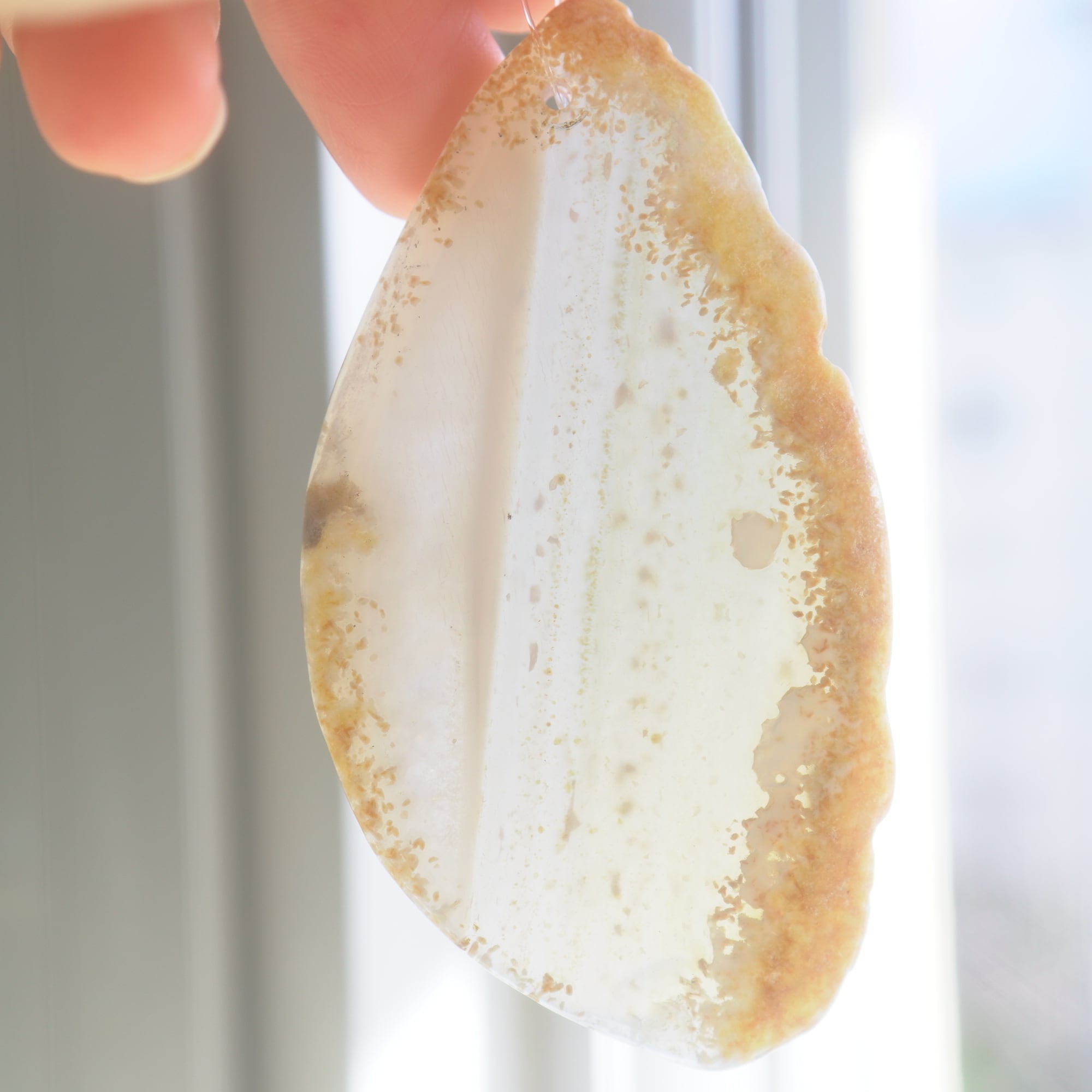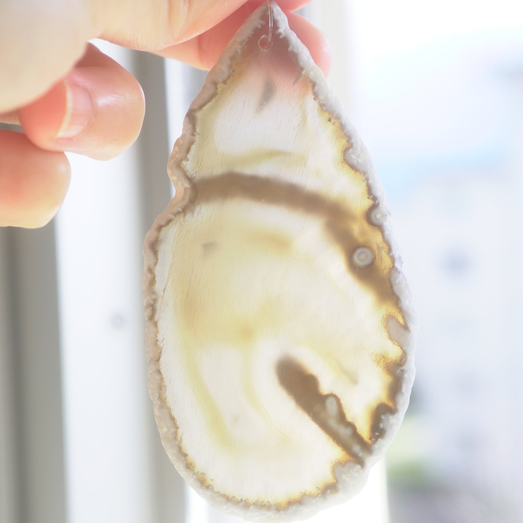重ねる石同士の側面の加工状態によっても良い音が鳴ったり鳴らなかったり、石の見た目だけで組み合わせを決められないことが難しいポイントでもあるのですが、そんな中、たくさんの石の中から選ばれた5枚のスライスアゲートから出来上がったチャイムたちは、どこか悠々自適に空を泳ぐ妖精のようでもあり、それぞれの音を楽しそうに奏でてくれます。