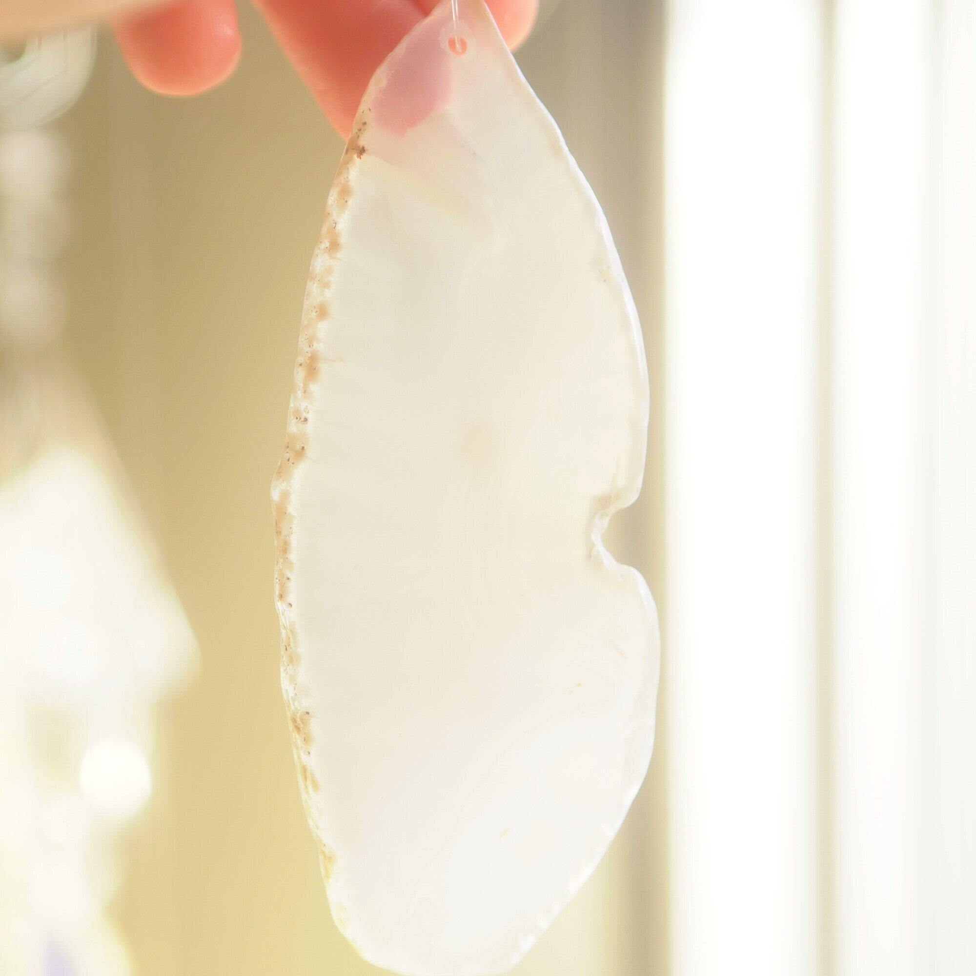 元々の瑪瑙風鈴とは使っている石の大きさや厚みが異なり、こちらのものはそれ同士重ねるだけでは特別音が鳴らない厚さのスライスアゲートを使用しているのですが、間に2本、細長い形状のアゲートを挟むことによって音が鳴る仕組みになっています。(もう少し変則的な組み合わせ方で音が鳴っていることもあります)