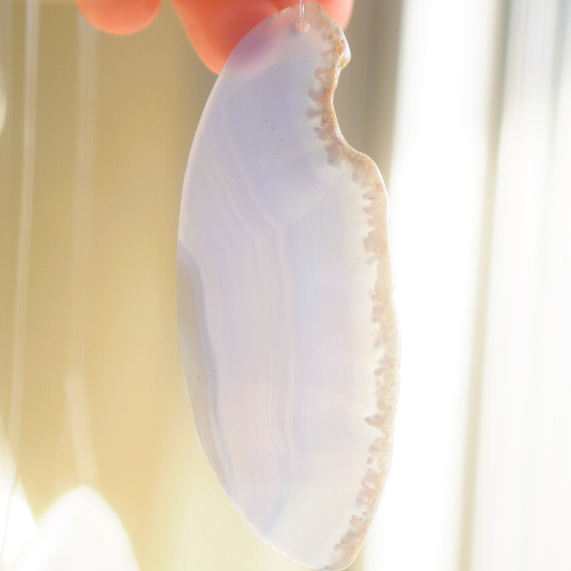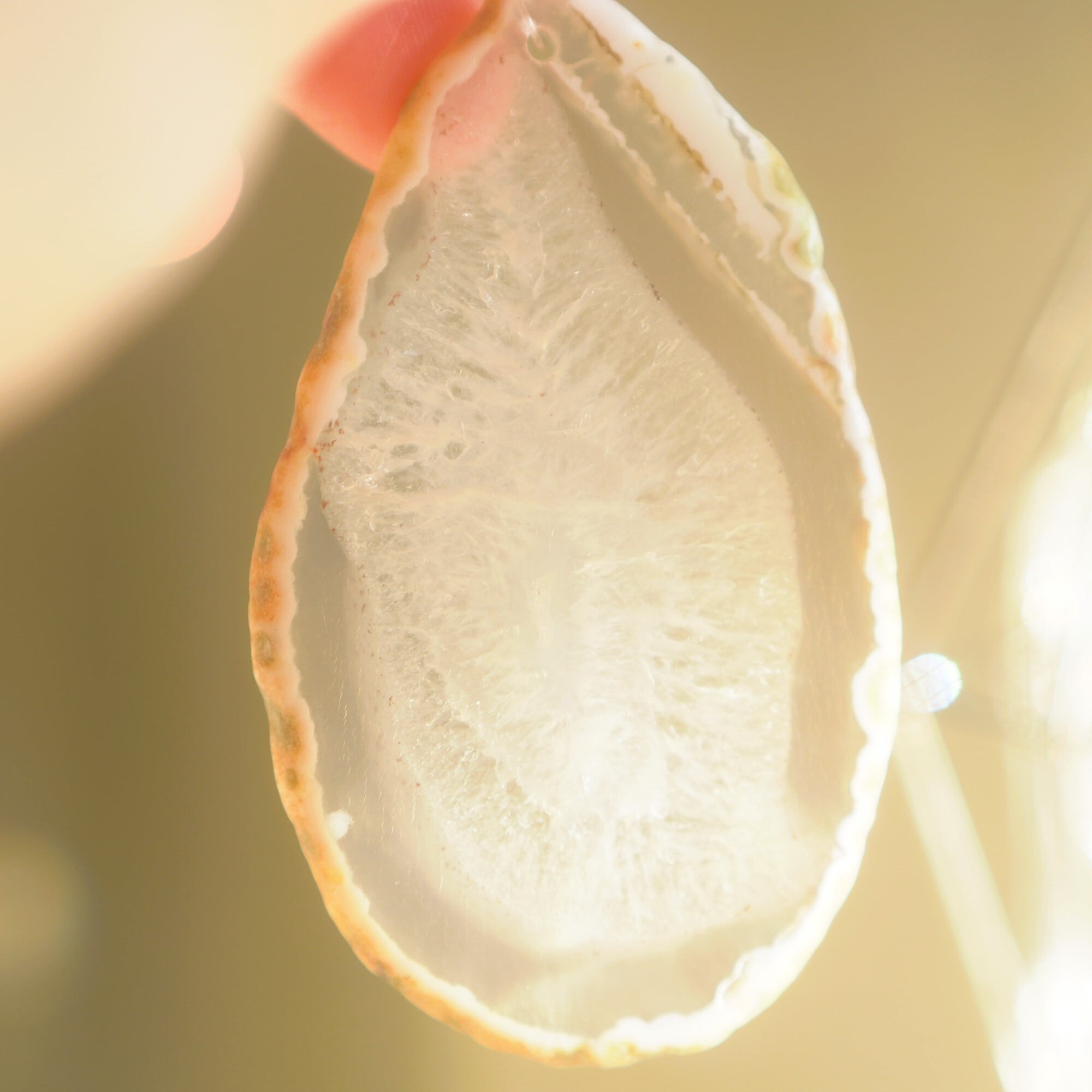 重ねる石同士の側面の加工状態によっても良い音が鳴ったり鳴らなかったり、石の見た目だけで組み合わせを決められないことが難しいポイントでもあるのですが、そんな中、たくさんの石の中から選ばれた5枚のスライスアゲートから出来上がったチャイムたちは、どこか悠々自適に空を泳ぐ妖精のようでもあり、それぞれの音を楽しそうに奏でてくれます。