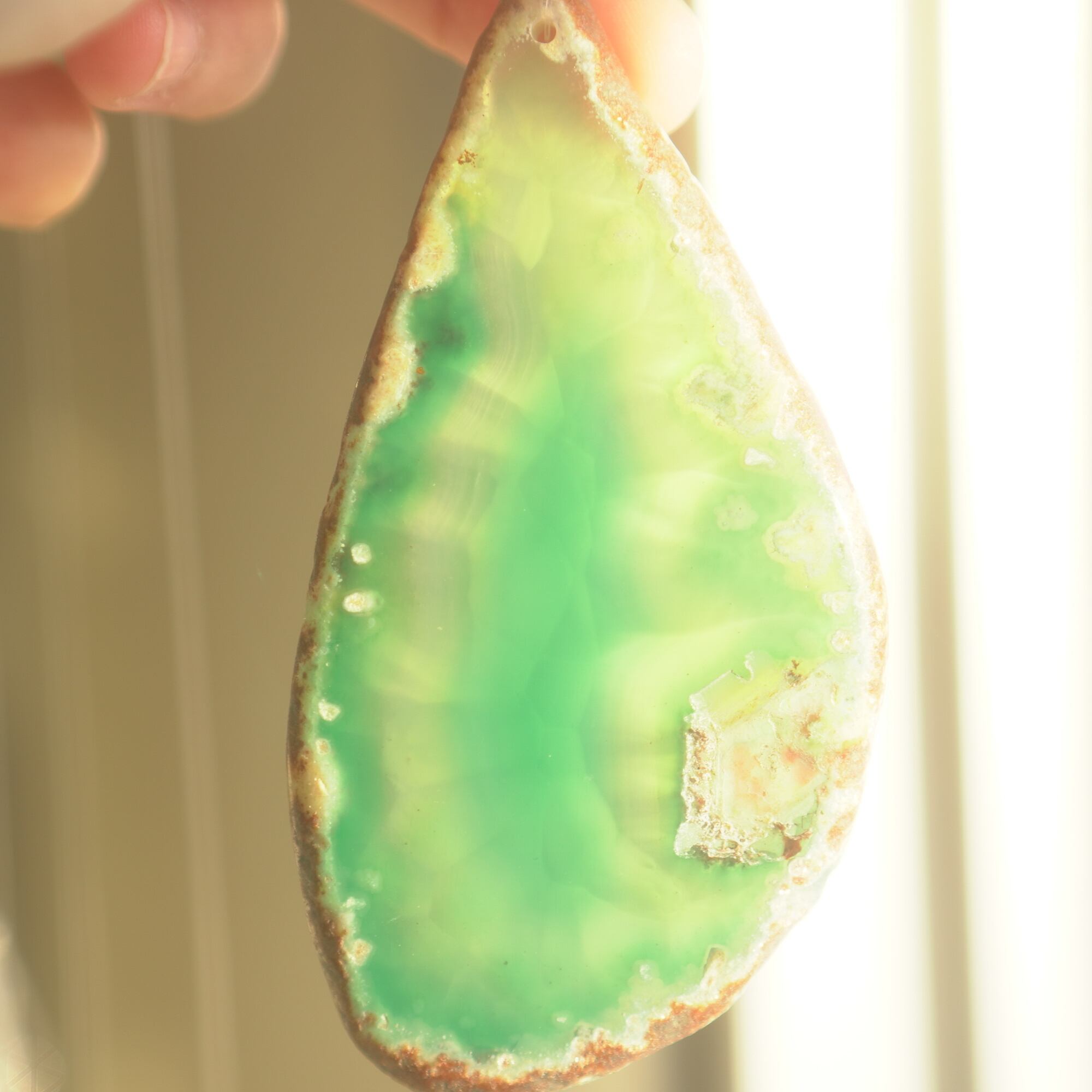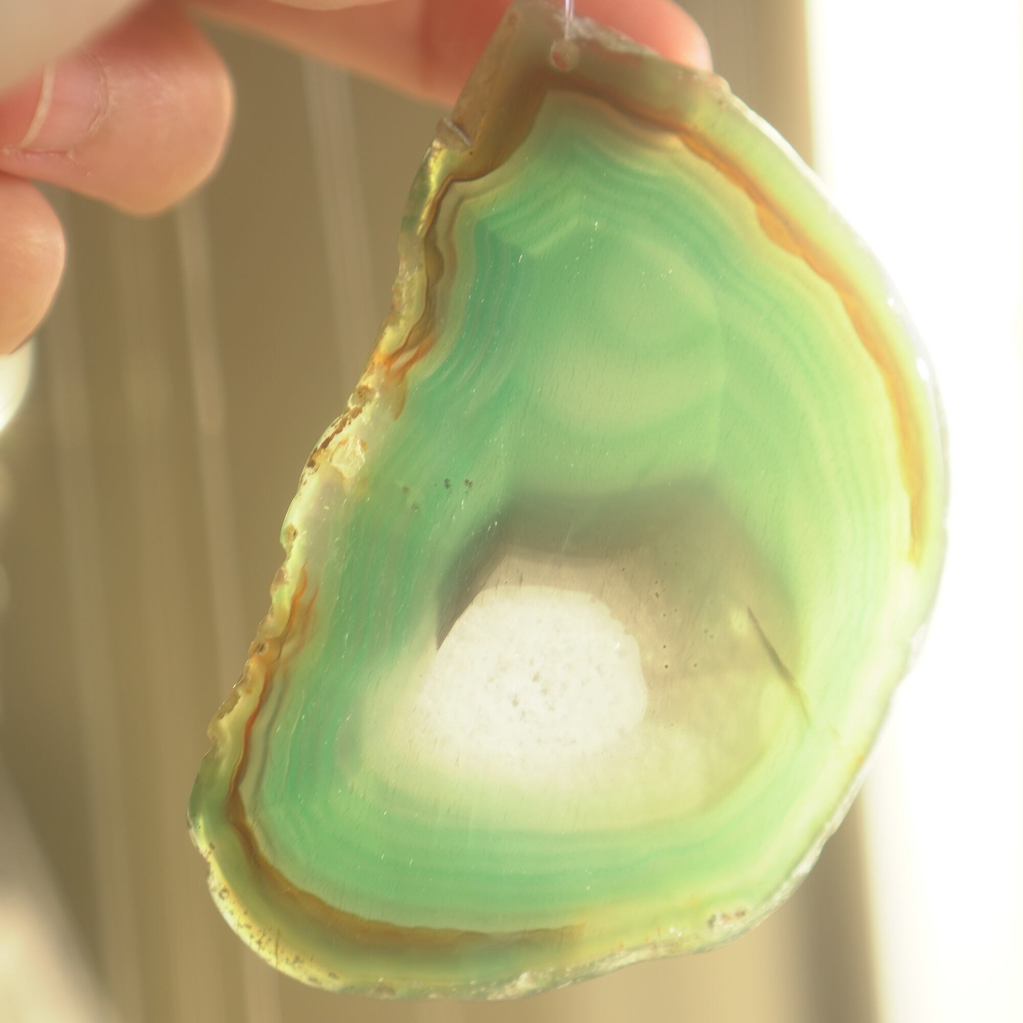 ✧染色の石なので耐光性(光による経年でのカラー変化の耐性)に優れているわけではなくベランダなど一日の中で長時間強い日光に当たるような場所に飾られるのはおすすめしないのですが、陽光に透かした時にだけ真価を発揮する美しさがありますので、是非、時折翳したりして光と一緒にお楽しみいただけたらと思います。特に濃い鮮やかな色など、色変化が気になられる場合は、日光のあまり当たらない場所に飾ってくださいね✧