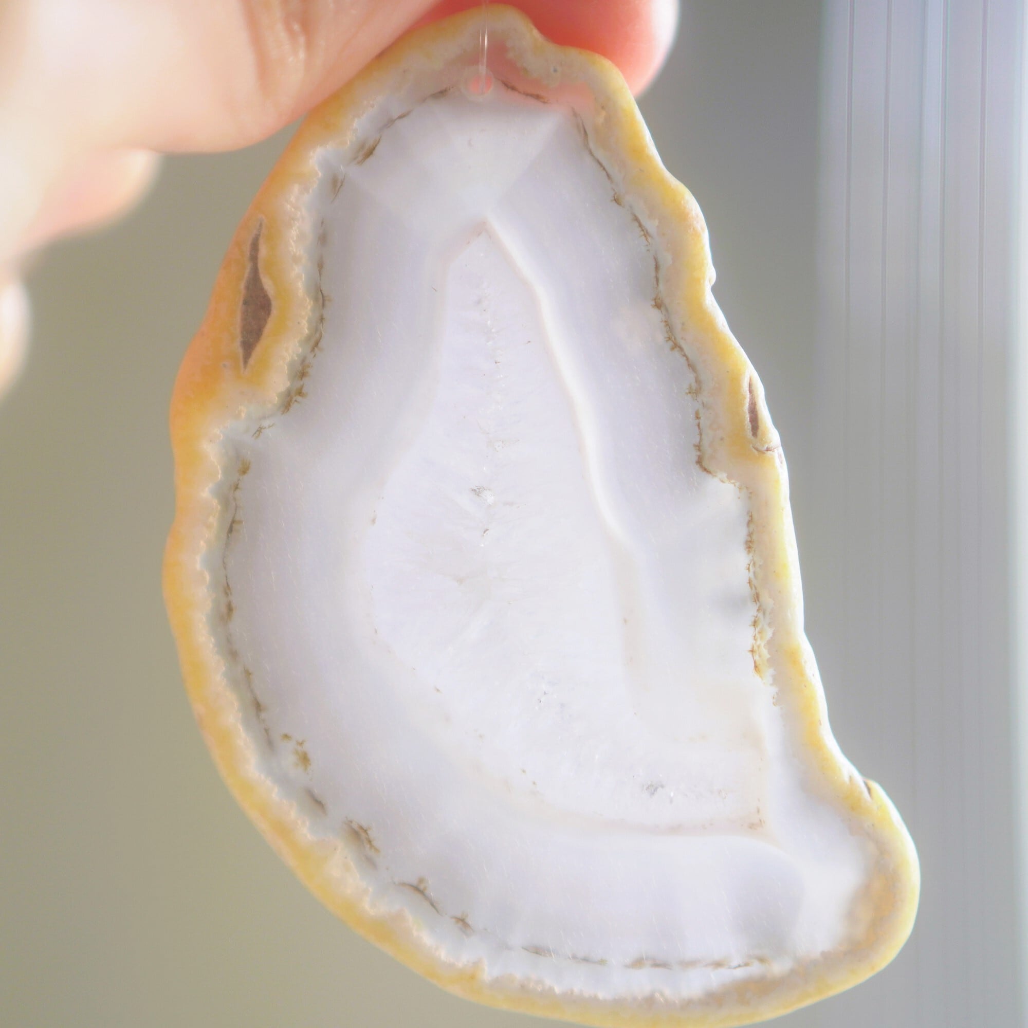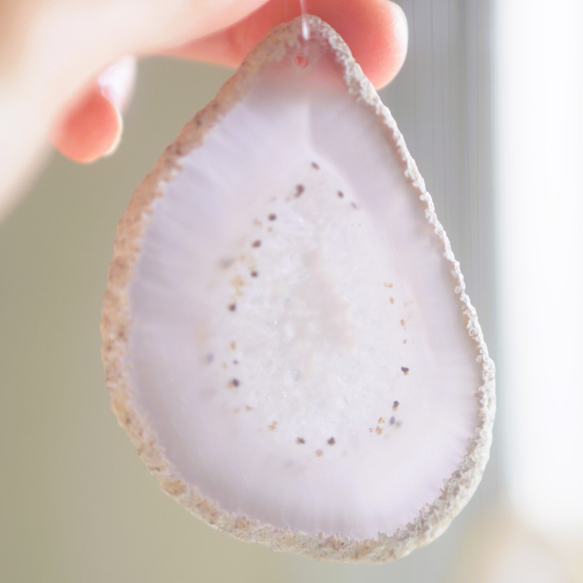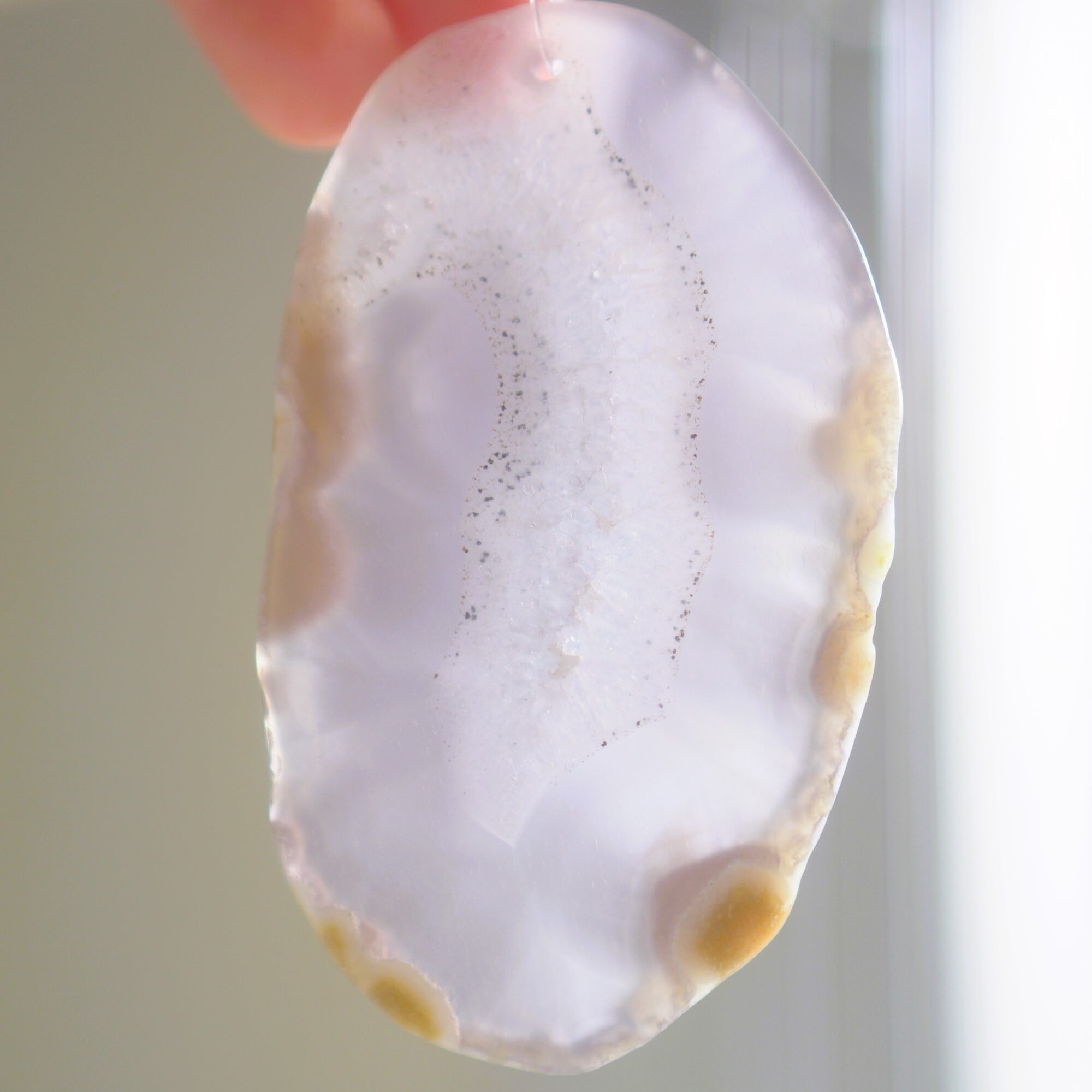 重ねる石同士の側面の加工状態によっても良い音が鳴ったり鳴らなかったり、石の見た目だけで組み合わせを決められないことが難しいポイントでもあるのですが、そんな中、たくさんの石の中から選ばれた5枚のスライスアゲートから出来上がったチャイムたちは、どこか悠々自適に空を泳ぐ妖精のようでもあり、それぞれの音を楽しそうに奏でてくれます。