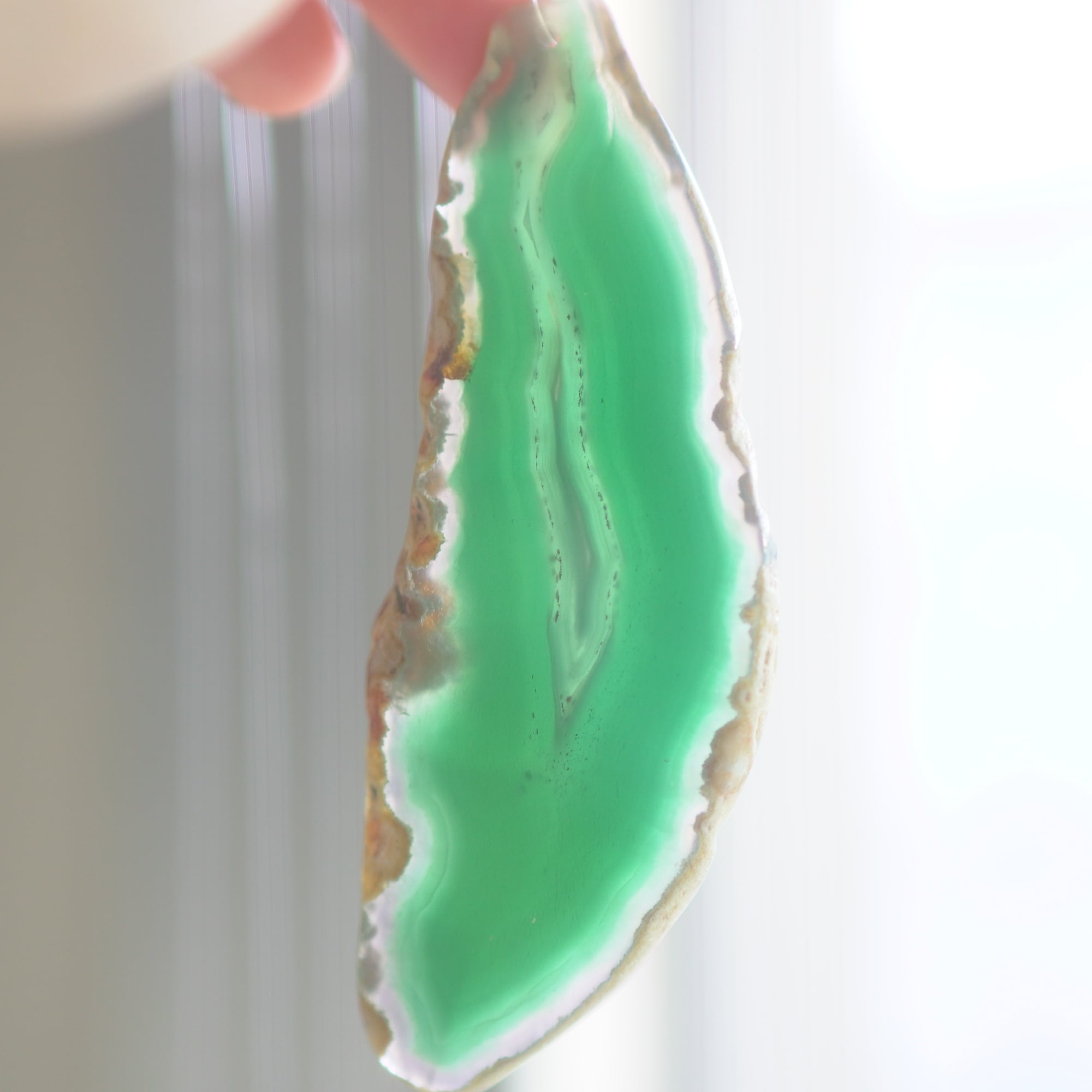 ✧染色の石なので耐光性(光による経年でのカラー変化の耐性)に優れているわけではなくベランダなど一日の中で長時間強い日光に当たるような場所に飾られるのはおすすめしないのですが、陽光に透かした時にだけ真価を発揮する美しさがありますので、是非、時折翳したりして光と一緒にお楽しみいただけたらと思います。特に濃い鮮やかな色など、色変化が気になられる場合は、日光のあまり当たらない場所に飾ってくださいね✧