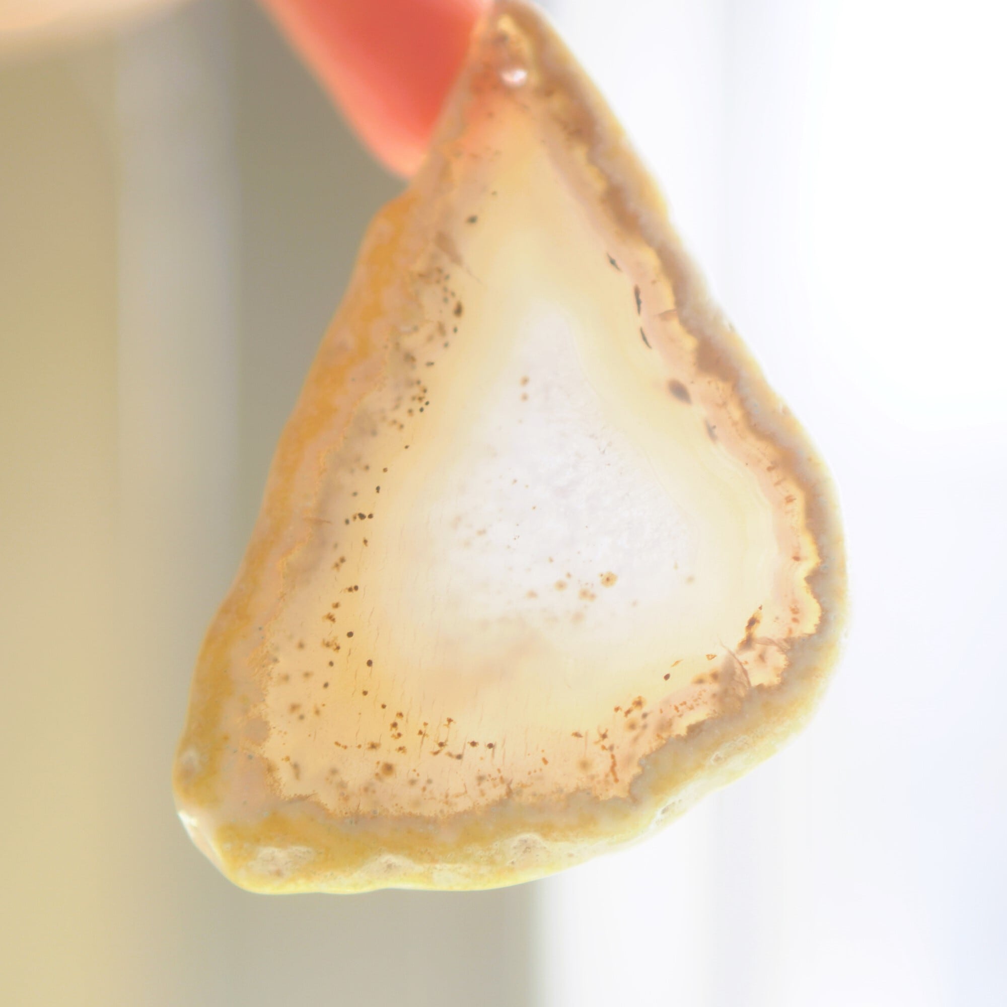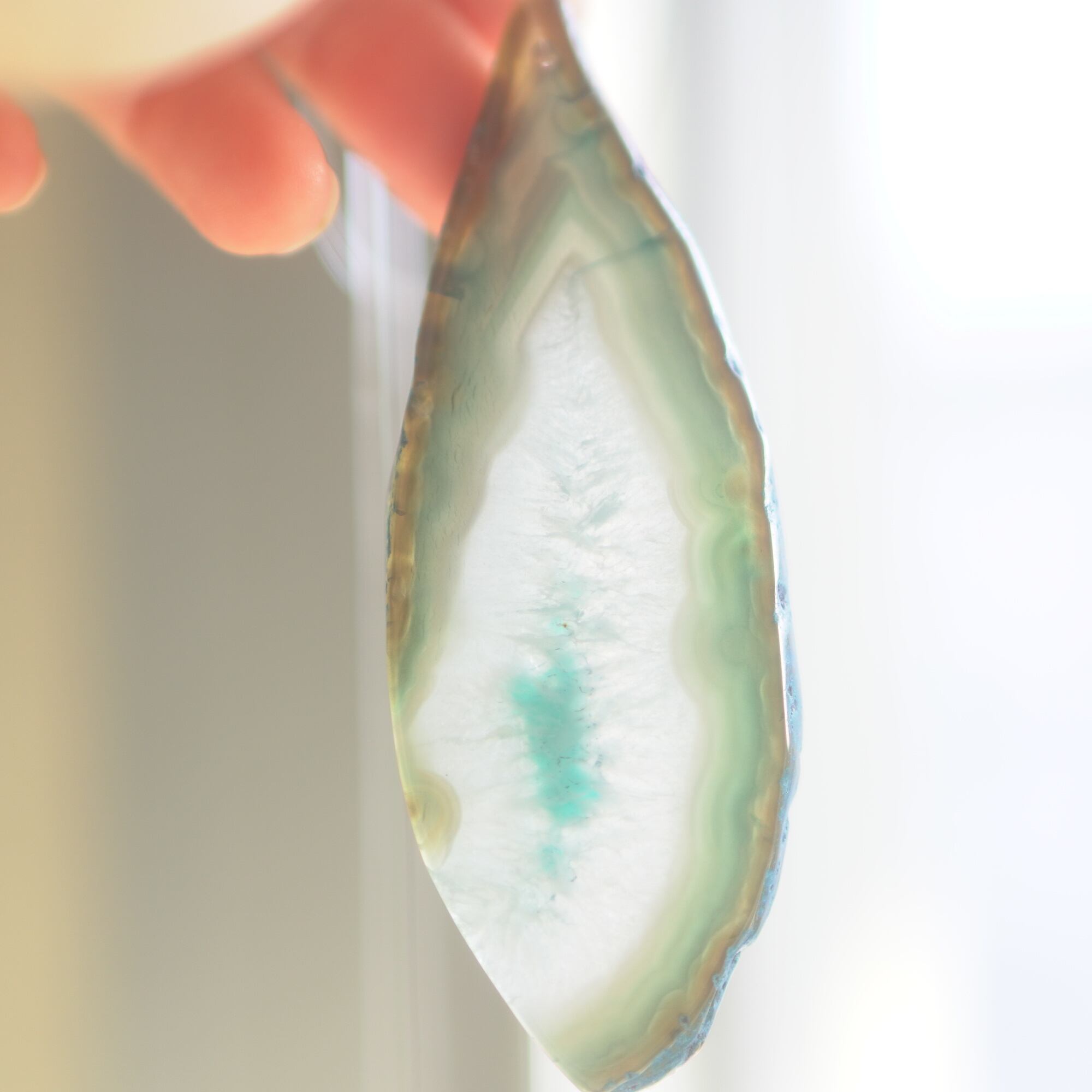 重ねる石同士の側面の加工状態によっても良い音が鳴ったり鳴らなかったり、石の見た目だけで組み合わせを決められないことが難しいポイントでもあるのですが、そんな中、たくさんの石の中から選ばれた5枚のスライスアゲートから出来上がったチャイムたちは、どこか悠々自適に空を泳ぐ妖精のようでもあり、それぞれの音を楽しそうに奏でてくれます。