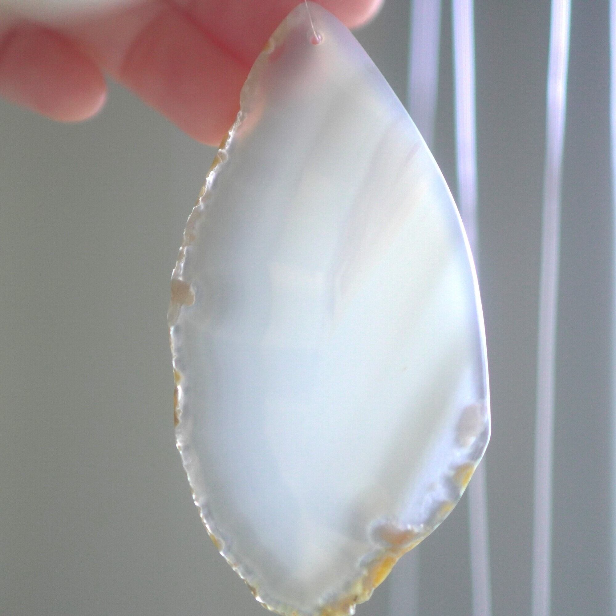 元々の瑪瑙風鈴とは使っている石の大きさや厚みが異なり、こちらのものはそれ同士重ねるだけでは特別音が鳴らない厚さのスライスアゲートを使用しているのですが、間に2本、細長い形状のアゲートを挟むことによって音が鳴る仕組みになっています。(もう少し変則的な組み合わせ方で音が鳴っていることもあります)