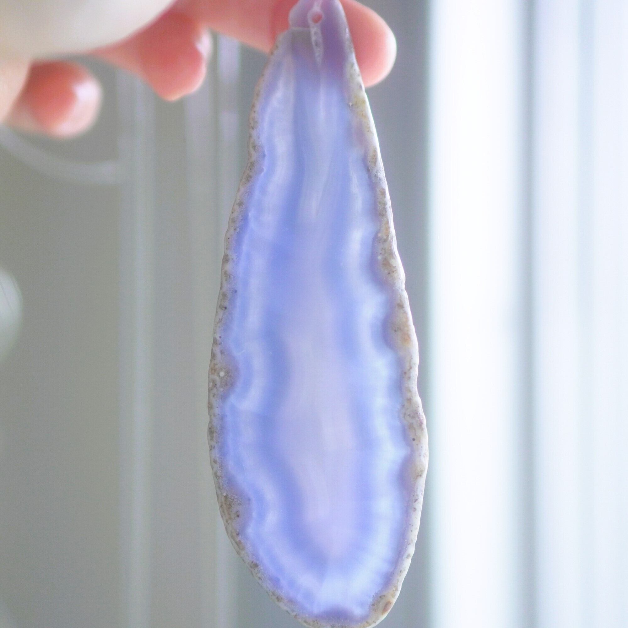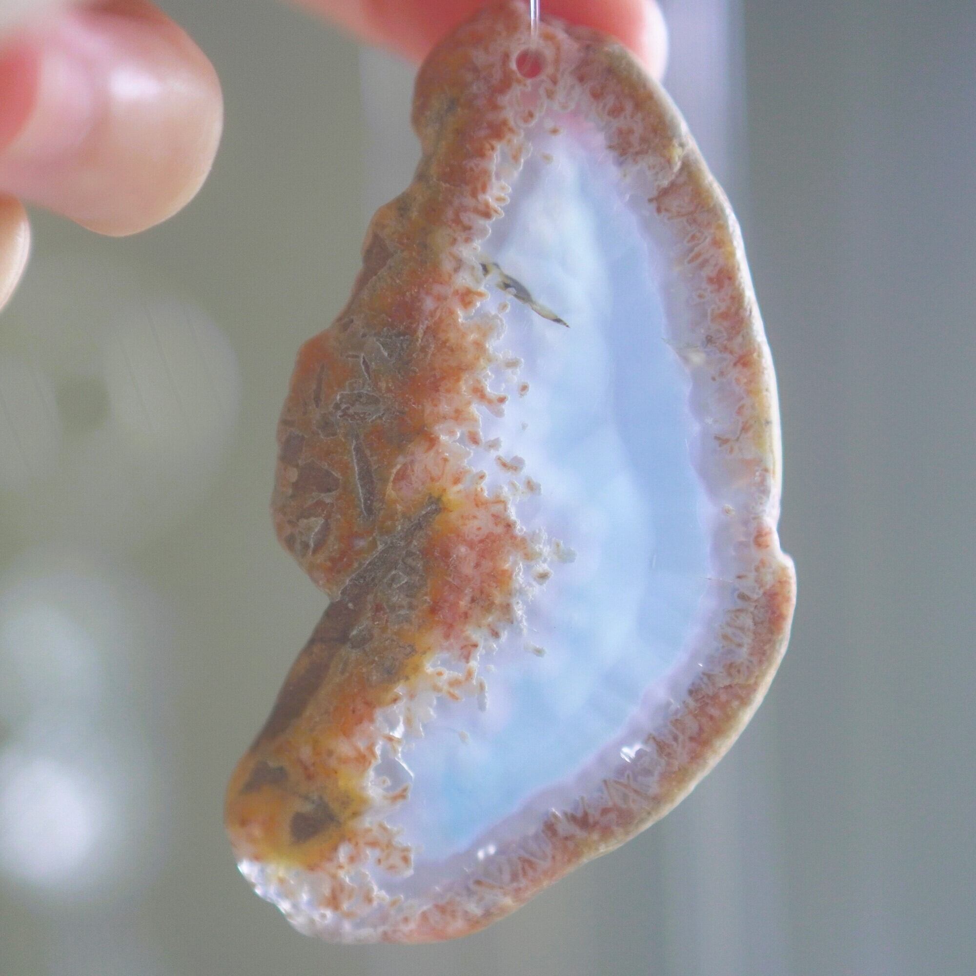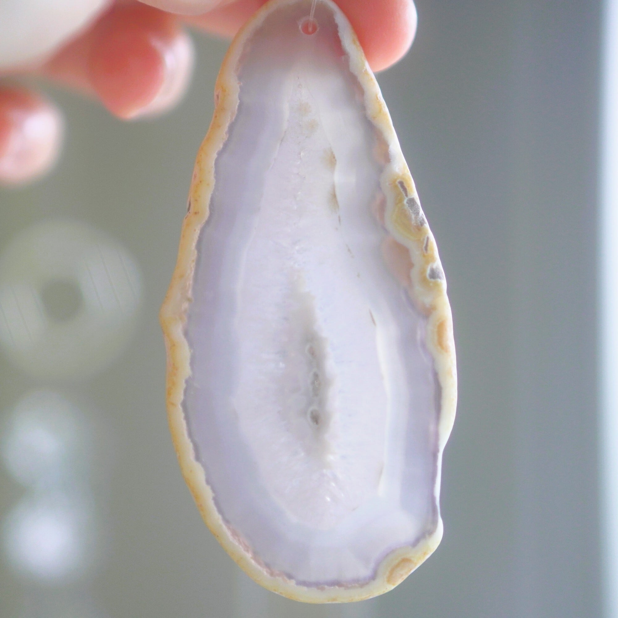 重ねる石同士の側面の加工状態によっても良い音が鳴ったり鳴らなかったり、石の見た目だけで組み合わせを決められないことが難しいポイントでもあるのですが、そんな中、たくさんの石の中から選ばれた5枚のスライスアゲートから出来上がったチャイムたちは、どこか悠々自適に空を泳ぐ妖精のようでもあり、それぞれの音を楽しそうに奏でてくれます。