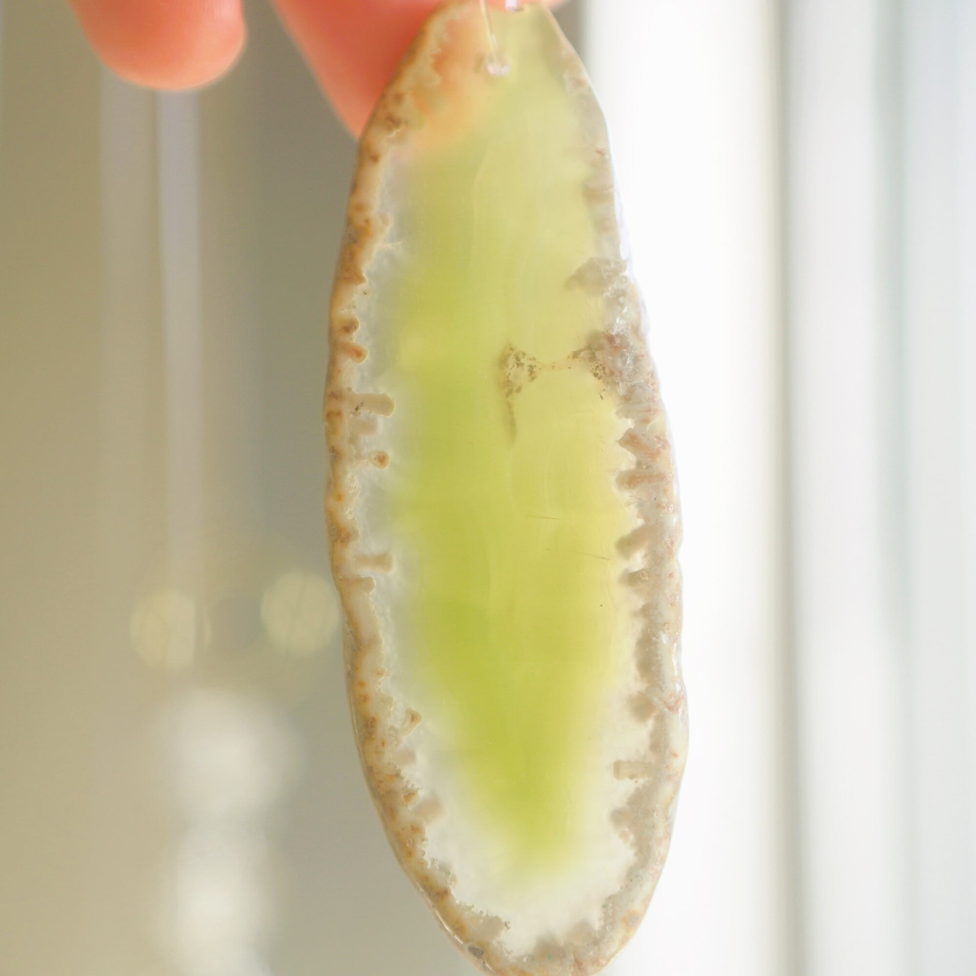 重ねる石同士の側面の加工状態によっても良い音が鳴ったり鳴らなかったり、石の見た目だけで組み合わせを決められないことが難しいポイントでもあるのですが、そんな中、たくさんの石の中から選ばれた5枚のスライスアゲートから出来上がったチャイムたちは、どこか悠々自適に空を泳ぐ妖精のようでもあり、それぞれの音を楽しそうに奏でてくれます。