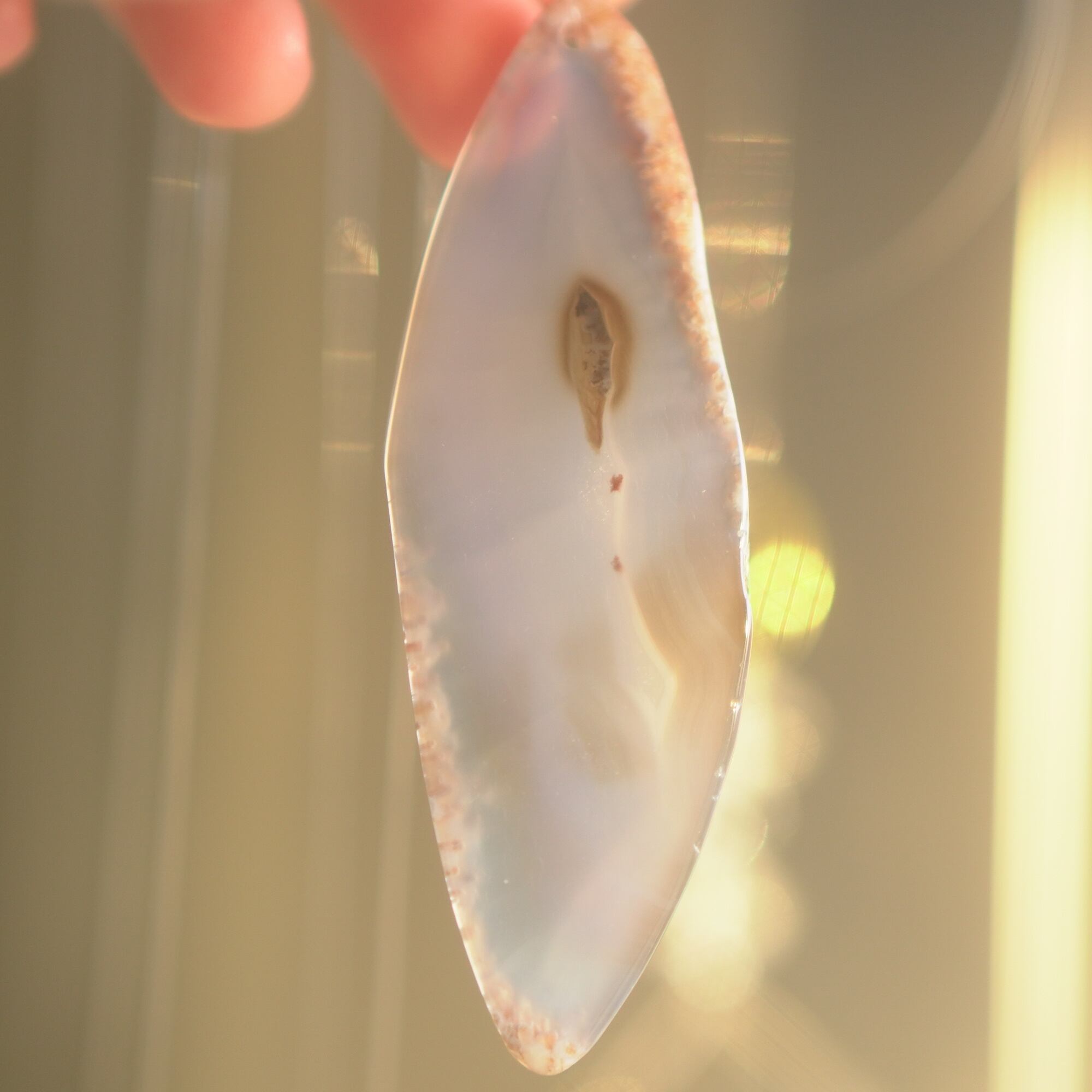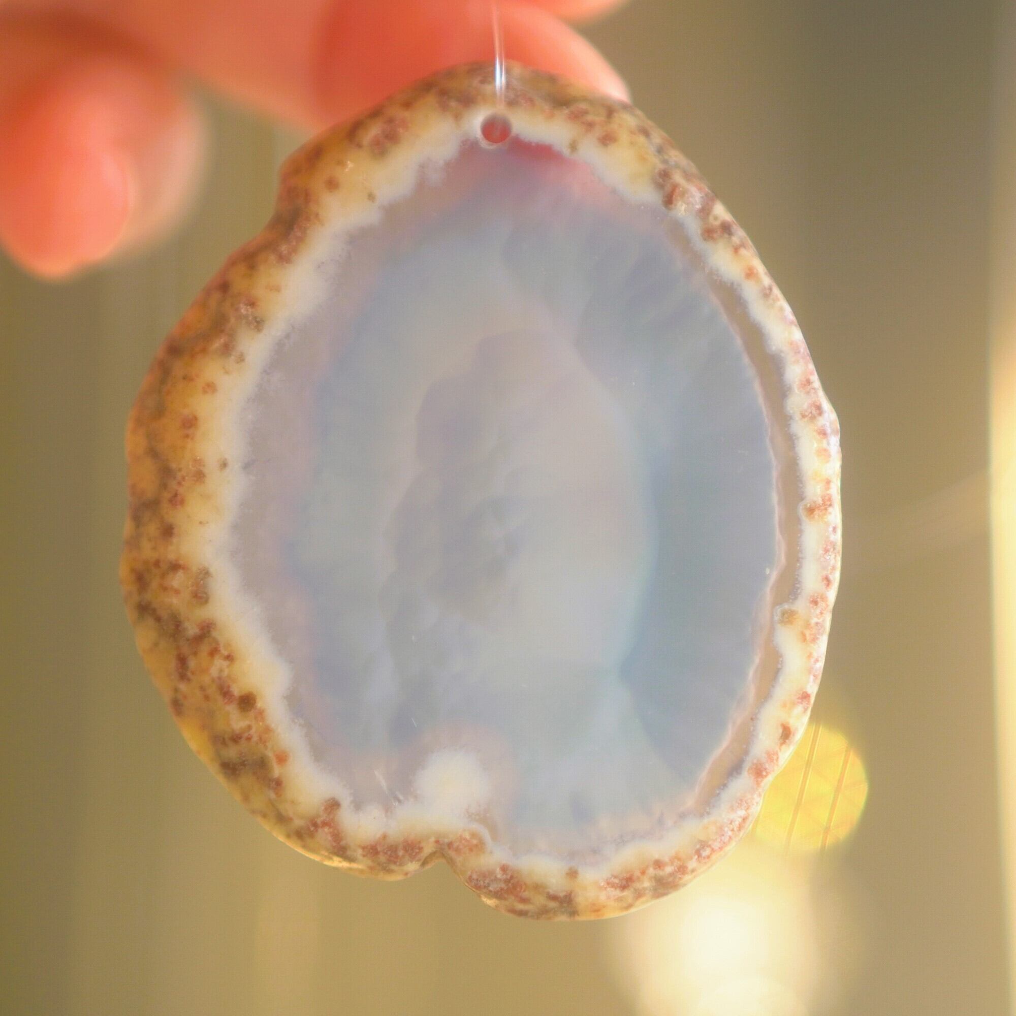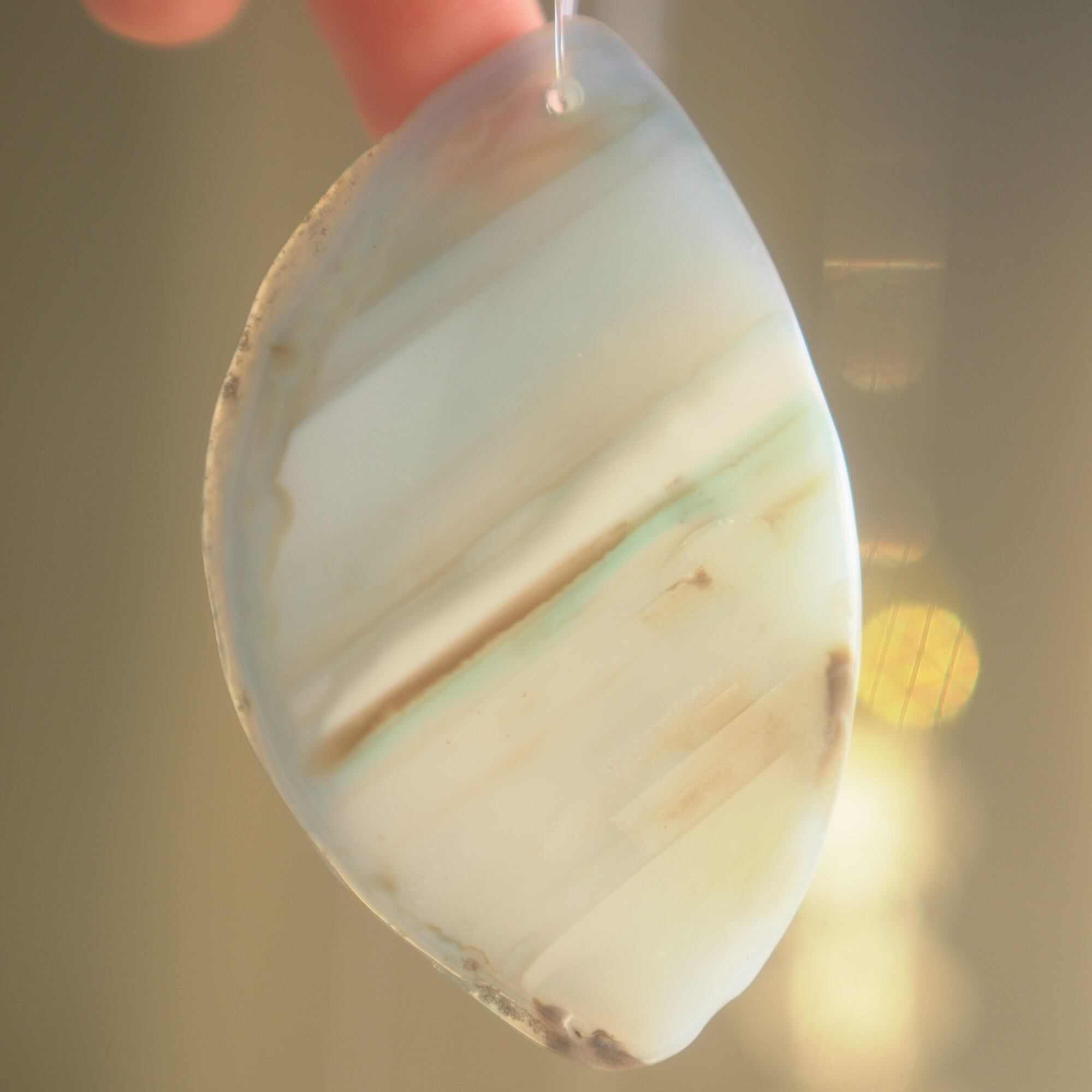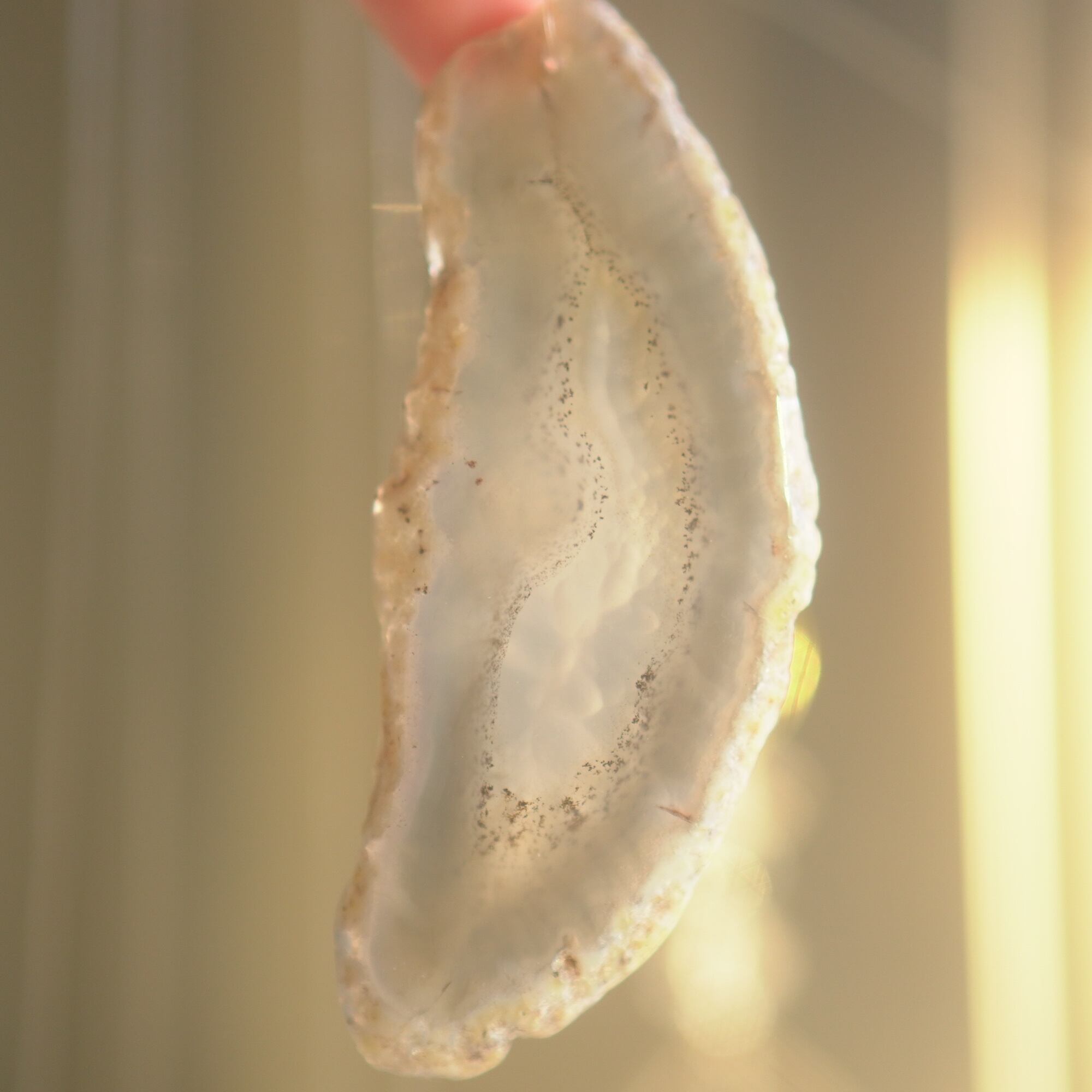 重ねる石同士の側面の加工状態によっても良い音が鳴ったり鳴らなかったり、石の見た目だけで組み合わせを決められないことが難しいポイントでもあるのですが、そんな中、たくさんの石の中から選ばれた5枚のスライスアゲートから出来上がったチャイムたちは、どこか悠々自適に空を泳ぐ妖精のようでもあり、それぞれの音を楽しそうに奏でてくれます。