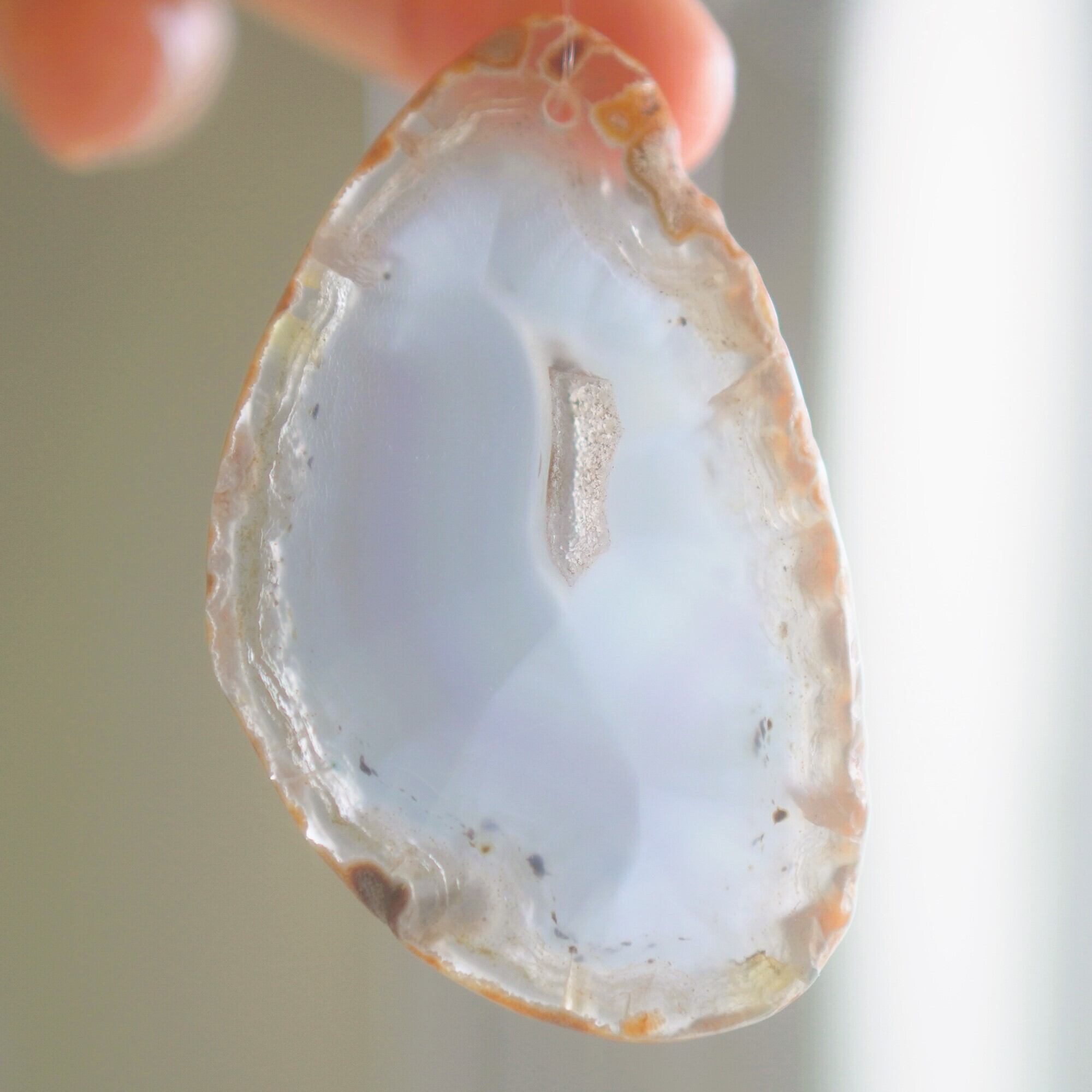 重ねる石同士の側面の加工状態によっても良い音が鳴ったり鳴らなかったり、石の見た目だけで組み合わせを決められないことが難しいポイントでもあるのですが、そんな中、たくさんの石の中から選ばれた5枚のスライスアゲートから出来上がったチャイムたちは、どこか悠々自適に空を泳ぐ妖精のようでもあり、それぞれの音を楽しそうに奏でてくれます。