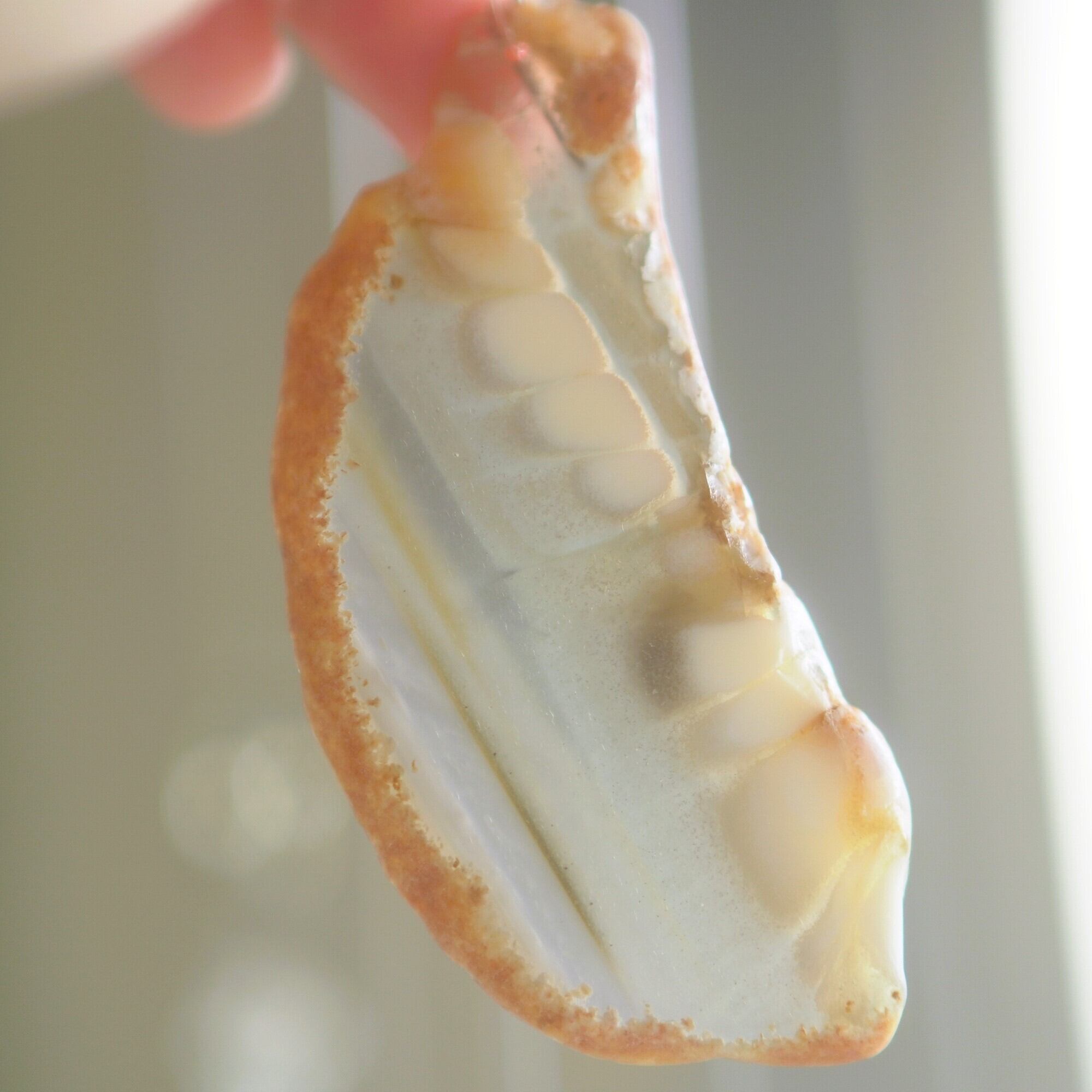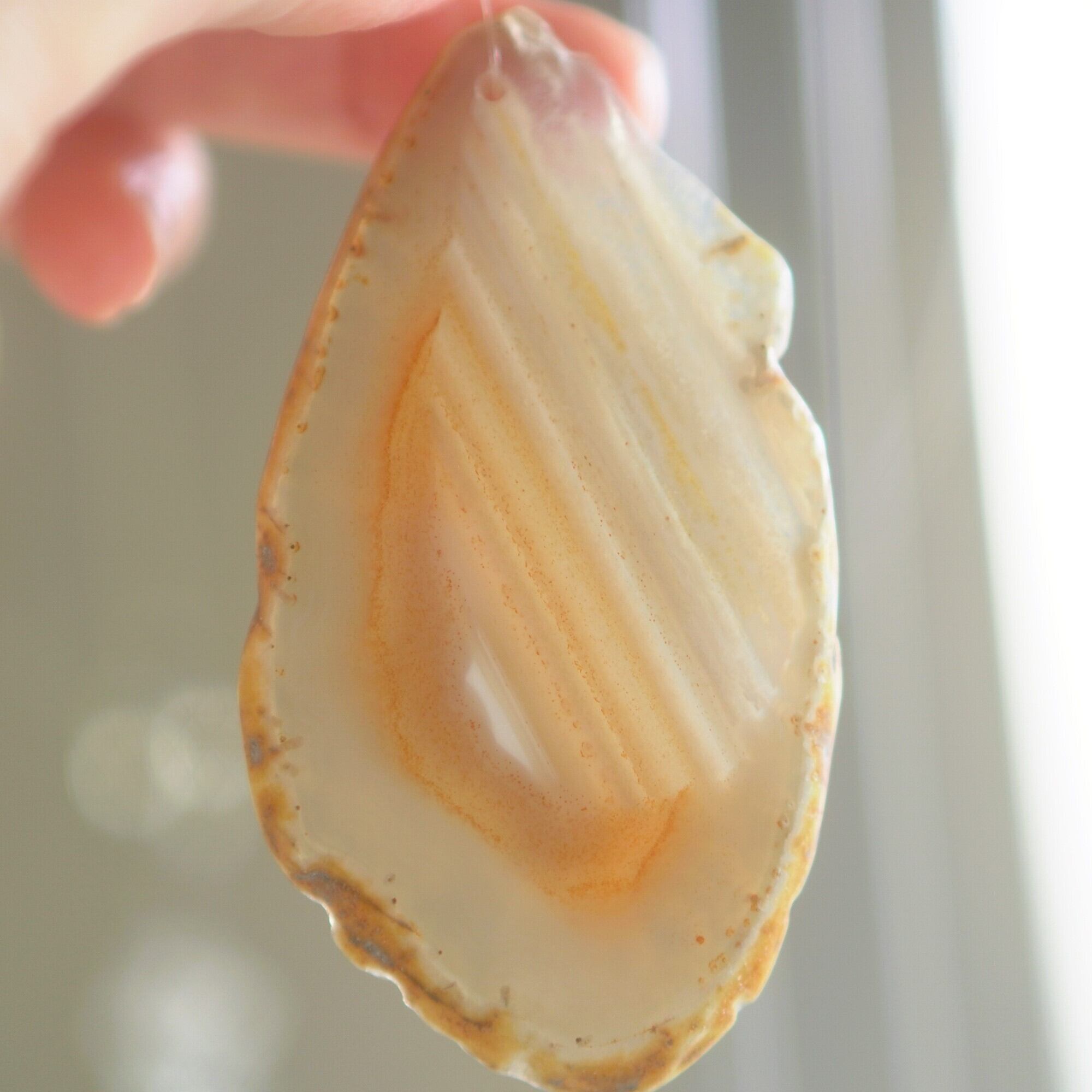 重ねる石同士の側面の加工状態によっても良い音が鳴ったり鳴らなかったり、石の見た目だけで組み合わせを決められないことが難しいポイントでもあるのですが、そんな中、たくさんの石の中から選ばれた5枚のスライスアゲートから出来上がったチャイムたちは、どこか悠々自適に空を泳ぐ妖精のようでもあり、それぞれの音を楽しそうに奏でてくれます。