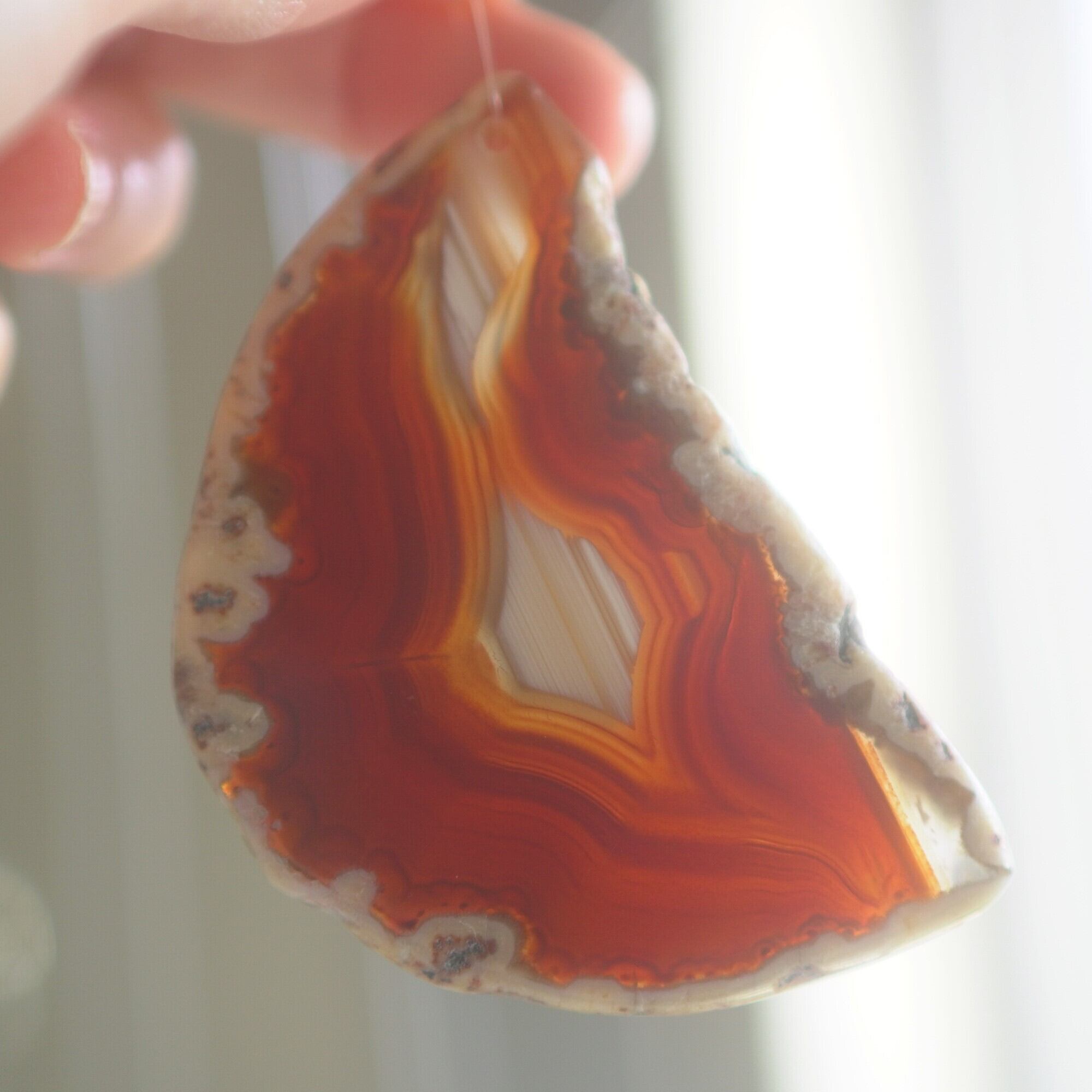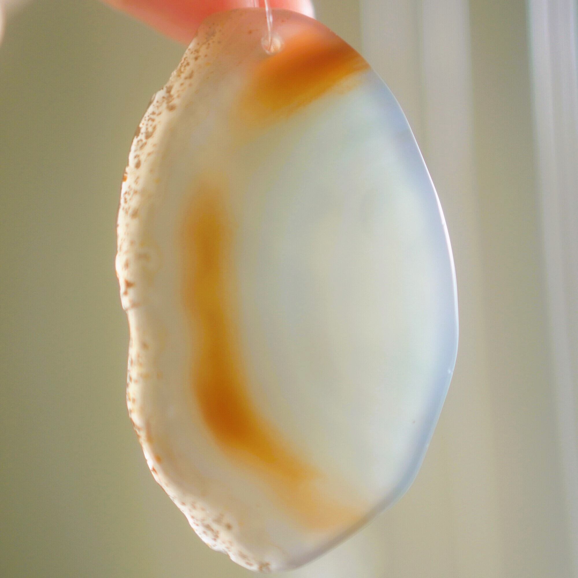 元々の瑪瑙風鈴とは使っている石の大きさや厚みが異なり、こちらのものはそれ同士重ねるだけでは特別音が鳴らない厚さのスライスアゲートを使用しているのですが、間に2本、細長い形状のアゲートを挟むことによって音が鳴る仕組みになっています。(もう少し変則的な組み合わせ方で音が鳴っていることもあります)