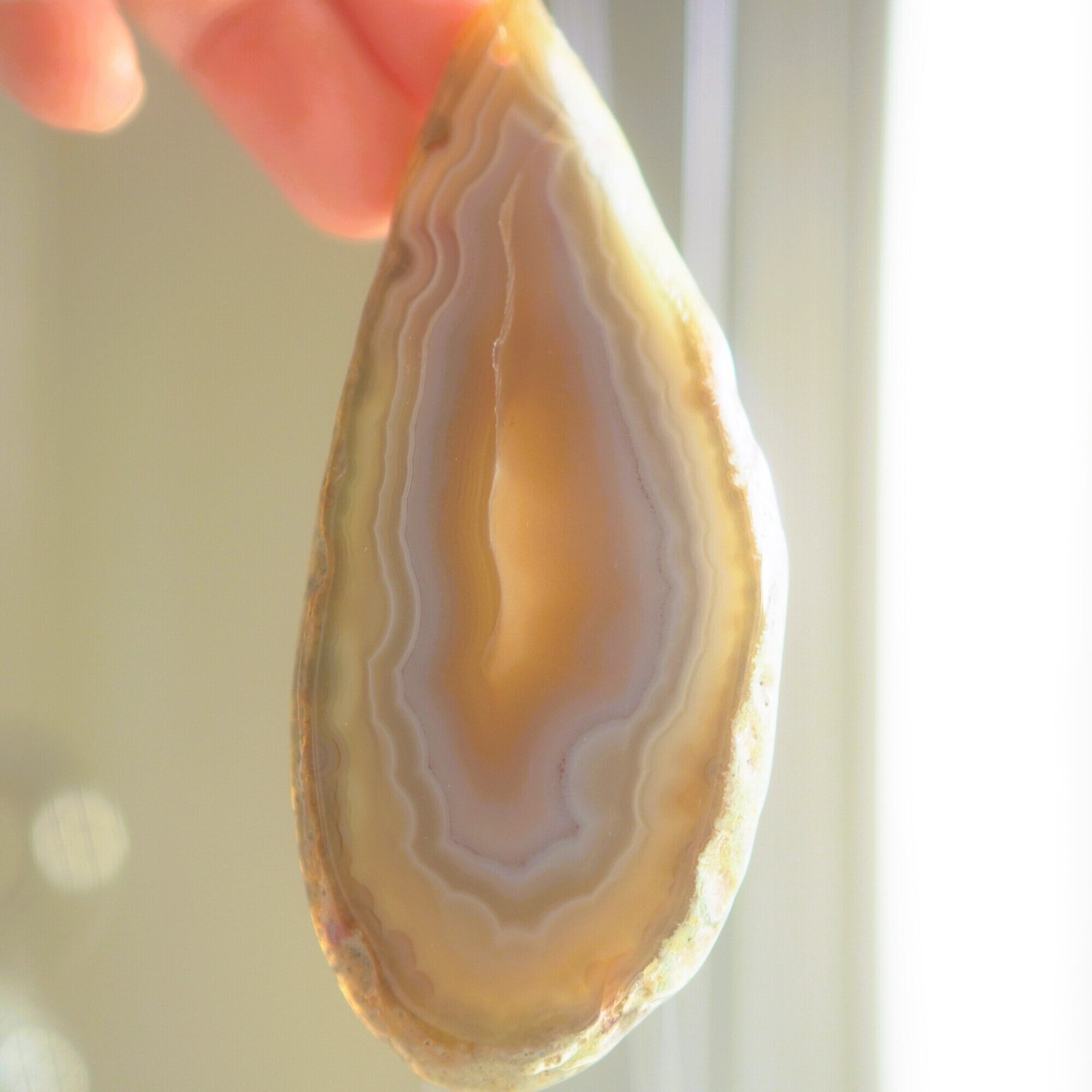重ねる石同士の側面の加工状態によっても良い音が鳴ったり鳴らなかったり、石の見た目だけで組み合わせを決められないことが難しいポイントでもあるのですが、そんな中、たくさんの石の中から選ばれた5枚のスライスアゲートから出来上がったチャイムたちは、どこか悠々自適に空を泳ぐ妖精のようでもあり、それぞれの音を楽しそうに奏でてくれます。