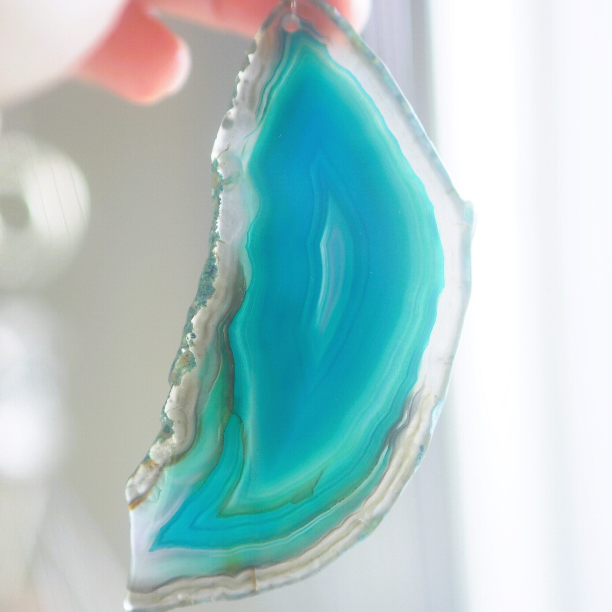 ✧染色の石なので耐光性(光による経年でのカラー変化の耐性)に優れているわけではなくベランダなど一日の中で長時間強い日光に当たるような場所に飾られるのはおすすめしないのですが、陽光に透かした時にだけ真価を発揮する美しさがありますので、是非、時折翳したりして光と一緒にお楽しみいただけたらと思います。特に濃い鮮やかな色など、色変化が気になられる場合は、日光のあまり当たらない場所に飾ってくださいね✧