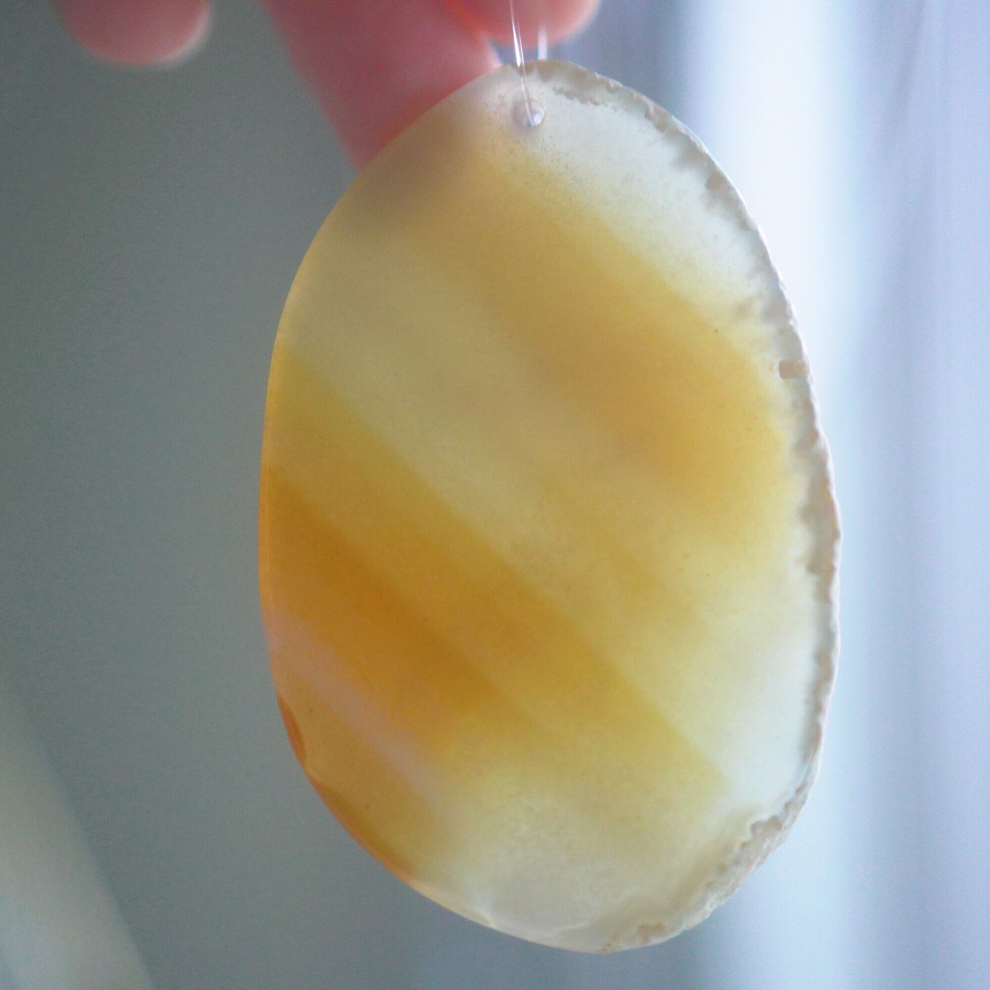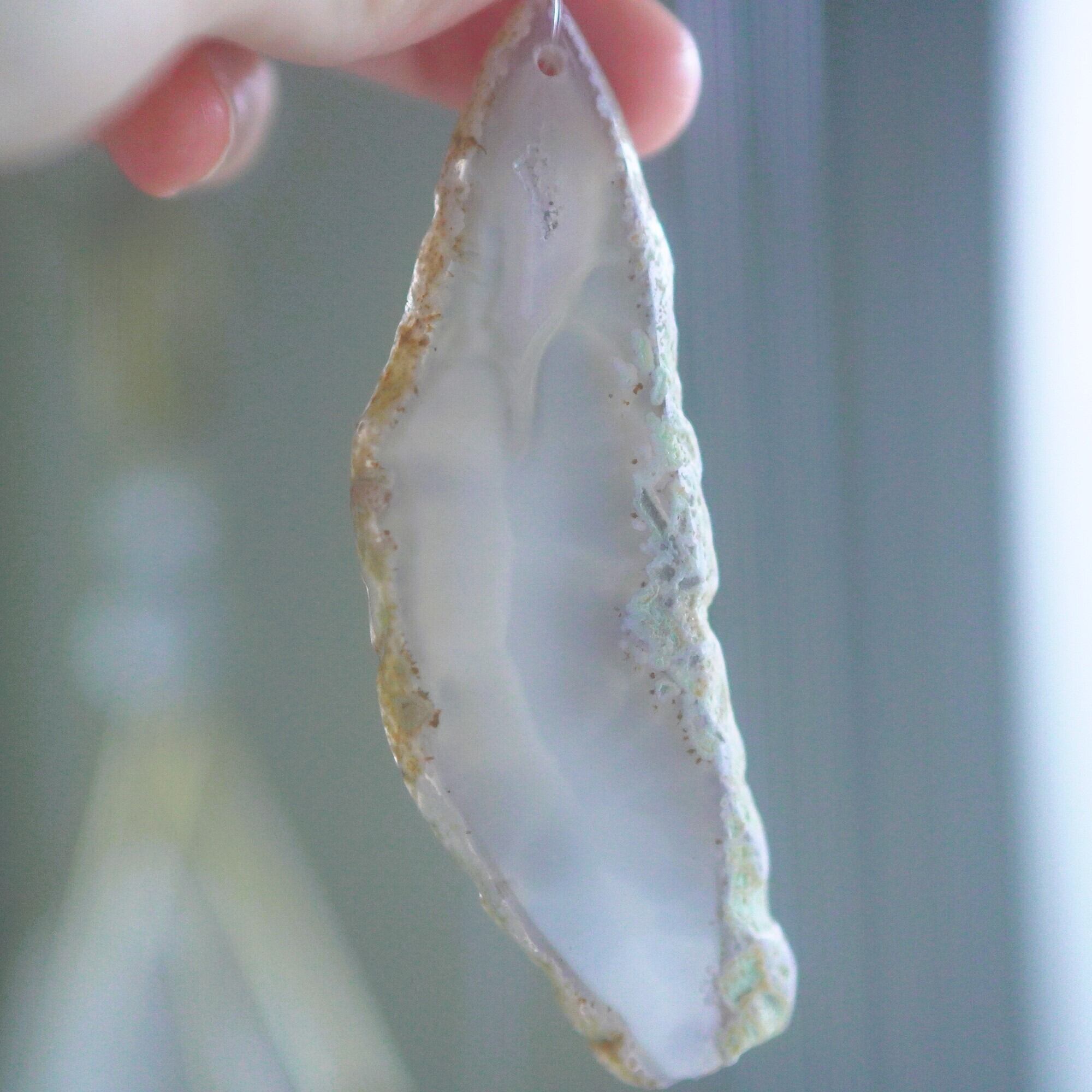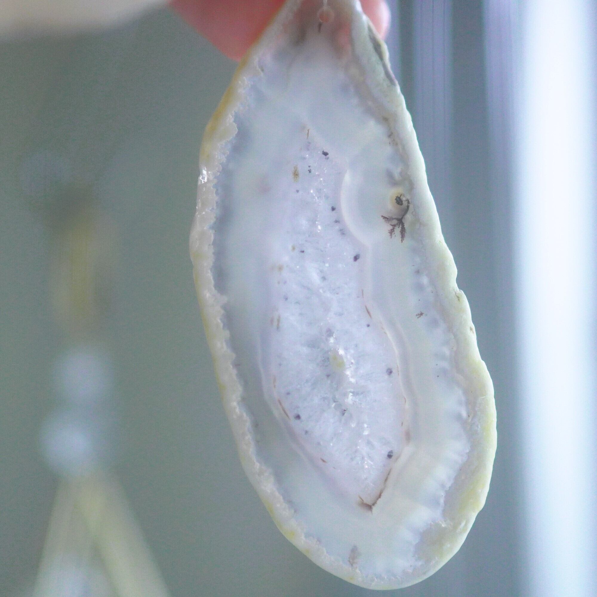 重ねる石同士の側面の加工状態によっても良い音が鳴ったり鳴らなかったり、石の見た目だけで組み合わせを決められないことが難しいポイントでもあるのですが、そんな中、たくさんの石の中から選ばれた5枚のスライスアゲートから出来上がったチャイムたちは、どこか悠々自適に空を泳ぐ妖精のようでもあり、それぞれの音を楽しそうに奏でてくれます。