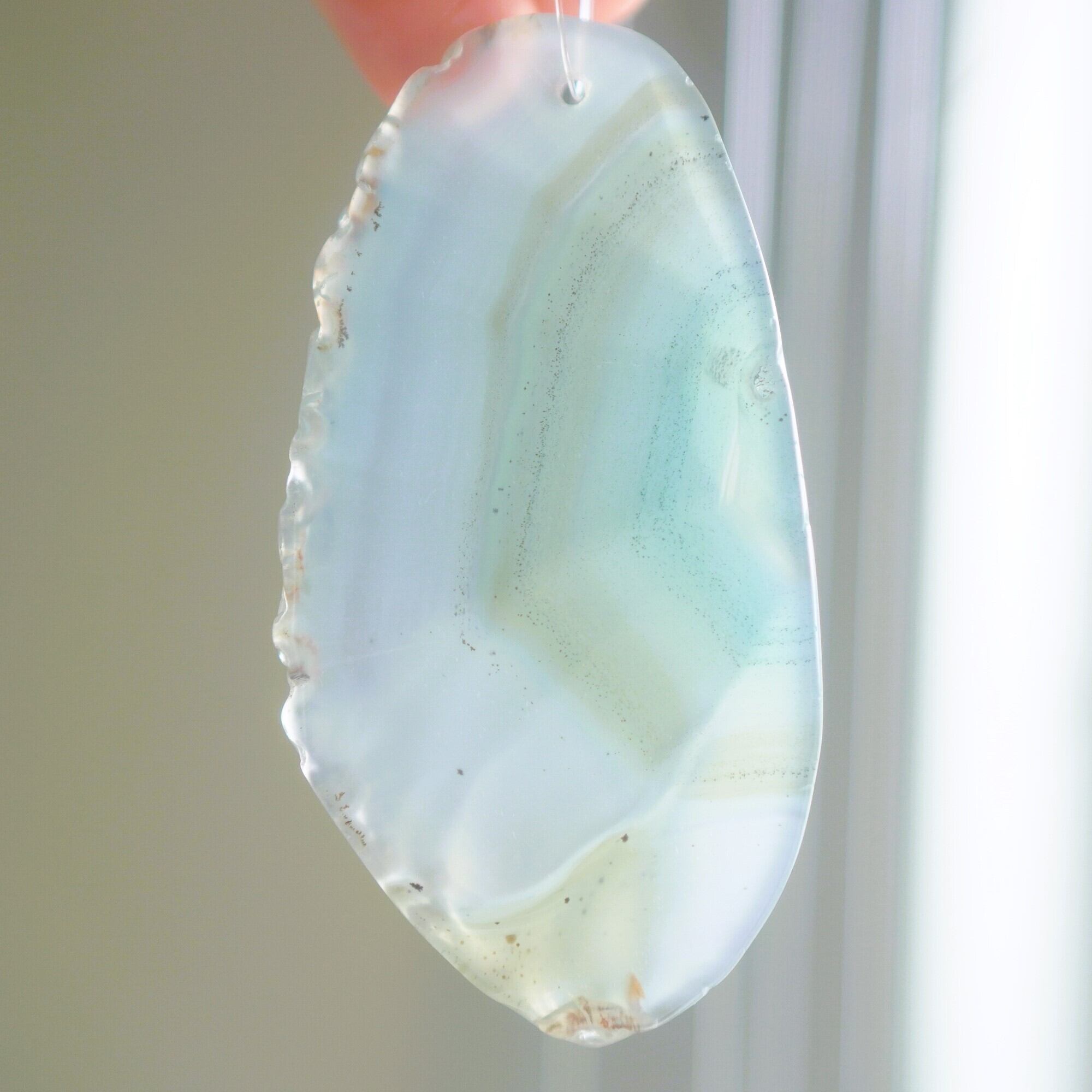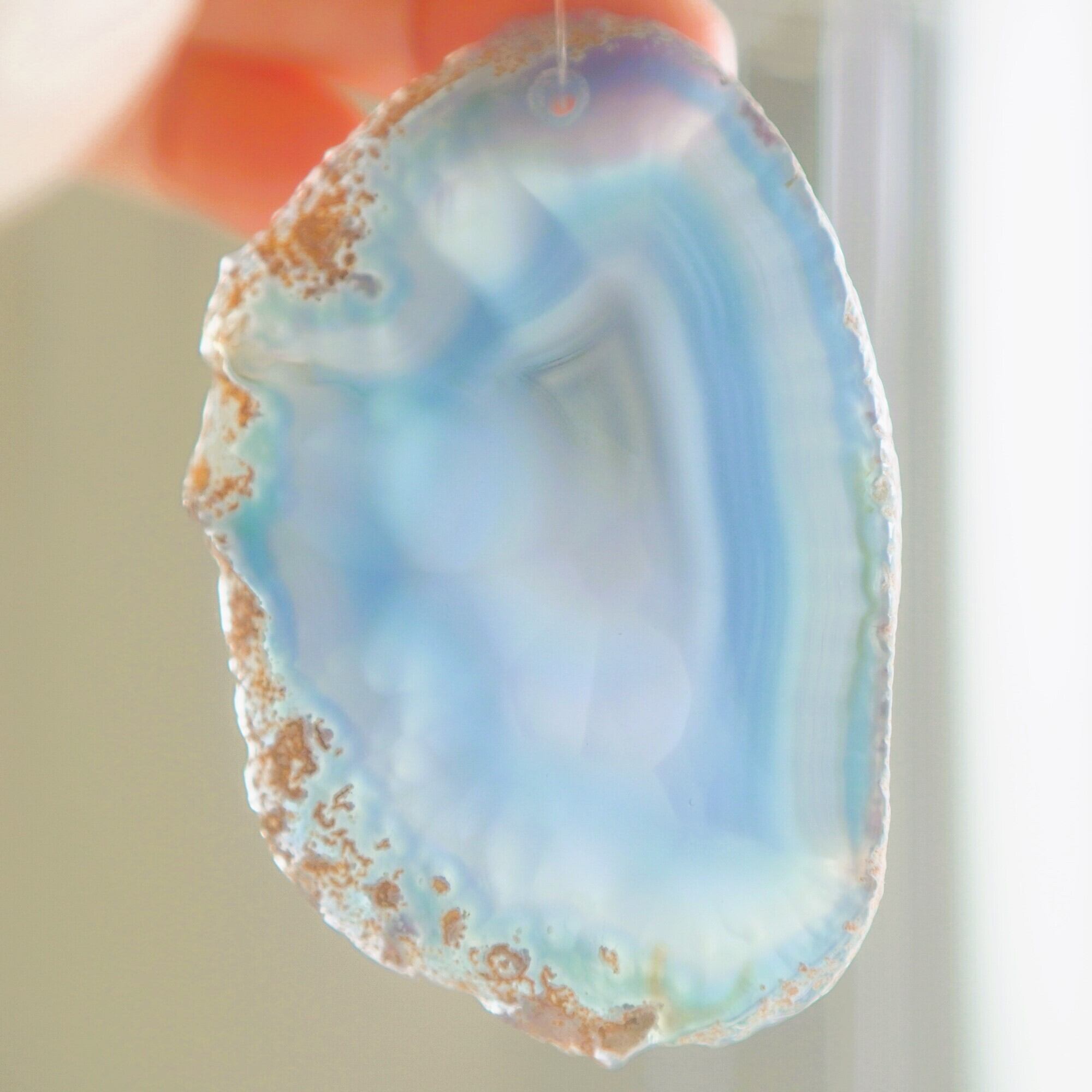 重ねる石同士の側面の加工状態によっても良い音が鳴ったり鳴らなかったり、石の見た目だけで組み合わせを決められないことが難しいポイントでもあるのですが、そんな中、たくさんの石の中から選ばれた5枚のスライスアゲートから出来上がったチャイムたちは、どこか悠々自適に空を泳ぐ妖精のようでもあり、それぞれの音を楽しそうに奏でてくれます。