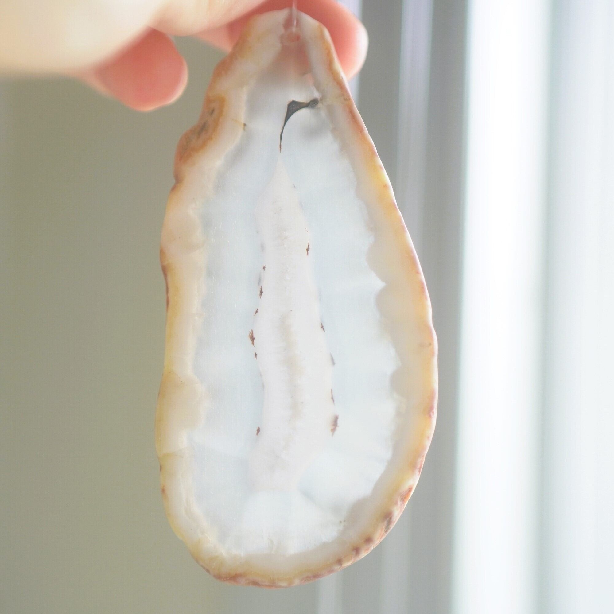 元々の瑪瑙風鈴とは使っている石の大きさや厚みが異なり、こちらのものはそれ同士重ねるだけでは特別音が鳴らない厚さのスライスアゲートを使用しているのですが、間に2本、細長い形状のアゲートを挟むことによって音が鳴る仕組みになっています。(もう少し変則的な組み合わせ方で音が鳴っていることもあります)