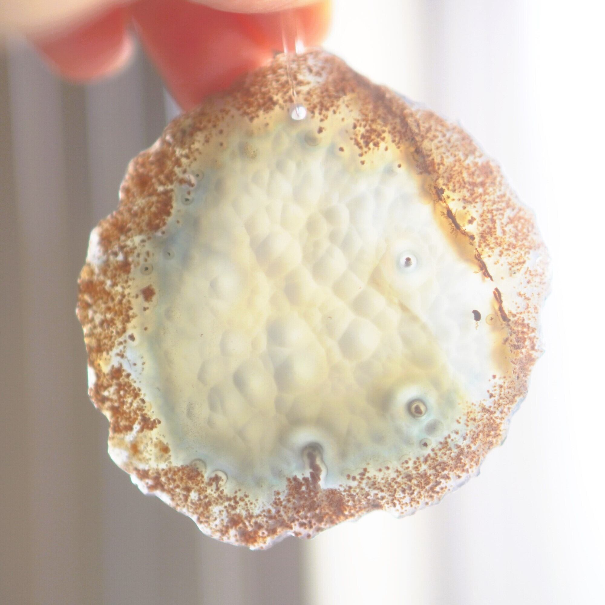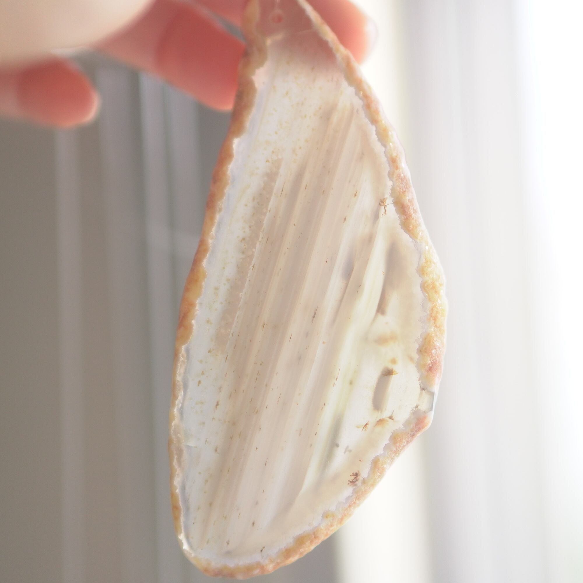 重ねる石同士の側面の加工状態によっても良い音が鳴ったり鳴らなかったり、石の見た目だけで組み合わせを決められないことが難しいポイントでもあるのですが、そんな中、たくさんの石の中から選ばれた5枚のスライスアゲートから出来上がったチャイムたちは、どこか悠々自適に空を泳ぐ妖精のようでもあり、それぞれの音を楽しそうに奏でてくれます。