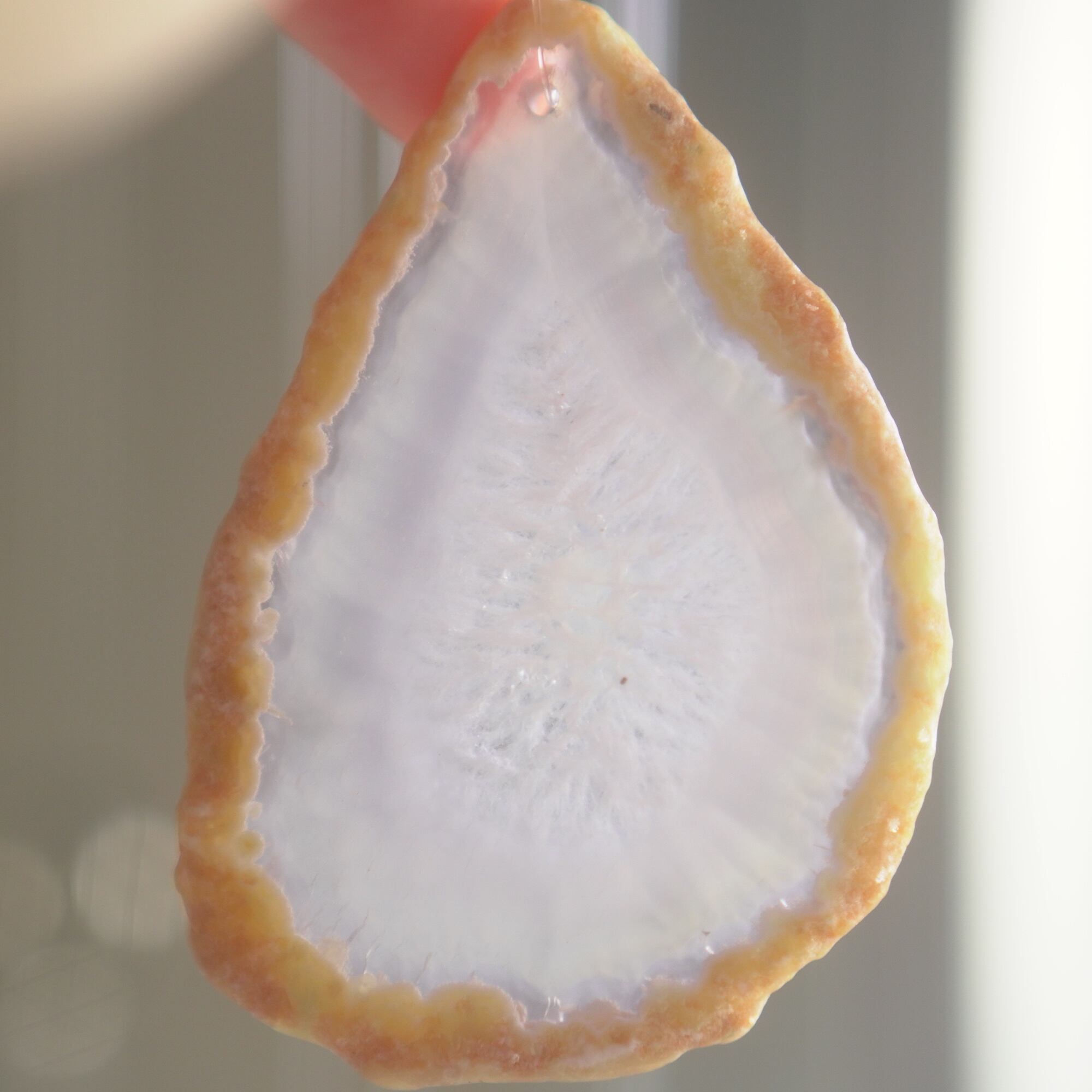 重ねる石同士の側面の加工状態によっても良い音が鳴ったり鳴らなかったり、石の見た目だけで組み合わせを決められないことが難しいポイントでもあるのですが、そんな中、たくさんの石の中から選ばれた5枚のスライスアゲートから出来上がったチャイムたちは、どこか悠々自適に空を泳ぐ妖精のようでもあり、それぞれの音を楽しそうに奏でてくれます。
