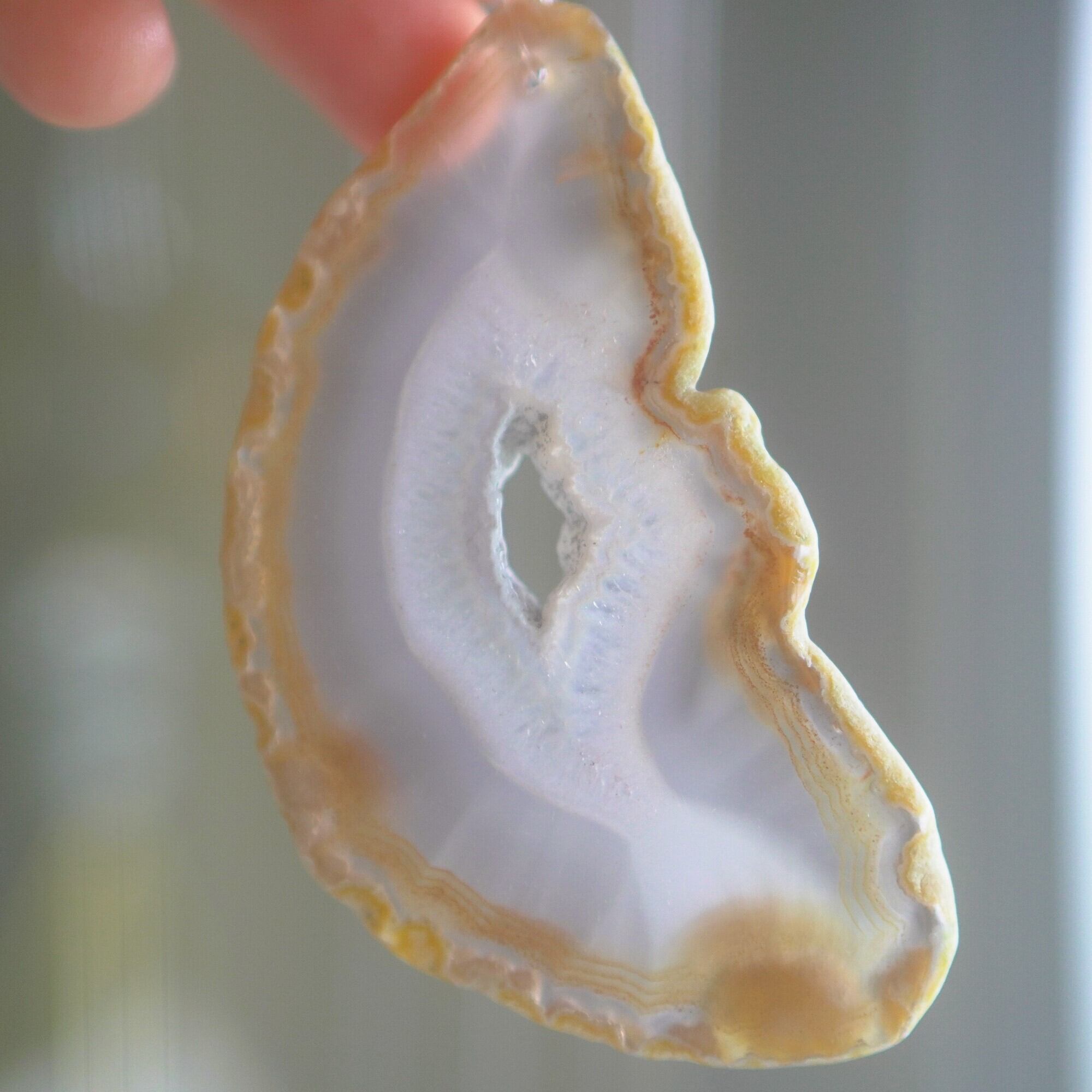重ねる石同士の側面の加工状態によっても良い音が鳴ったり鳴らなかったり、石の見た目だけで組み合わせを決められないことが難しいポイントでもあるのですが、そんな中、たくさんの石の中から選ばれた5枚のスライスアゲートから出来上がったチャイムたちは、どこか悠々自適に空を泳ぐ妖精のようでもあり、それぞれの音を楽しそうに奏でてくれます。