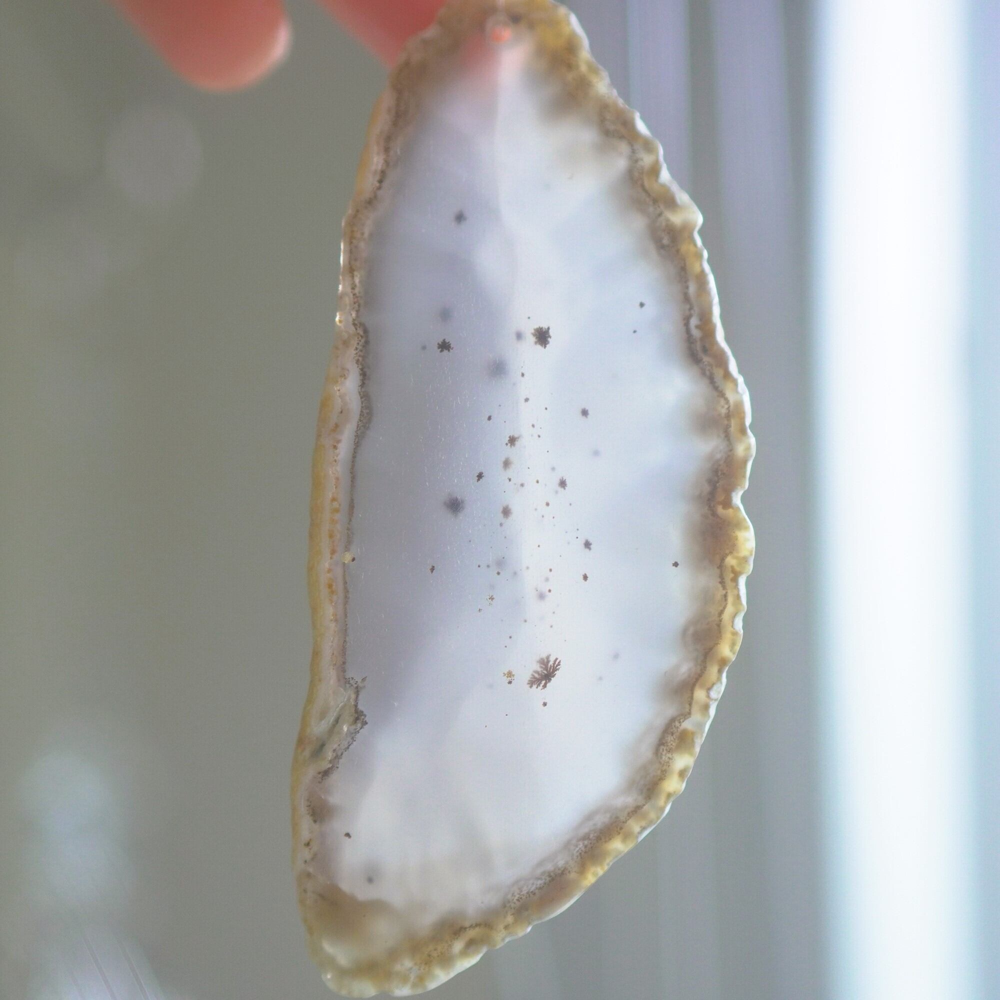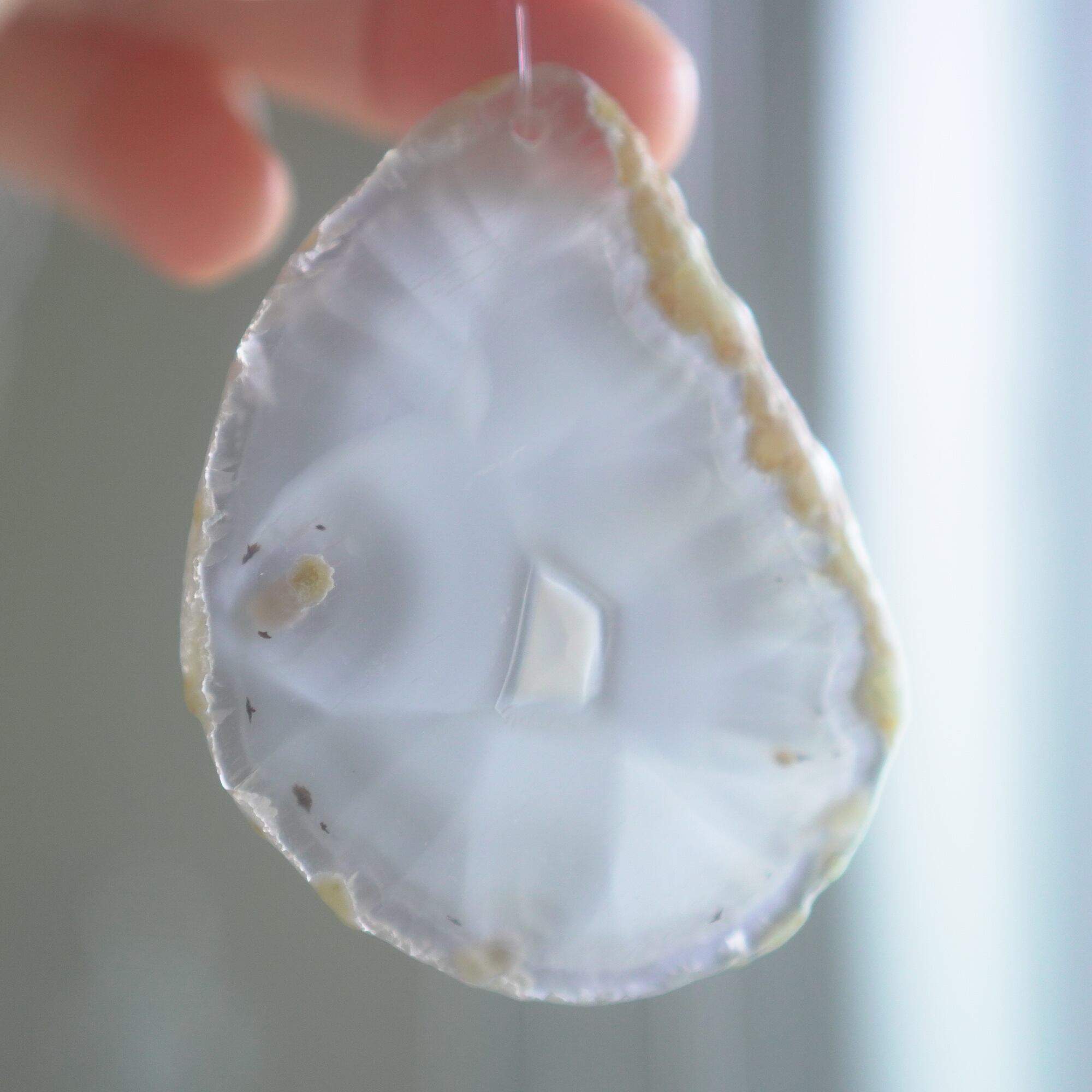 重ねる石同士の側面の加工状態によっても良い音が鳴ったり鳴らなかったり、石の見た目だけで組み合わせを決められないことが難しいポイントでもあるのですが、そんな中、たくさんの石の中から選ばれた5枚のスライスアゲートから出来上がったチャイムたちは、どこか悠々自適に空を泳ぐ妖精のようでもあり、それぞれの音を楽しそうに奏でてくれます。