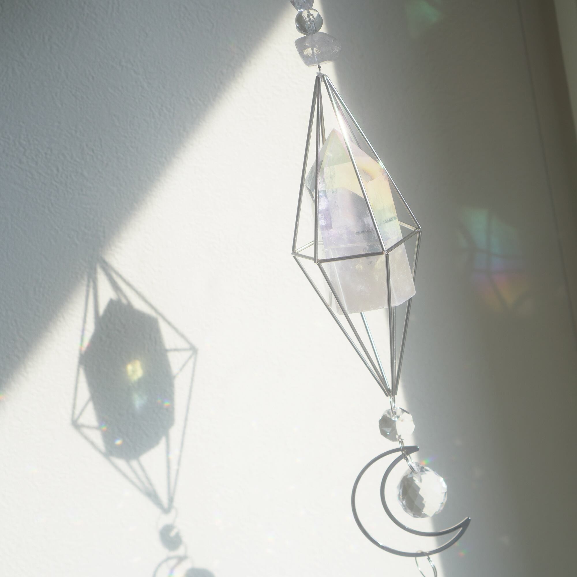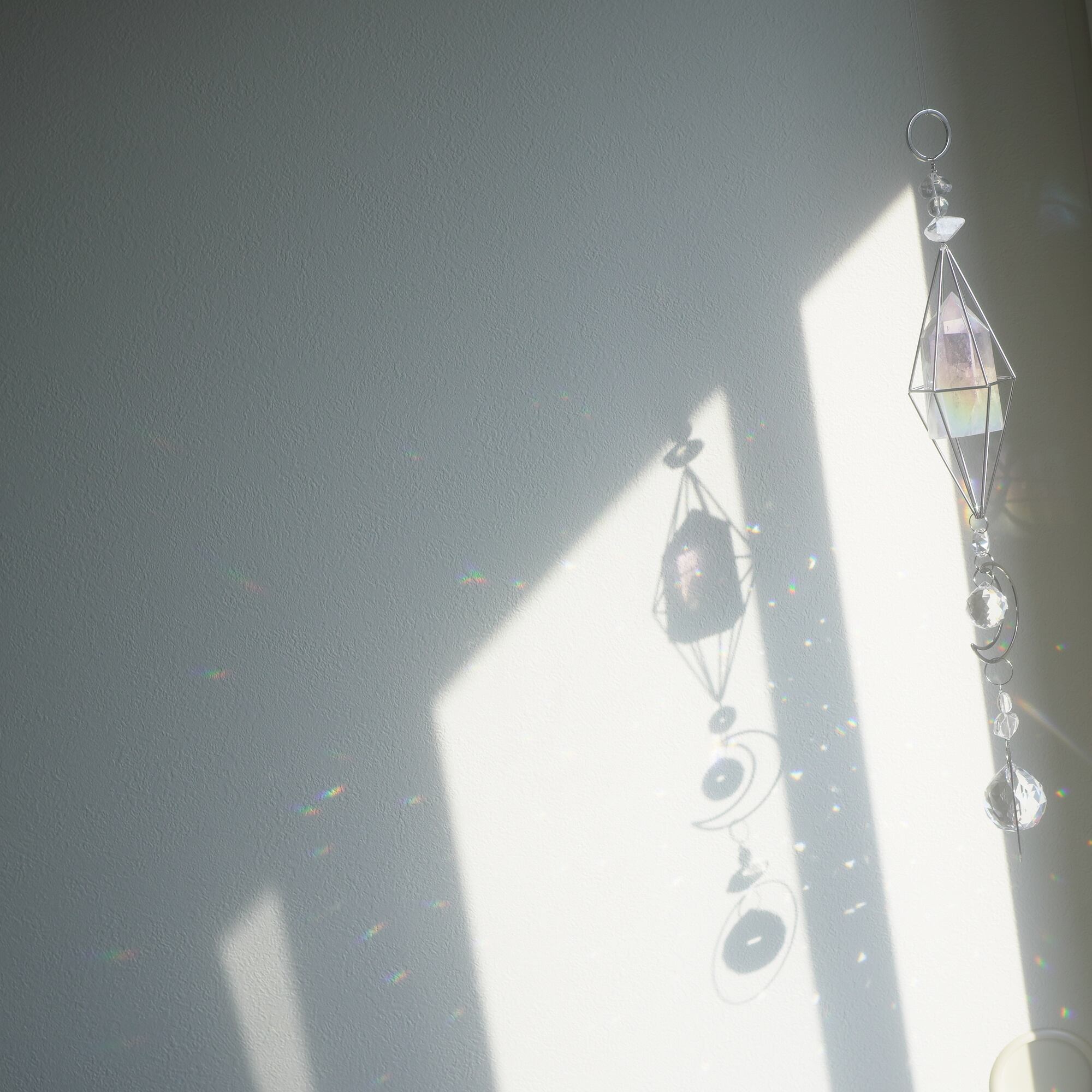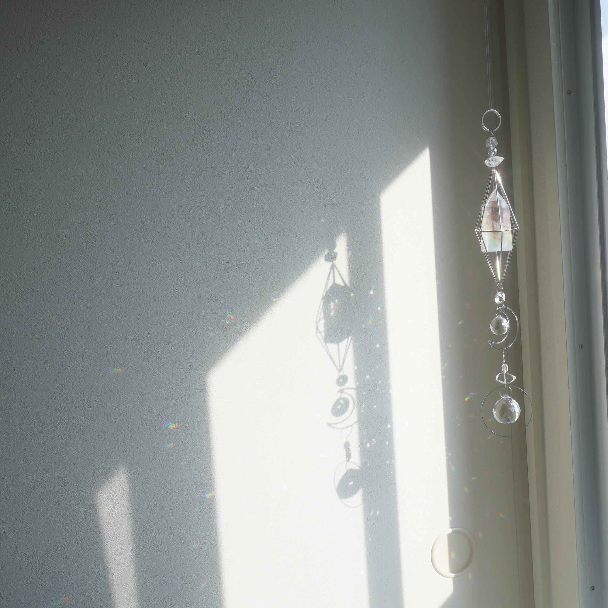 ヒンメリ用のメタルパイプを繋いだ幾何学形体に宿る、特別感のあるタワーカットの天然石。サンキャッチャーになるクリスタルカットのガラスボールやキラキラ輝くメタルパーツを組み合わせ、直射日光を浴びた際、キラキラと輝きながらたくさんの虹色の光がお部屋に広がります。