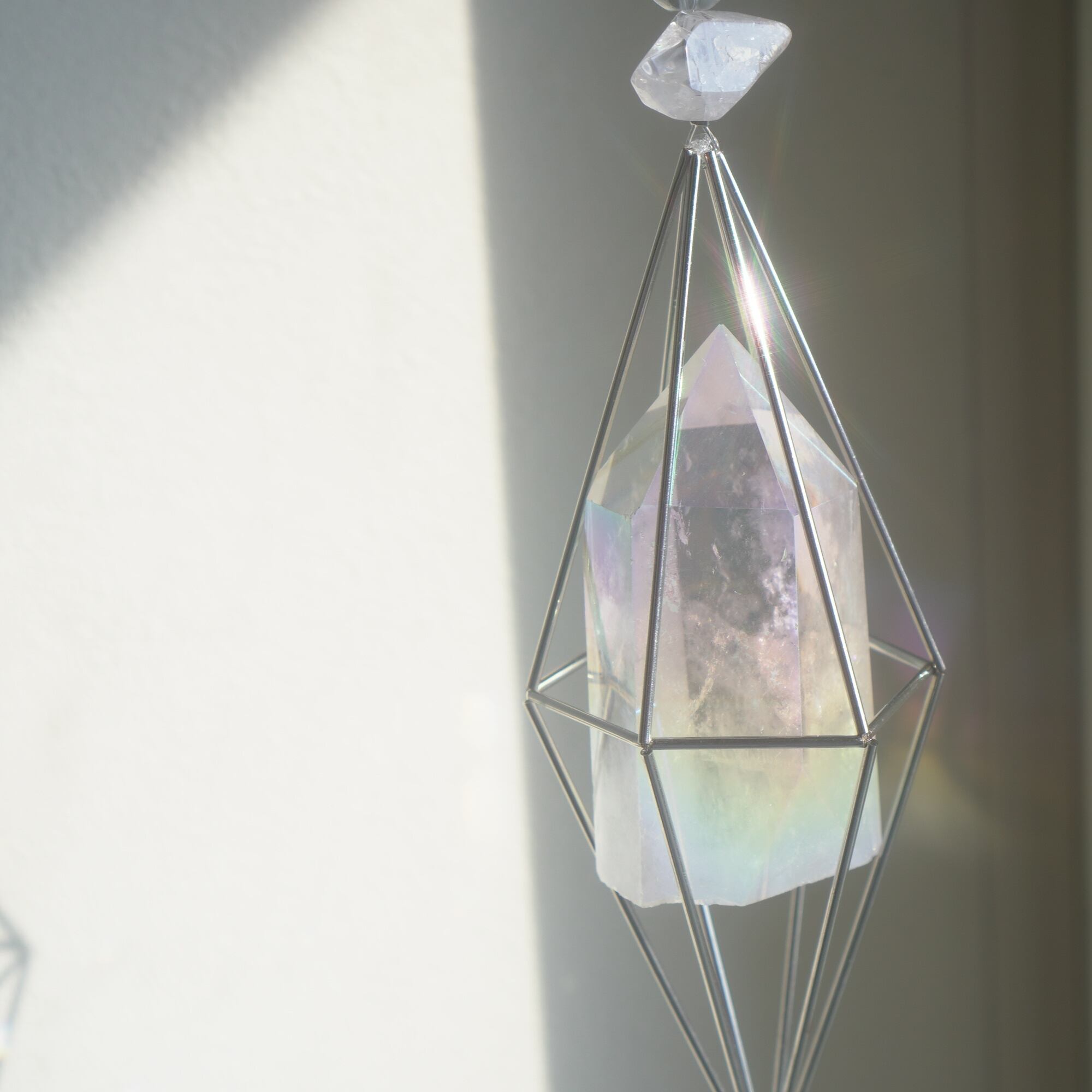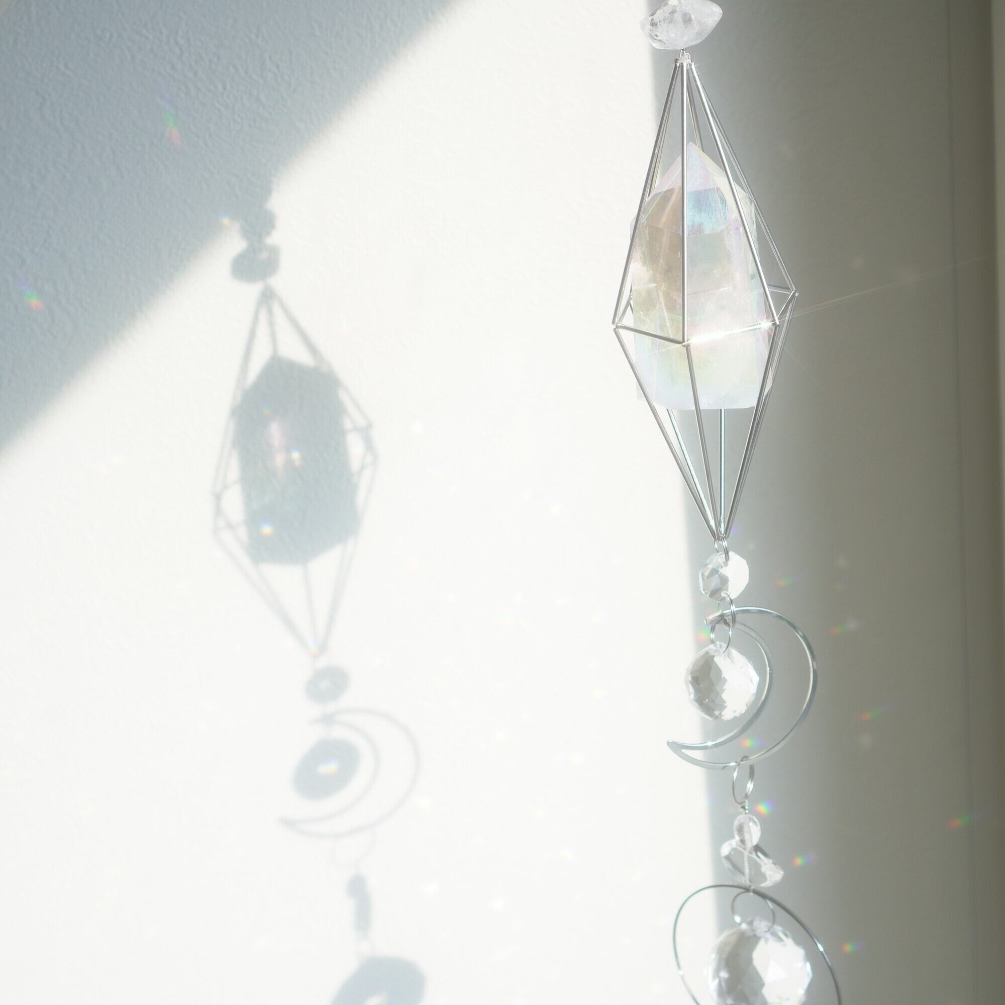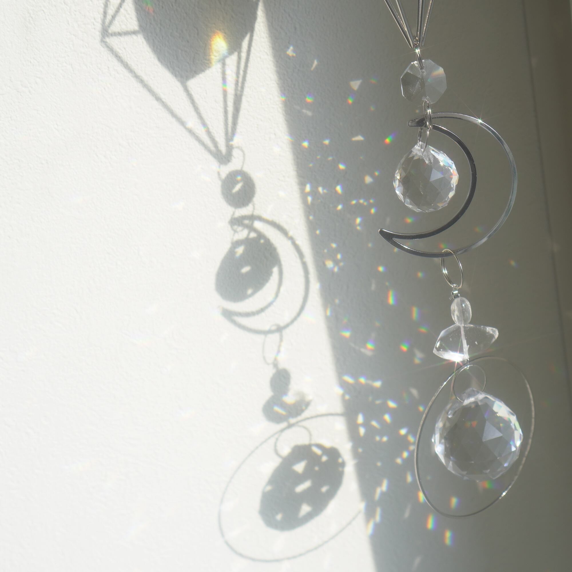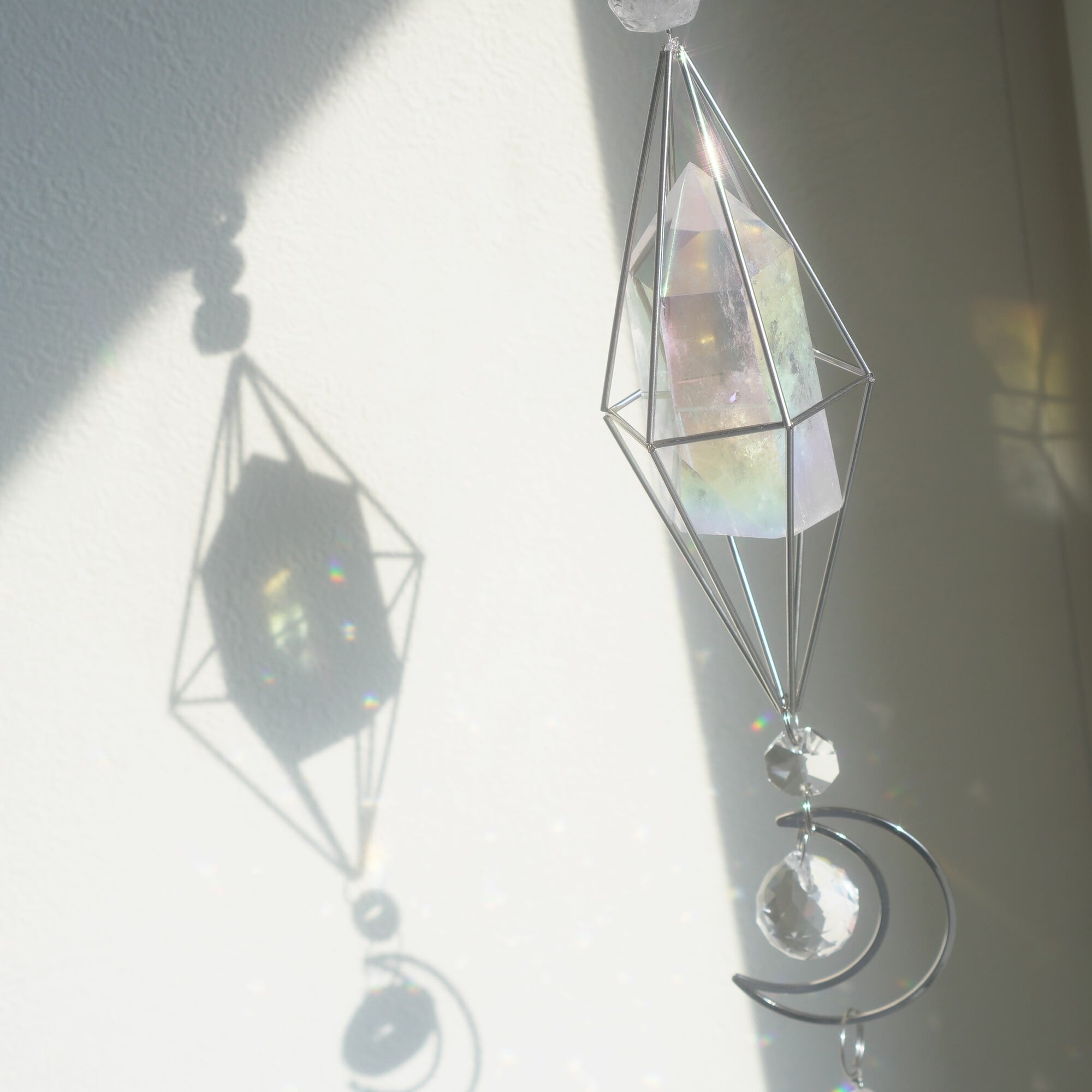 ヒンメリ用のメタルパイプを繋いだ幾何学形体に宿る、特別感のあるタワーカットの天然石。サンキャッチャーになるクリスタルカットのガラスボールやキラキラ輝くメタルパーツを組み合わせ、直射日光を浴びた際、キラキラと輝きながらたくさんの虹色の光がお部屋に広がります。