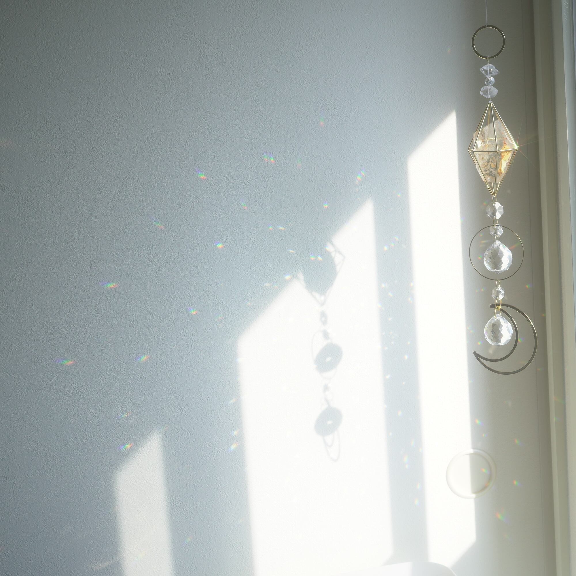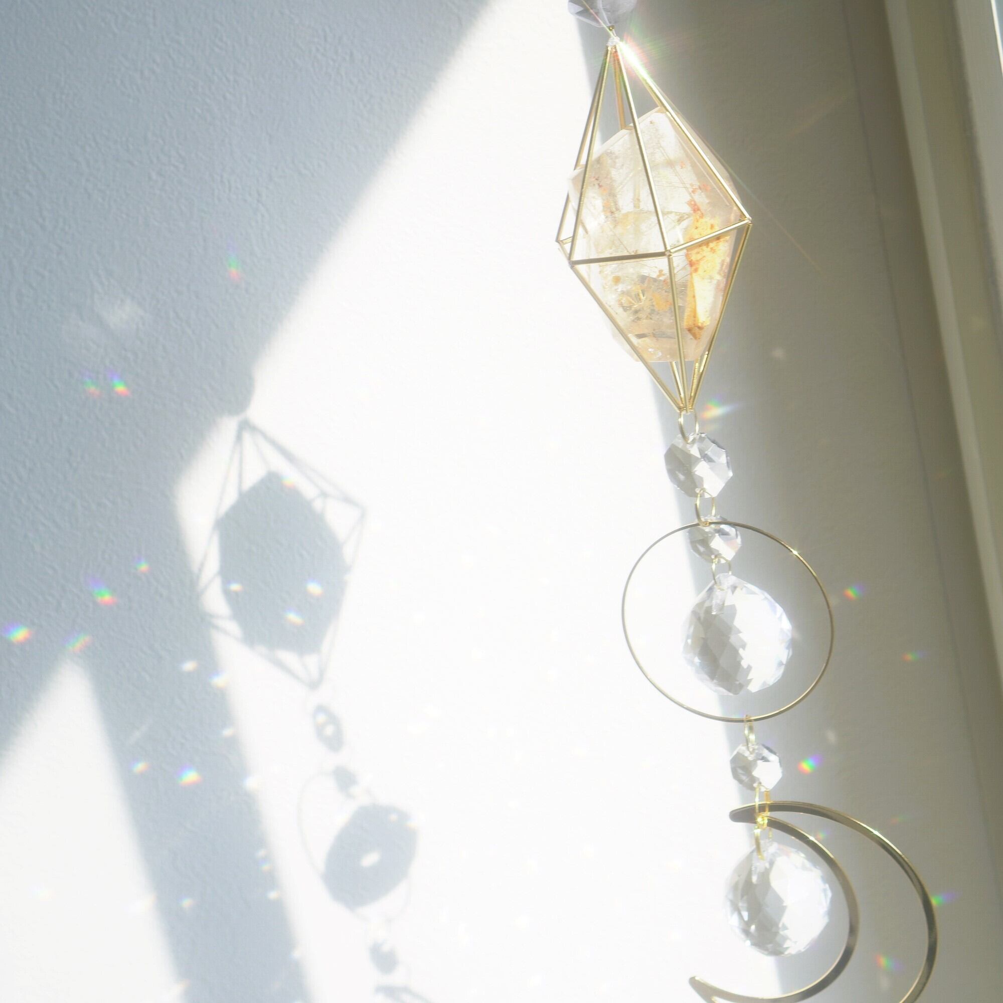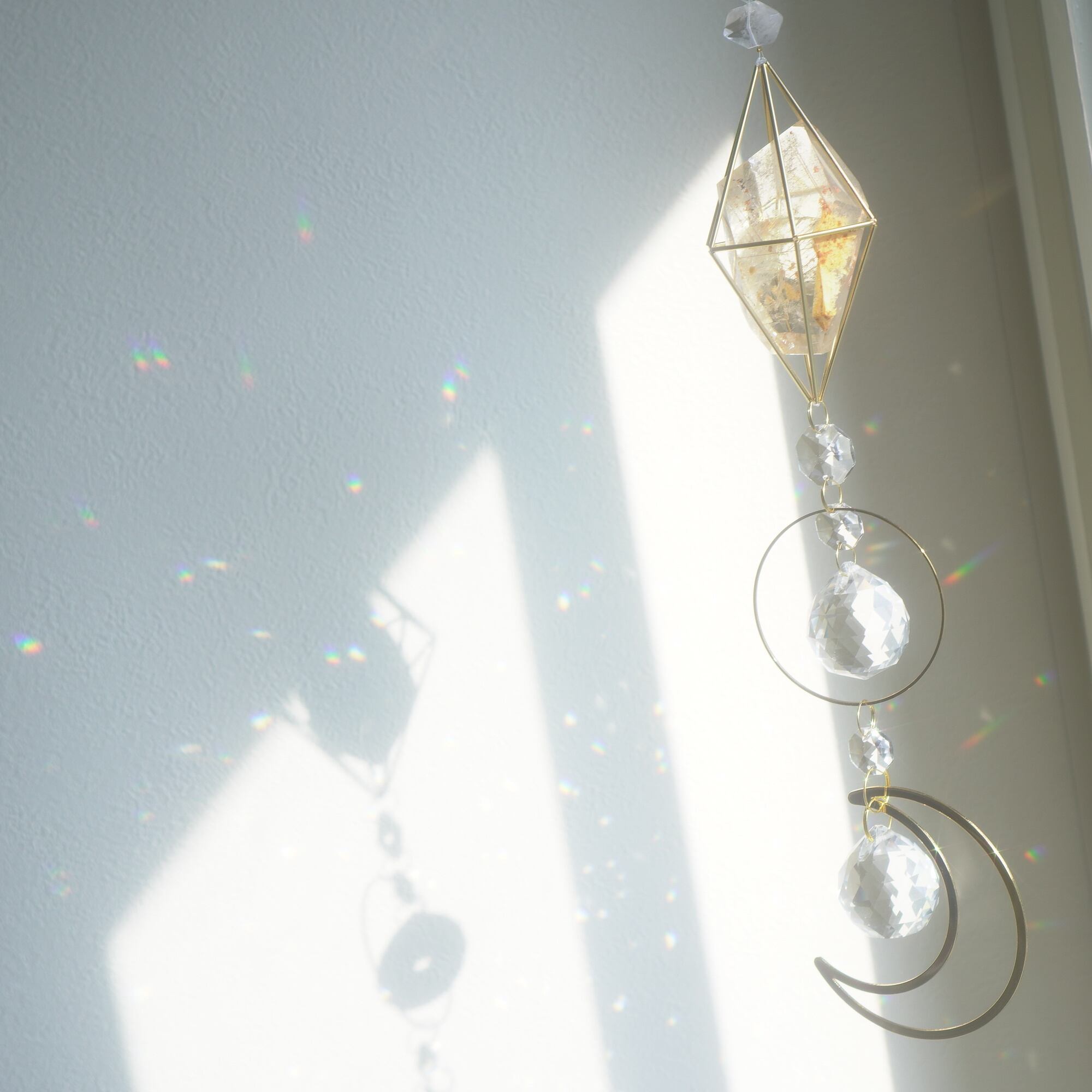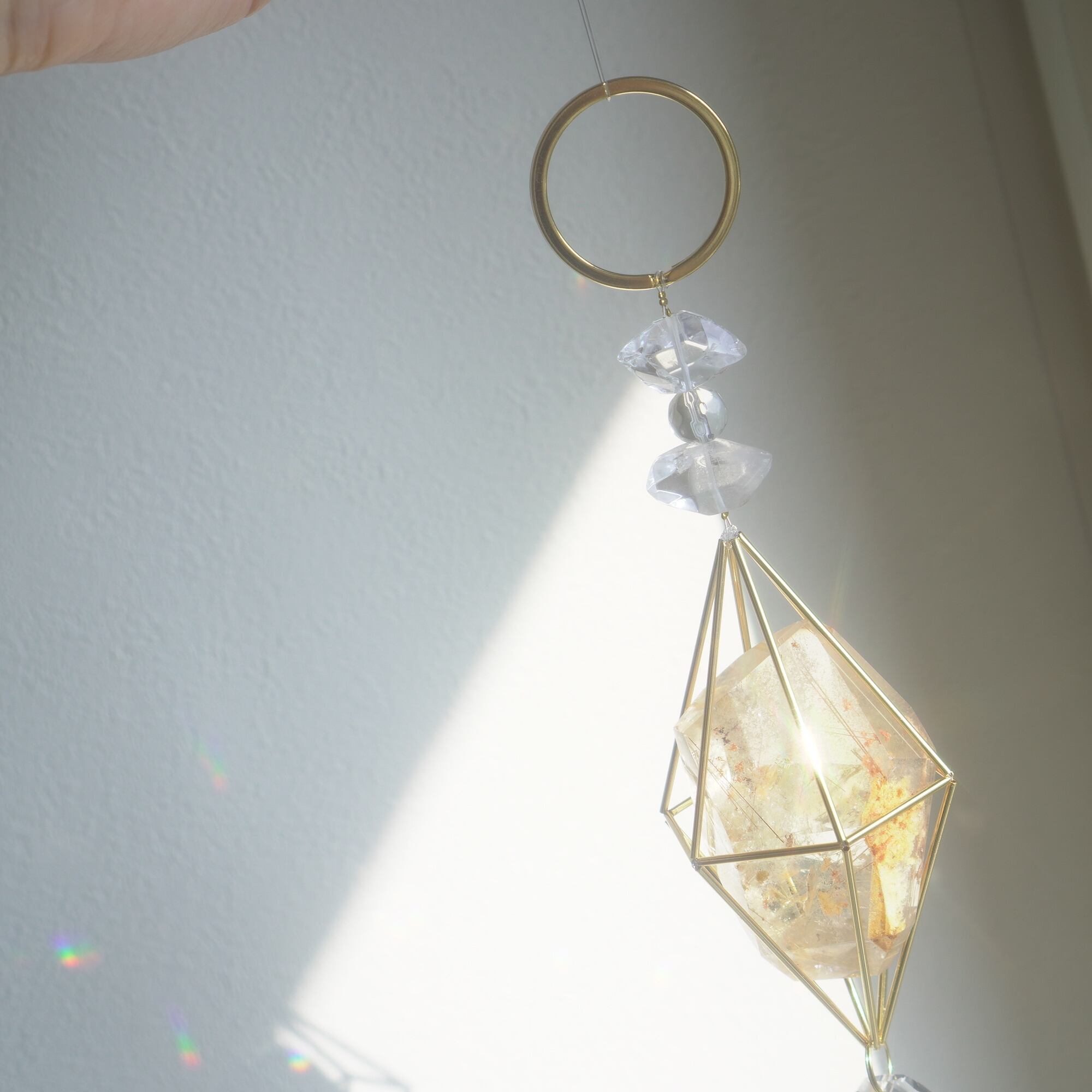 ヒンメリ用のメタルパイプを繋いだ幾何学形体に宿る、特別感のあるタワーカットの天然石。サンキャッチャーになるクリスタルカットのガラスボールやキラキラ輝くメタルパーツを組み合わせ、直射日光を浴びた際、キラキラと輝きながらたくさんの虹色の光がお部屋に広がります。