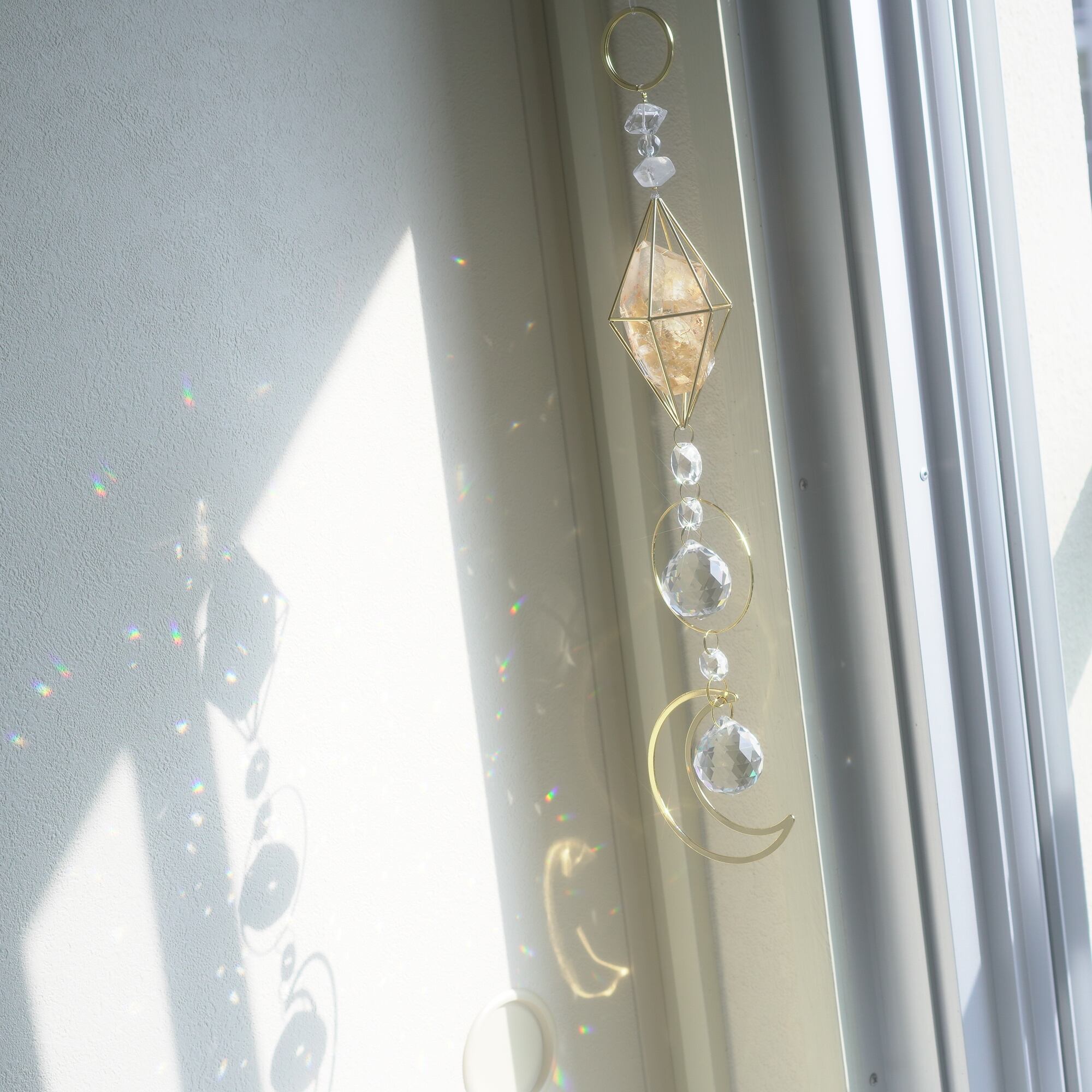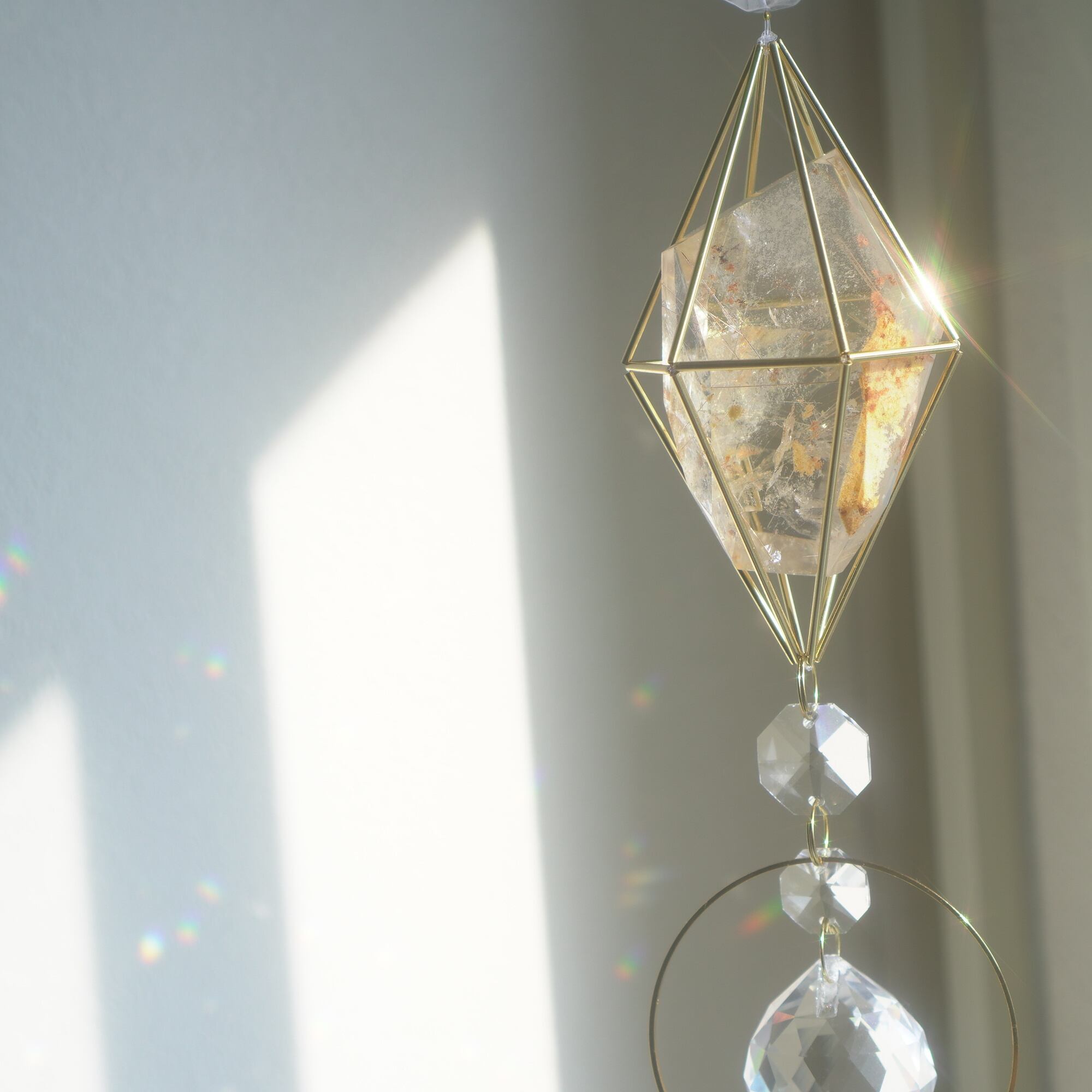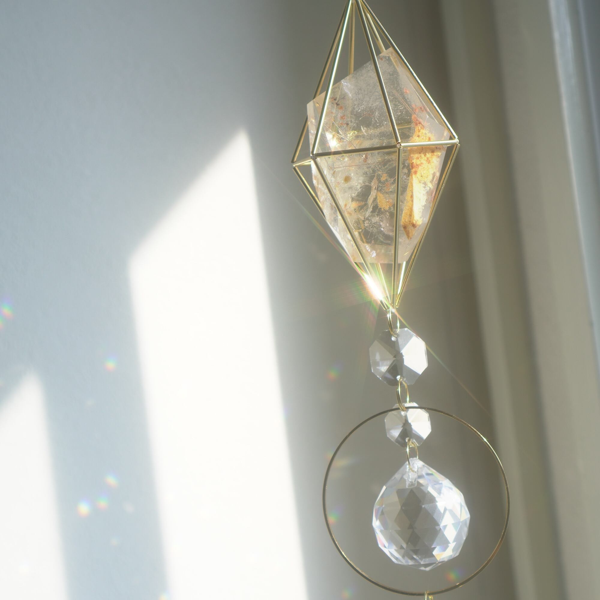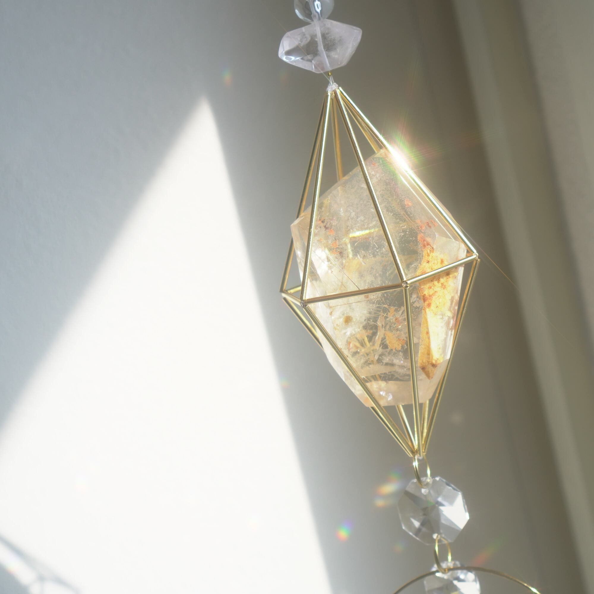 ヒンメリ用のメタルパイプを繋いだ幾何学形体に宿る、特別感のあるタワーカットの天然石。サンキャッチャーになるクリスタルカットのガラスボールやキラキラ輝くメタルパーツを組み合わせ、直射日光を浴びた際、キラキラと輝きながらたくさんの虹色の光がお部屋に広がります。
