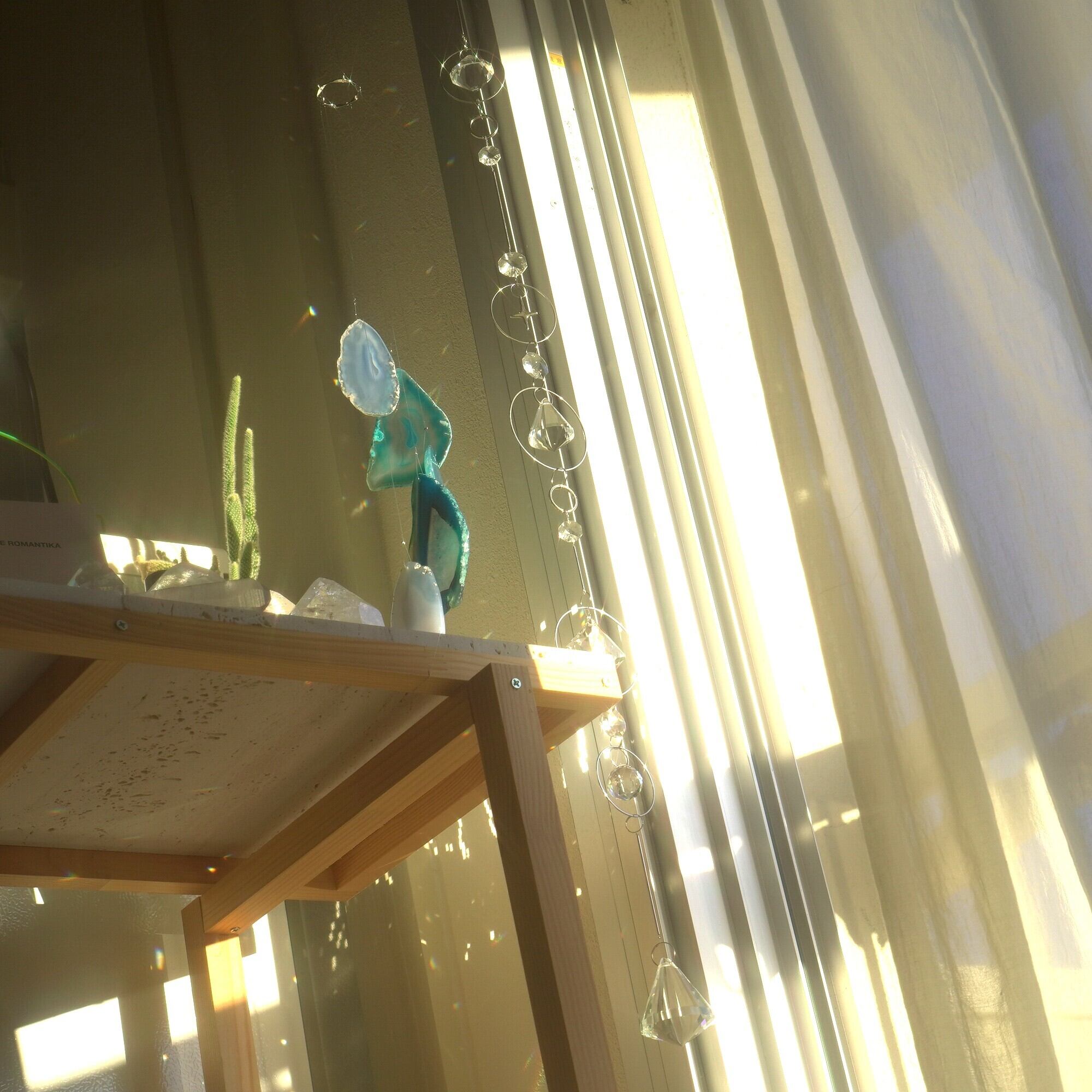 直射日光の射す窓辺であっても一日の中で太陽光の傾きと共に、光の粒を楽しめる時間帯はかなり限られていることが多いですが、こちらのロングサンキャッチャーであれば長さがあり上から下まで均等に多面体ガラスが配置されている為、比較的長時間楽しめることが魅力です。