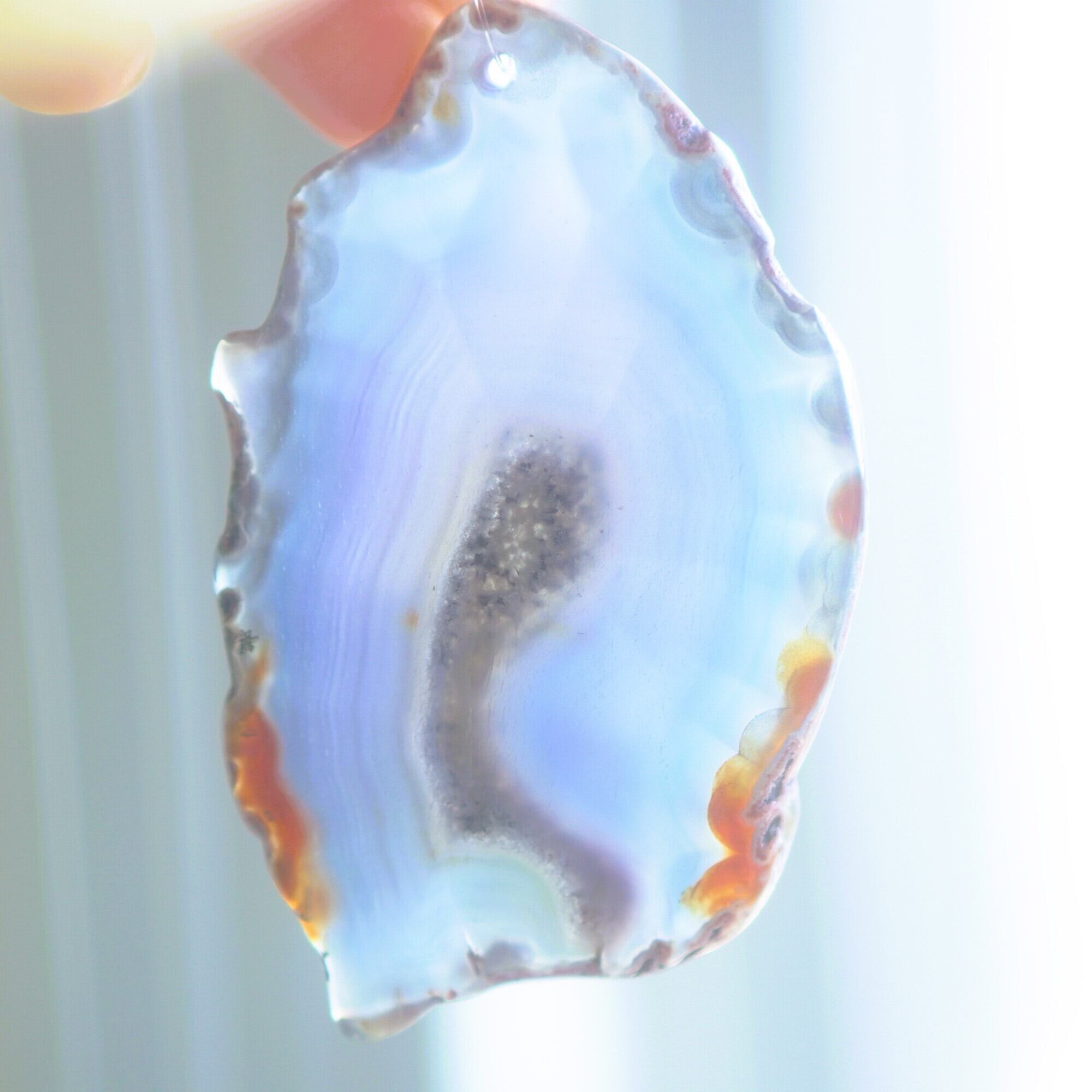 重ねる石同士の側面の加工状態によっても良い音が鳴ったり鳴らなかったり、石の見た目だけで組み合わせを決められないことが難しいポイントでもあるのですが、そんな中、たくさんの石の中から選ばれた5枚のスライスアゲートから出来上がったチャイムたちは、どこか悠々自適に空を泳ぐ妖精のようでもあり、それぞれの音を楽しそうに奏でてくれます。
