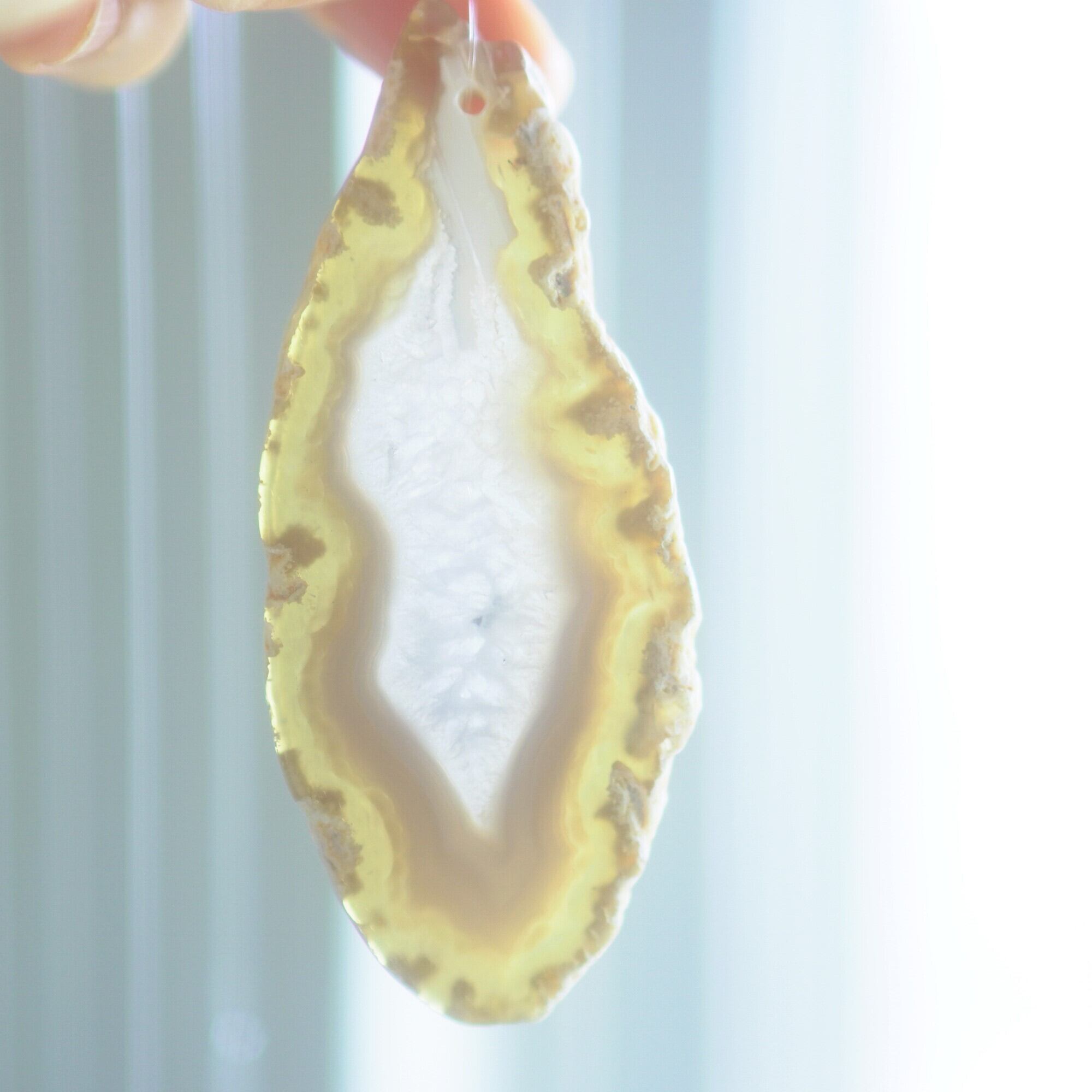 元々の瑪瑙風鈴とは使っている石の大きさや厚みが異なり、こちらのものはそれ同士重ねるだけでは特別音が鳴らない厚さのスライスアゲートを使用しているのですが、間に2本、細長い形状のアゲートを挟むことによって音が鳴る仕組みになっています。(もう少し変則的な組み合わせ方で音が鳴っていることもあります)