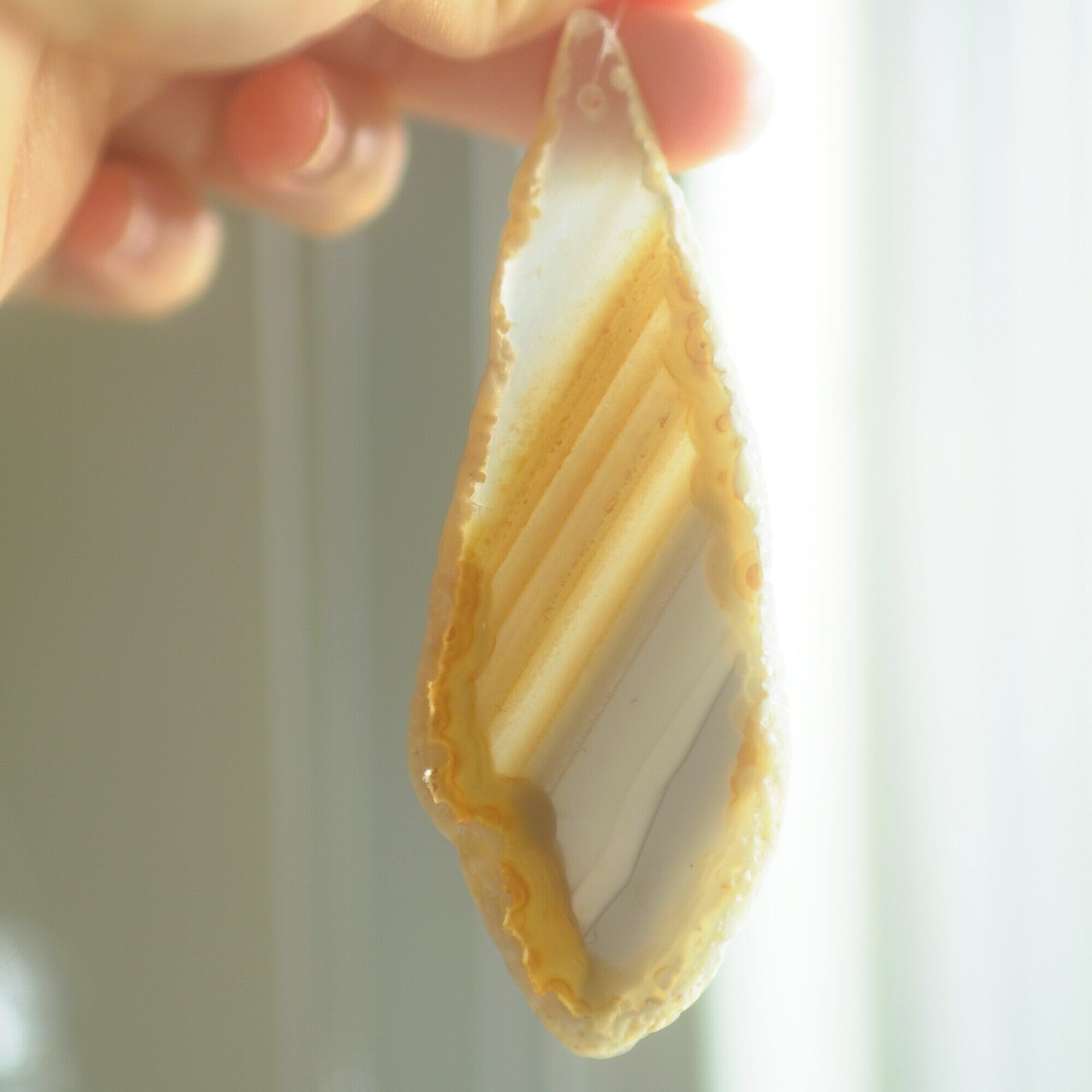 重ねる石同士の側面の加工状態によっても良い音が鳴ったり鳴らなかったり、石の見た目だけで組み合わせを決められないことが難しいポイントでもあるのですが、そんな中、たくさんの石の中から選ばれた5枚のスライスアゲートから出来上がったチャイムたちは、どこか悠々自適に空を泳ぐ妖精のようでもあり、それぞれの音を楽しそうに奏でてくれます。