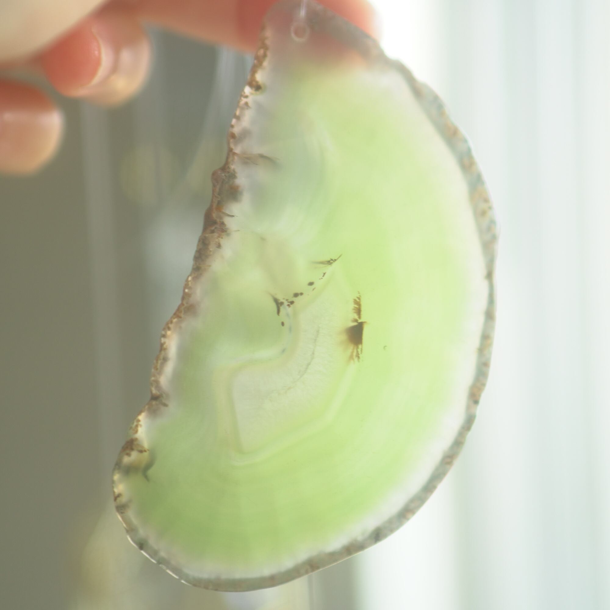 重ねる石同士の側面の加工状態によっても良い音が鳴ったり鳴らなかったり、石の見た目だけで組み合わせを決められないことが難しいポイントでもあるのですが、そんな中、たくさんの石の中から選ばれた5枚のスライスアゲートから出来上がったチャイムたちは、どこか悠々自適に空を泳ぐ妖精のようでもあり、それぞれの音を楽しそうに奏でてくれます。