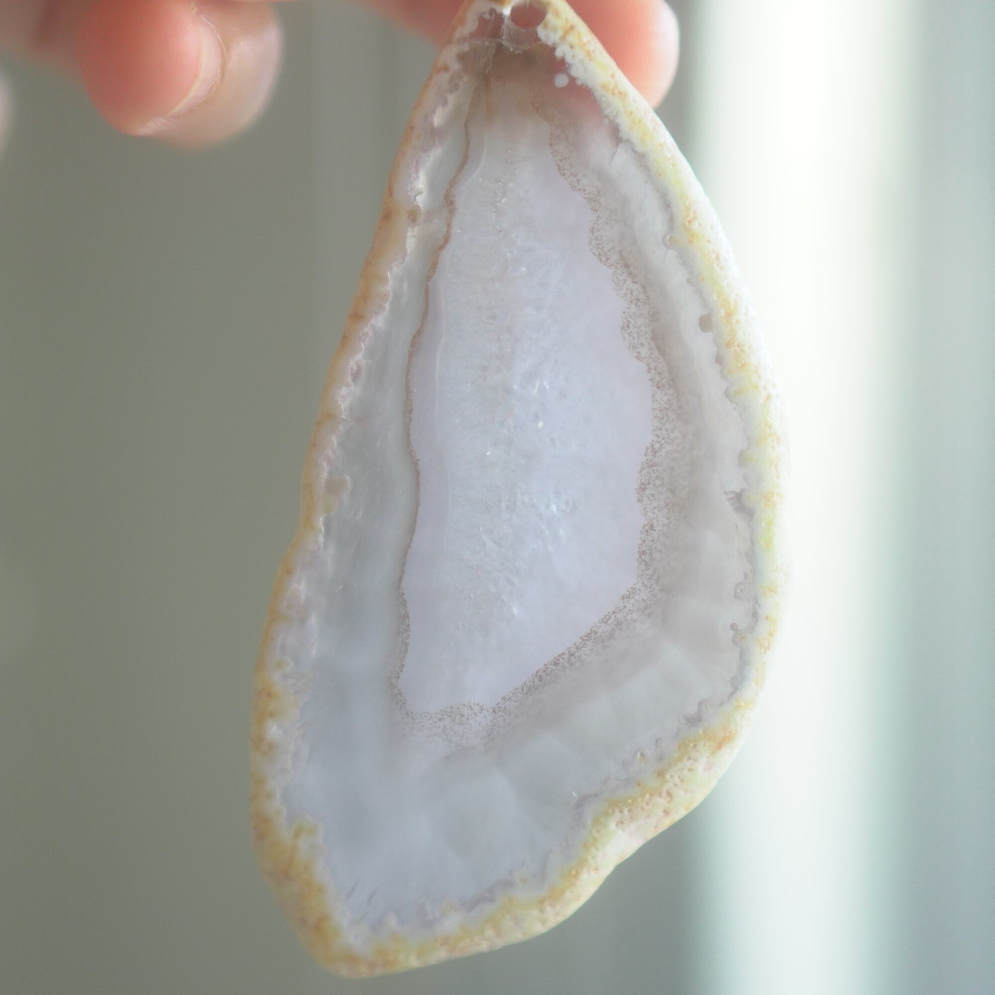 重ねる石同士の側面の加工状態によっても良い音が鳴ったり鳴らなかったり、石の見た目だけで組み合わせを決められないことが難しいポイントでもあるのですが、そんな中、たくさんの石の中から選ばれた5枚のスライスアゲートから出来上がったチャイムたちは、どこか悠々自適に空を泳ぐ妖精のようでもあり、それぞれの音を楽しそうに奏でてくれます。