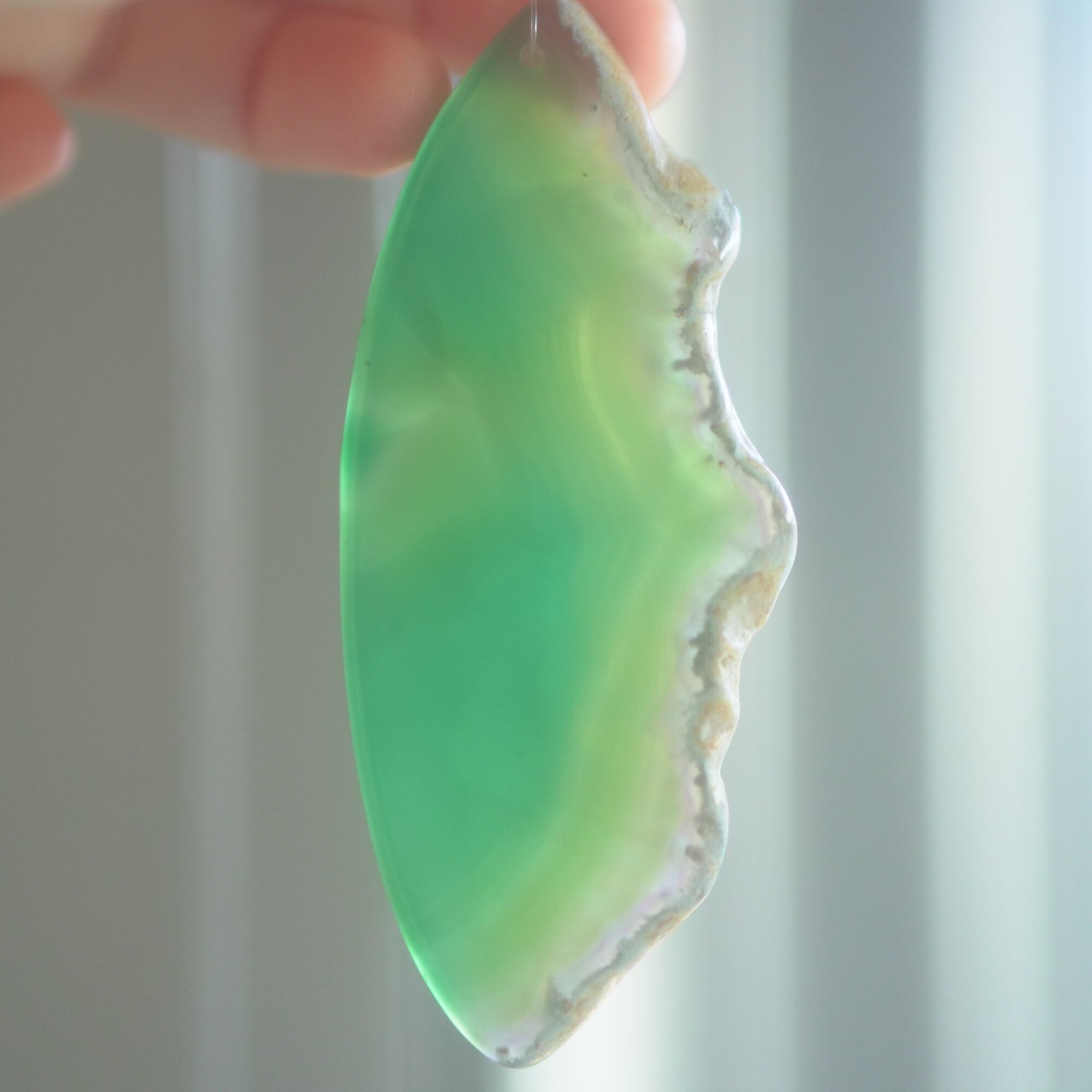 ✧染色の石なので耐光性(光による経年でのカラー変化の耐性)に優れているわけではなくベランダなど一日の中で長時間強い日光に当たるような場所に飾られるのはおすすめしないのですが、陽光に透かした時にだけ真価を発揮する美しさがありますので、是非、時折翳したりして光と一緒にお楽しみいただけたらと思います。特に濃い鮮やかな色など、色変化が気になられる場合は、日光のあまり当たらない場所に飾ってくださいね✧