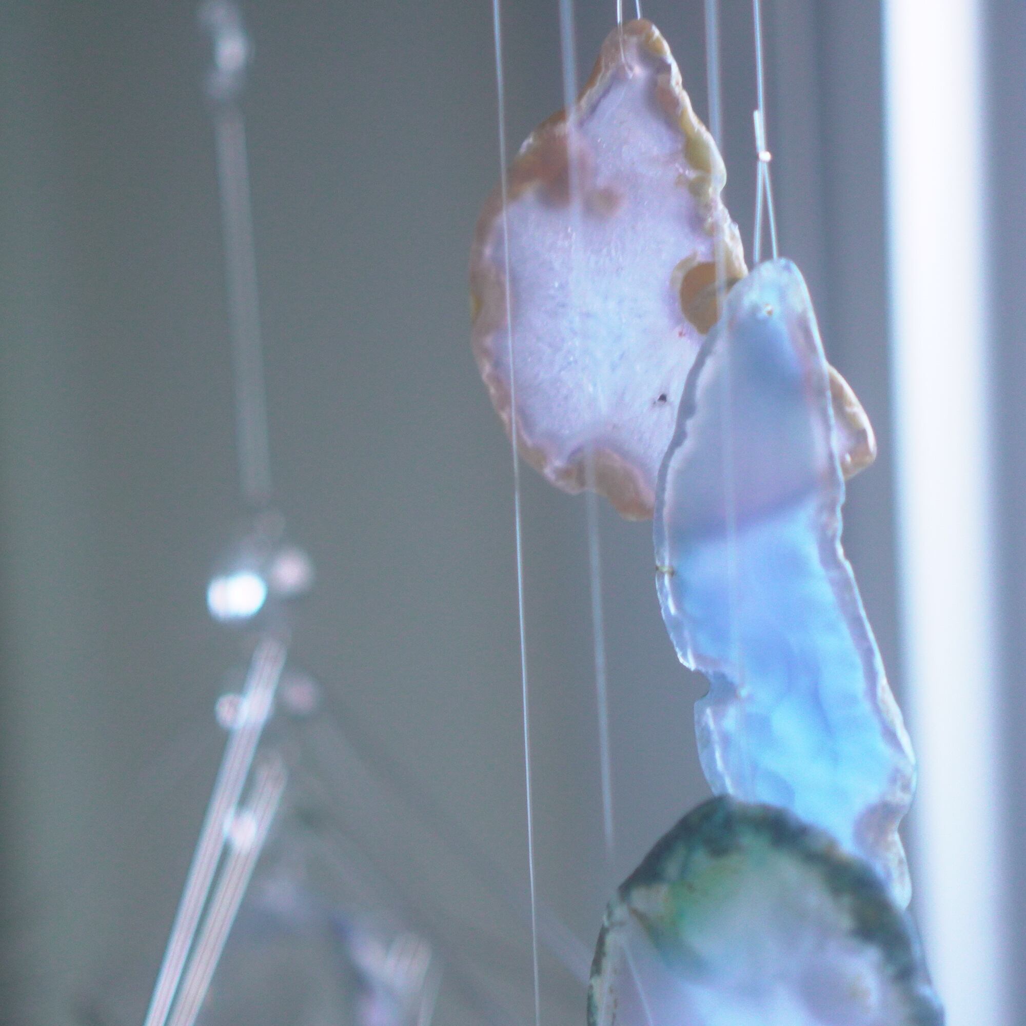 元々の瑪瑙風鈴とは使っている石の大きさや厚みが異なり、こちらのものはそれ同士重ねるだけでは特別音が鳴らない厚さのスライスアゲートを使用しているのですが、間に2本、細長い形状のアゲートを挟むことによって音が鳴る仕組みになっています。(もう少し変則的な組み合わせ方で音が鳴っていることもあります)