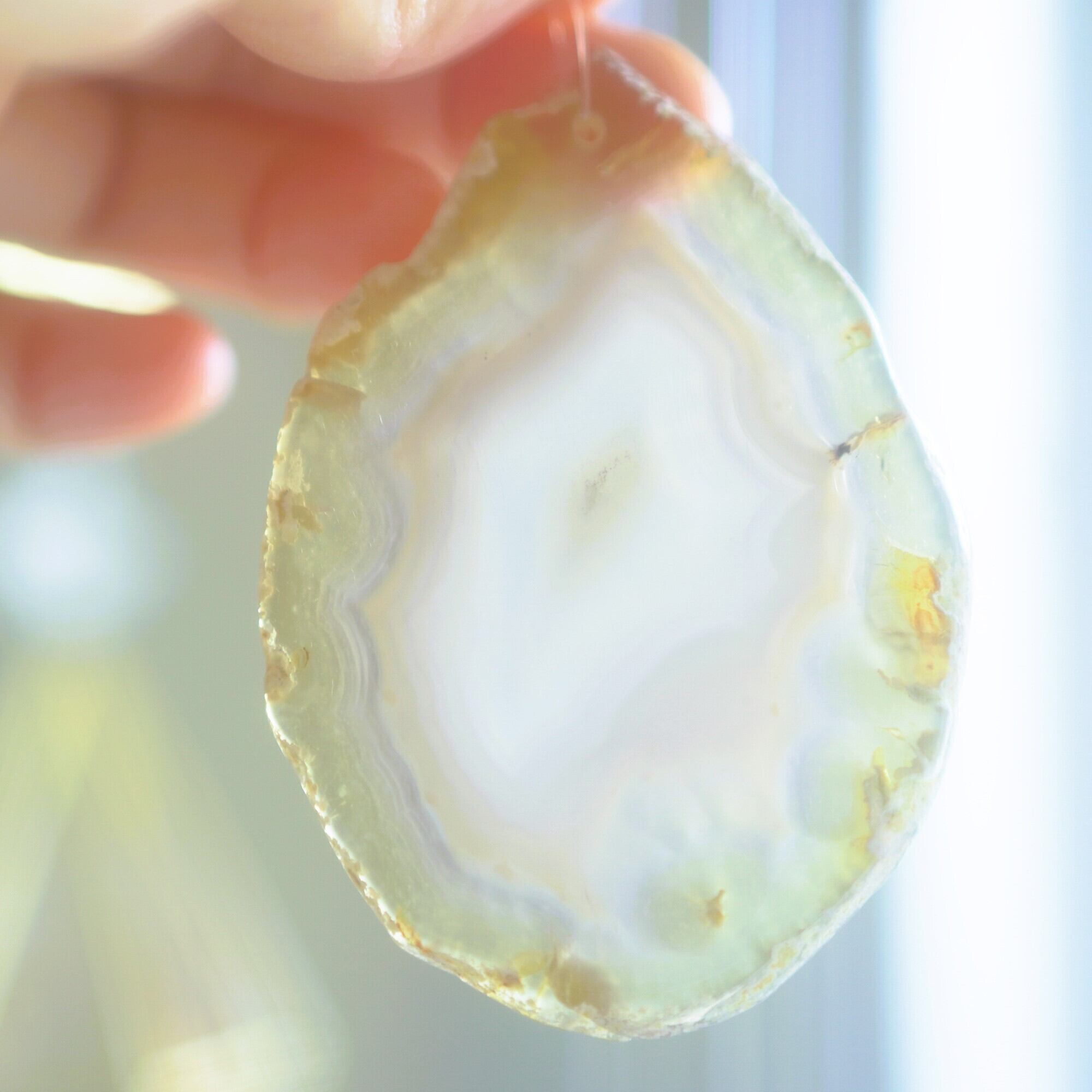 重ねる石同士の側面の加工状態によっても良い音が鳴ったり鳴らなかったり、石の見た目だけで組み合わせを決められないことが難しいポイントでもあるのですが、そんな中、たくさんの石の中から選ばれた5枚のスライスアゲートから出来上がったチャイムたちは、どこか悠々自適に空を泳ぐ妖精のようでもあり、それぞれの音を楽しそうに奏でてくれます。