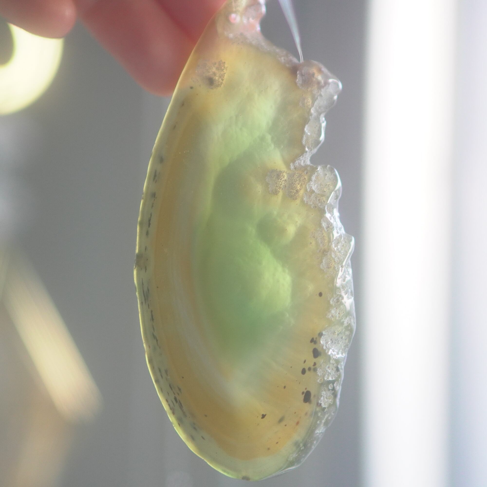 ✧染色の石なので耐光性(光による経年でのカラー変化の耐性)に優れているわけではなくベランダなど一日の中で長時間強い日光に当たるような場所に飾られるのはおすすめしないのですが、陽光に透かした時にだけ真価を発揮する美しさがありますので、是非、時折翳したりして光と一緒にお楽しみいただけたらと思います。特に濃い鮮やかな色など、色変化が気になられる場合は、日光のあまり当たらない場所に飾ってくださいね✧