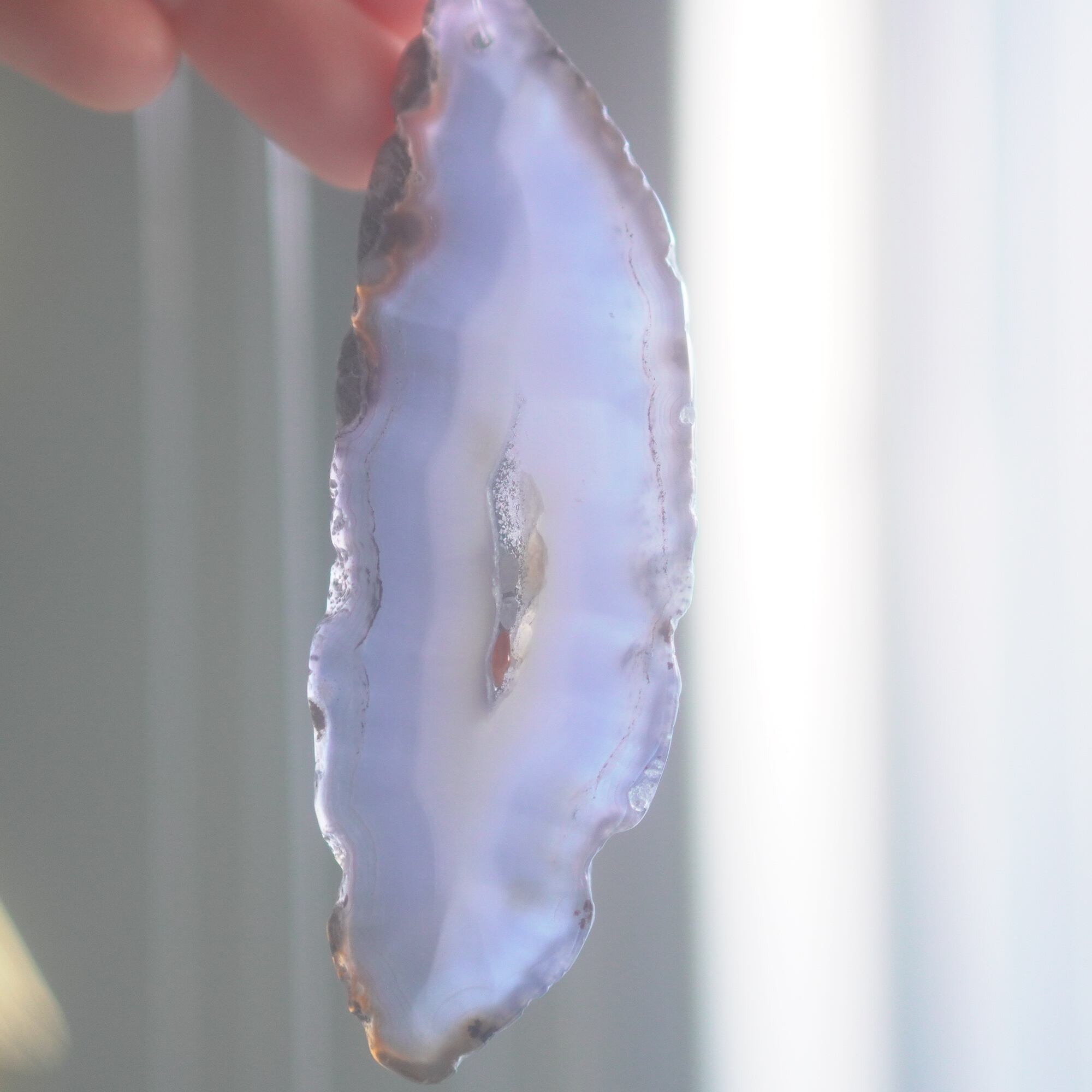 重ねる石同士の側面の加工状態によっても良い音が鳴ったり鳴らなかったり、石の見た目だけで組み合わせを決められないことが難しいポイントでもあるのですが、そんな中、たくさんの石の中から選ばれた5枚のスライスアゲートから出来上がったチャイムたちは、どこか悠々自適に空を泳ぐ妖精のようでもあり、それぞれの音を楽しそうに奏でてくれます。