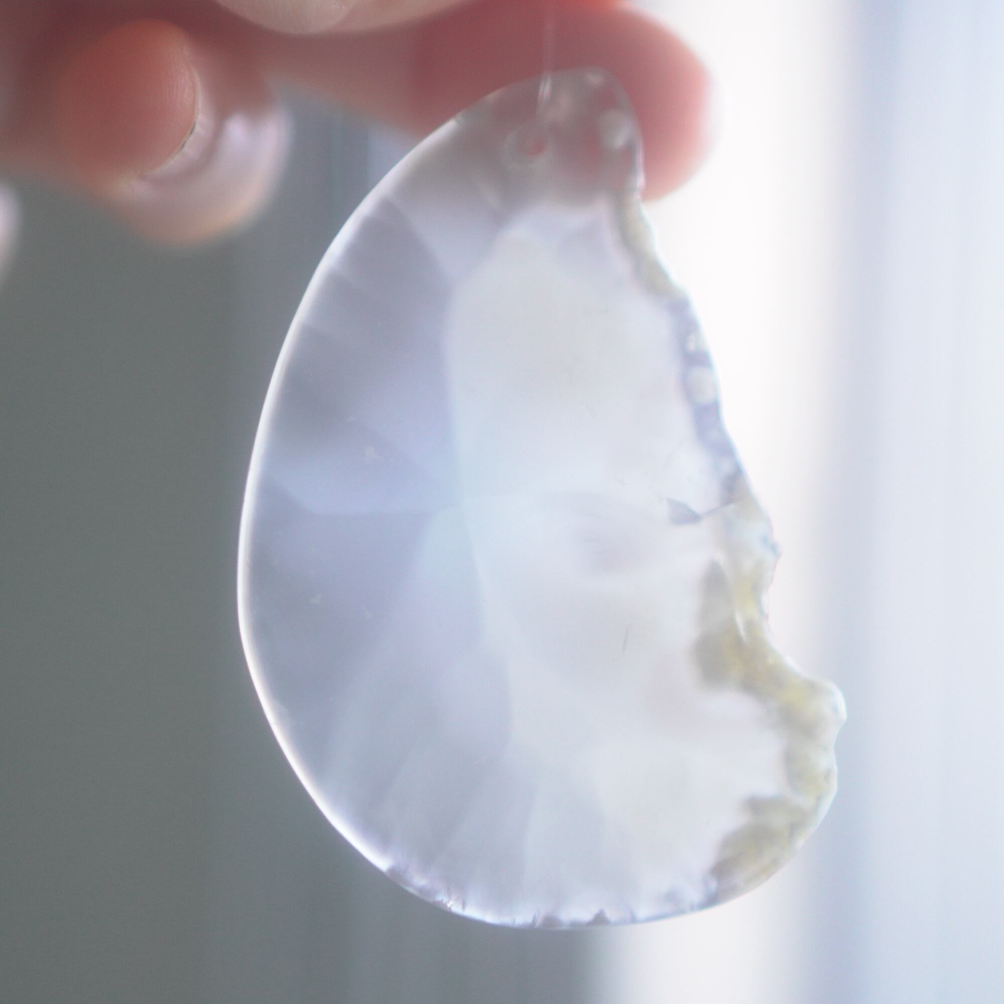 重ねる石同士の側面の加工状態によっても良い音が鳴ったり鳴らなかったり、石の見た目だけで組み合わせを決められないことが難しいポイントでもあるのですが、そんな中、たくさんの石の中から選ばれた5枚のスライスアゲートから出来上がったチャイムたちは、どこか悠々自適に空を泳ぐ妖精のようでもあり、それぞれの音を楽しそうに奏でてくれます。