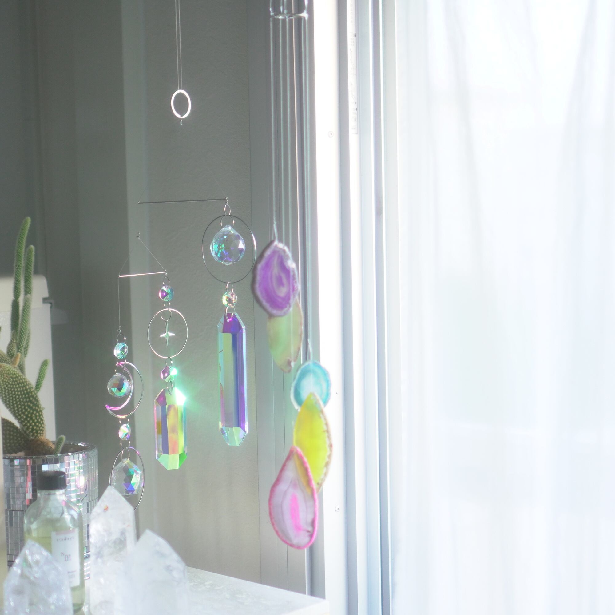 そしてカーテン越しではなく直射日光を当てた際のサンキャッチャーとしてのチャイムも、ピカピカとした美しい光をお部屋の中に運んでくれます。