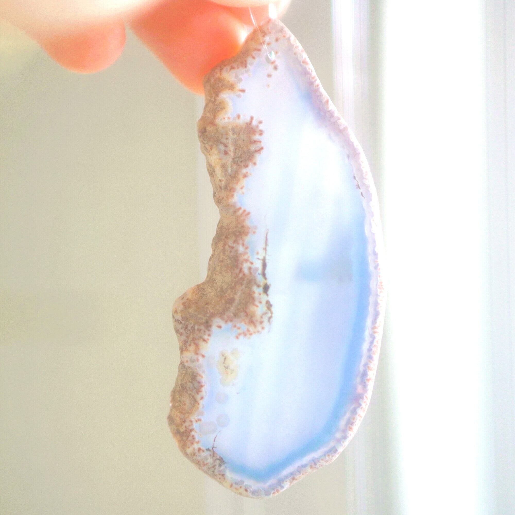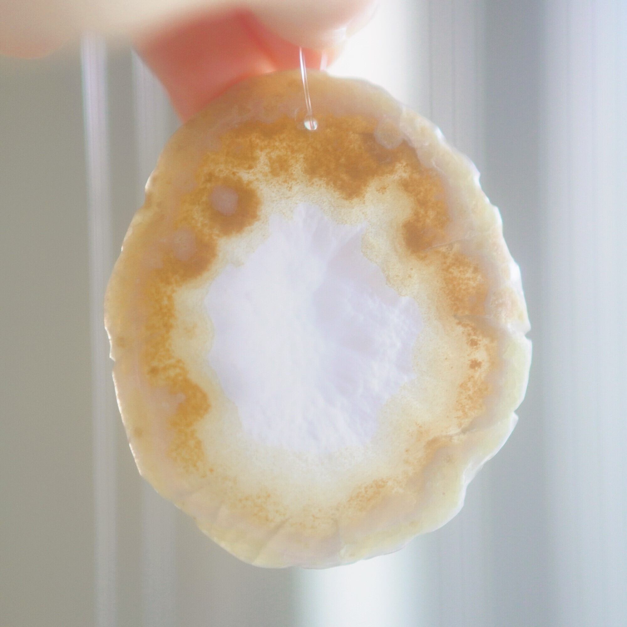 重ねる石同士の側面の加工状態によっても良い音が鳴ったり鳴らなかったり、石の見た目だけで組み合わせを決められないことが難しいポイントでもあるのですが、そんな中、たくさんの石の中から選ばれた5枚のスライスアゲートから出来上がったチャイムたちは、どこか悠々自適に空を泳ぐ妖精のようでもあり、それぞれの音を楽しそうに奏でてくれます。