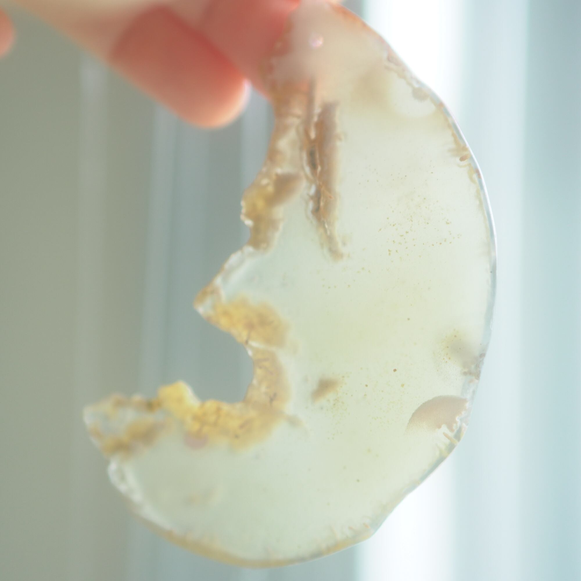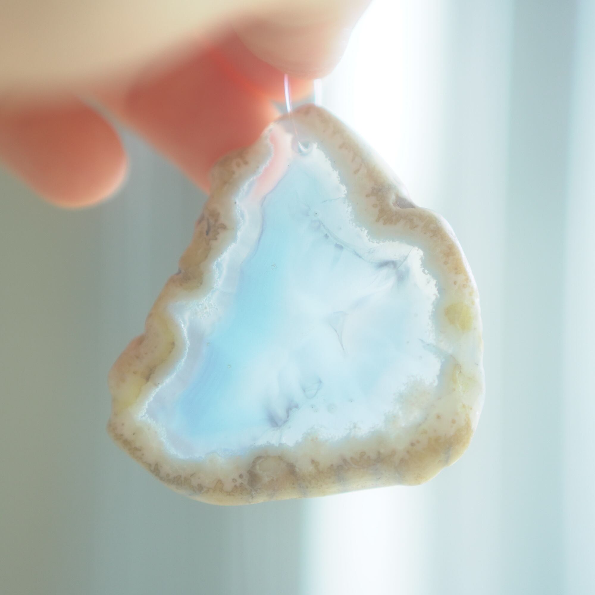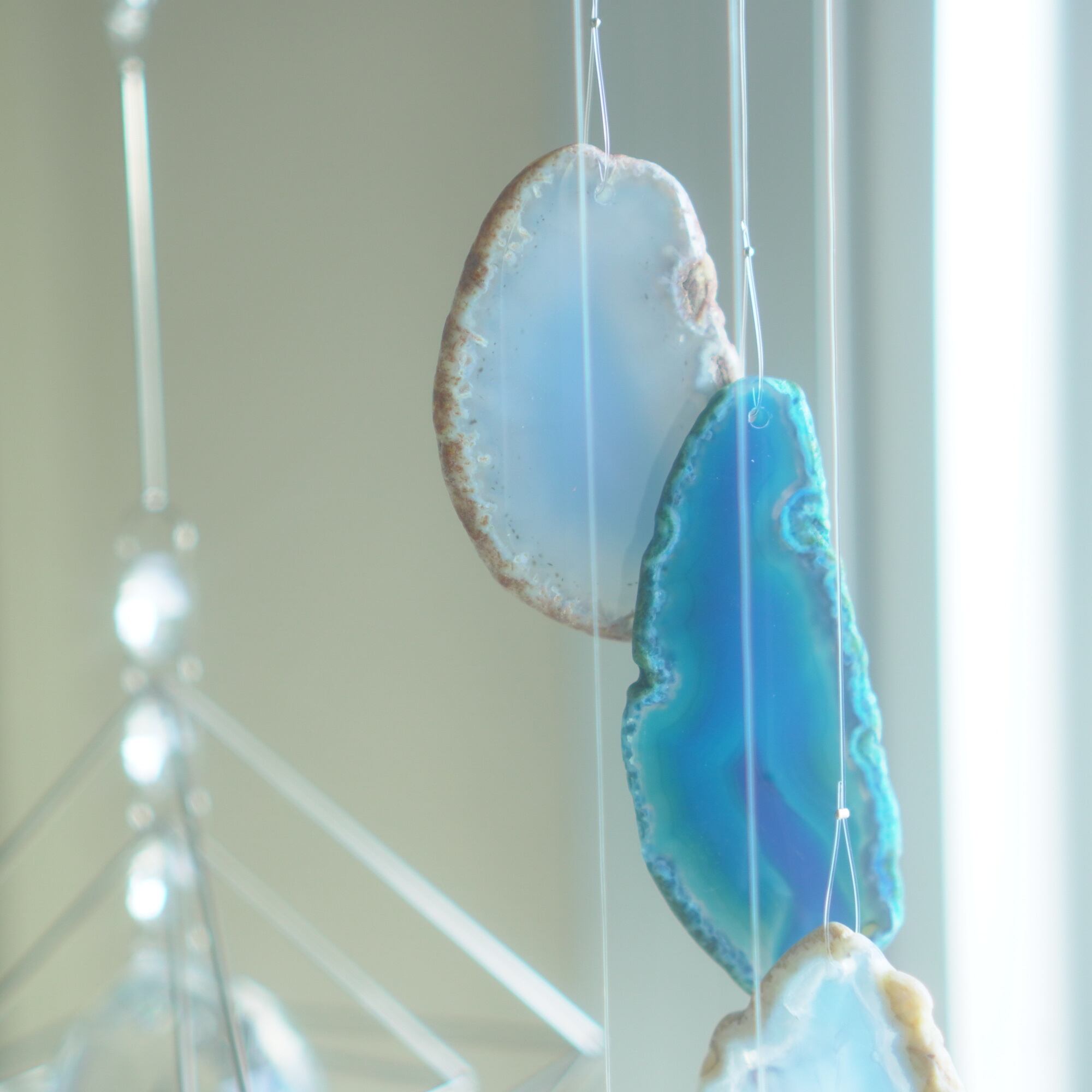 重ねる石同士の側面の加工状態によっても良い音が鳴ったり鳴らなかったり、石の見た目だけで組み合わせを決められないことが難しいポイントでもあるのですが、そんな中、たくさんの石の中から選ばれた5枚のスライスアゲートから出来上がったチャイムたちは、どこか悠々自適に空を泳ぐ妖精のようでもあり、それぞれの音を楽しそうに奏でてくれます。