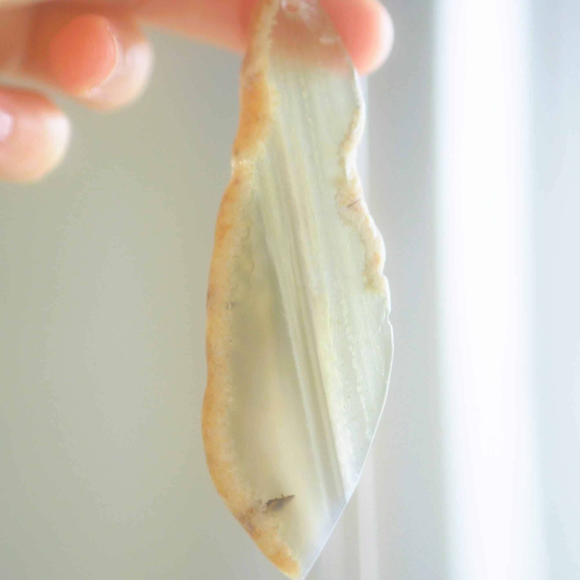 重ねる石同士の側面の加工状態によっても良い音が鳴ったり鳴らなかったり、石の見た目だけで組み合わせを決められないことが難しいポイントでもあるのですが、そんな中、たくさんの石の中から選ばれた5枚のスライスアゲートから出来上がったチャイムたちは、どこか悠々自適に空を泳ぐ妖精のようでもあり、それぞれの音を楽しそうに奏でてくれます。