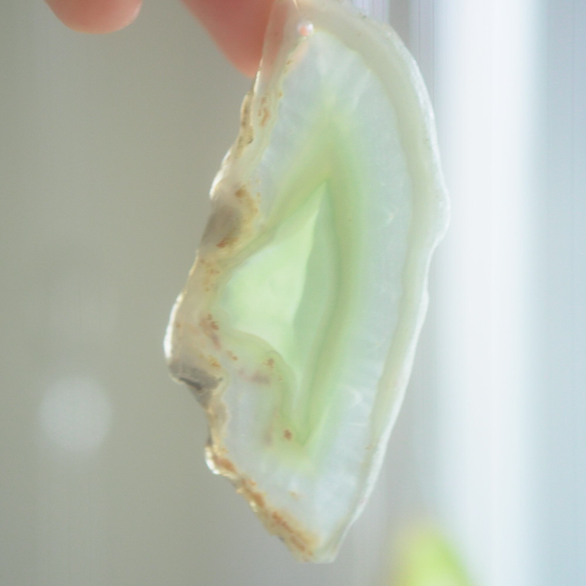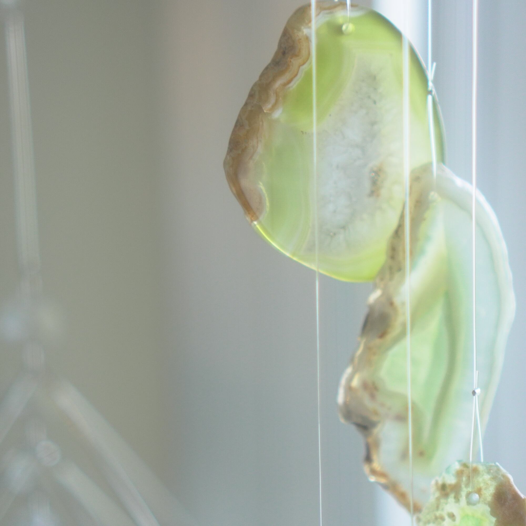 重ねる石同士の側面の加工状態によっても良い音が鳴ったり鳴らなかったり、石の見た目だけで組み合わせを決められないことが難しいポイントでもあるのですが、そんな中、たくさんの石の中から選ばれた5枚のスライスアゲートから出来上がったチャイムたちは、どこか悠々自適に空を泳ぐ妖精のようでもあり、それぞれの音を楽しそうに奏でてくれます。
