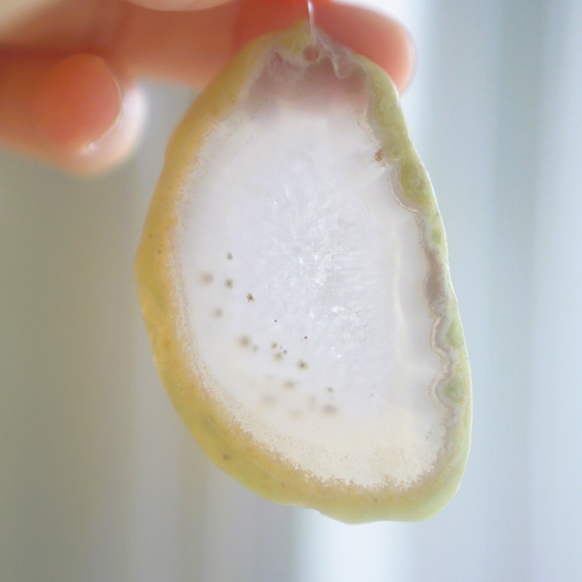 重ねる石同士の側面の加工状態によっても良い音が鳴ったり鳴らなかったり、石の見た目だけで組み合わせを決められないことが難しいポイントでもあるのですが、そんな中、たくさんの石の中から選ばれた5枚のスライスアゲートから出来上がったチャイムたちは、どこか悠々自適に空を泳ぐ妖精のようでもあり、それぞれの音を楽しそうに奏でてくれます。